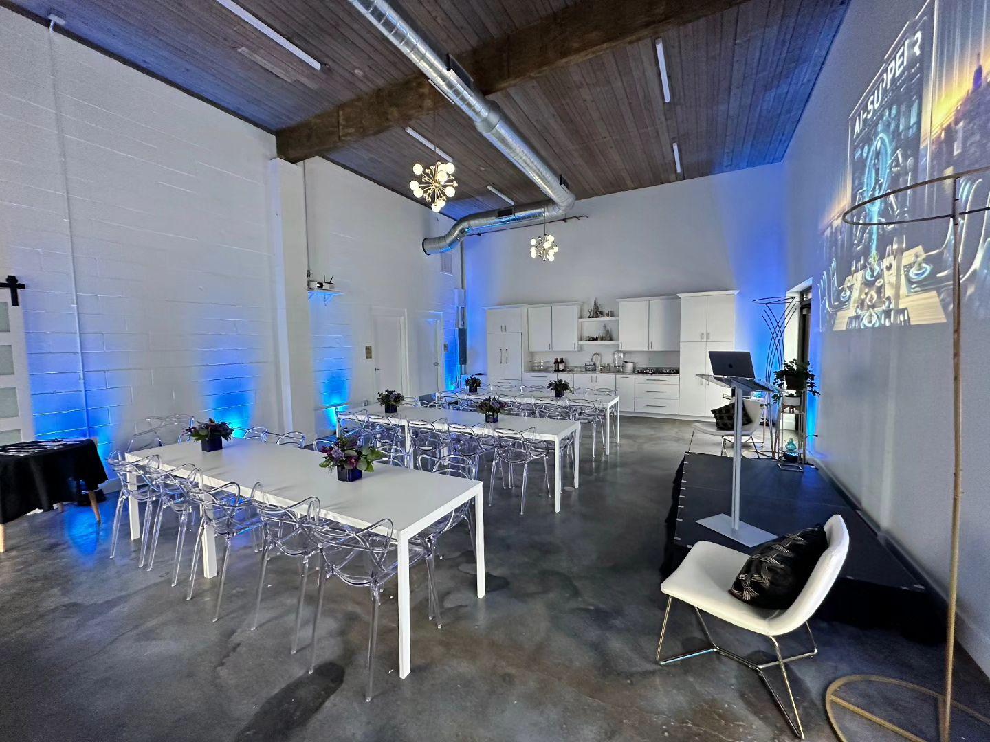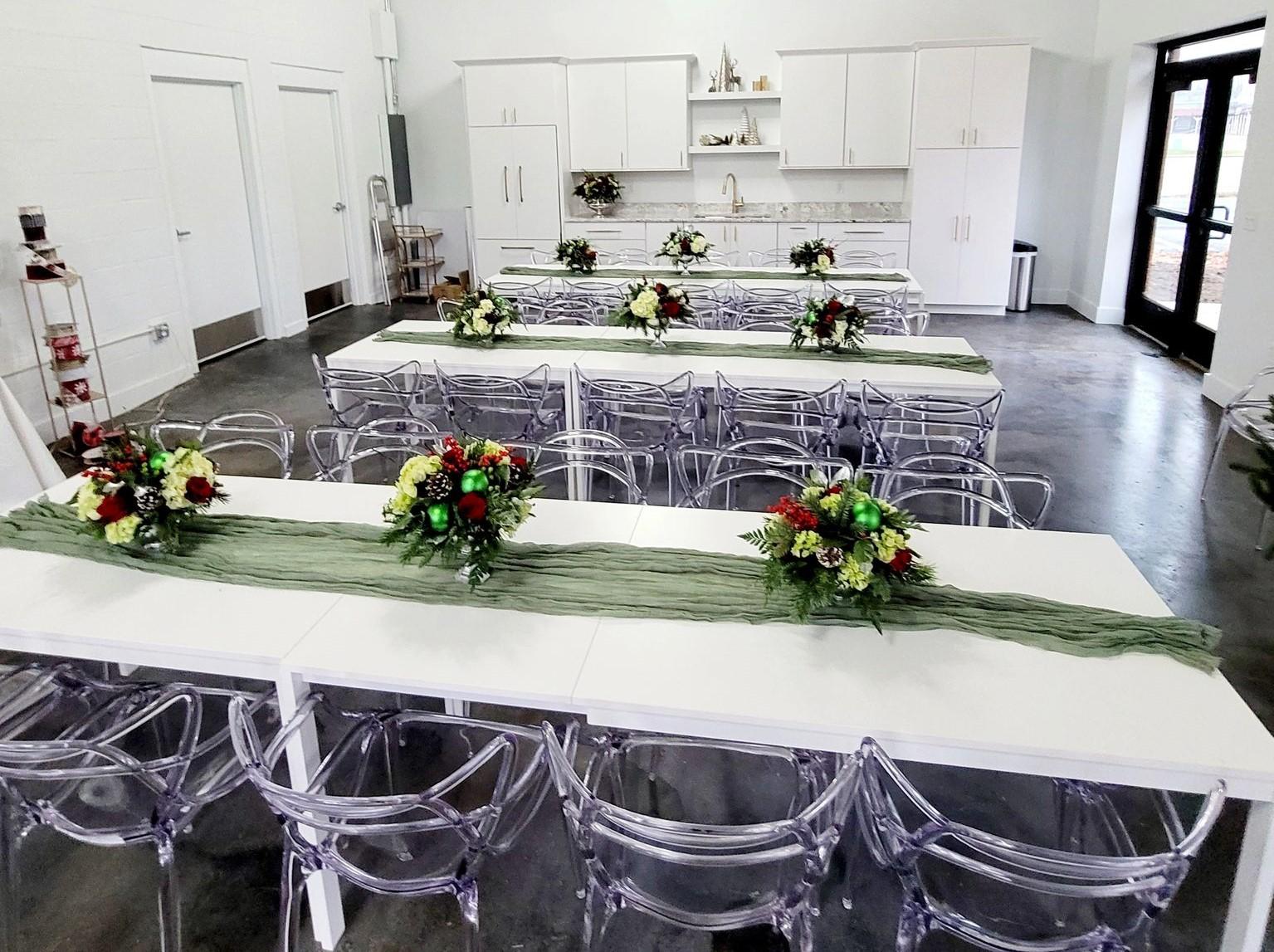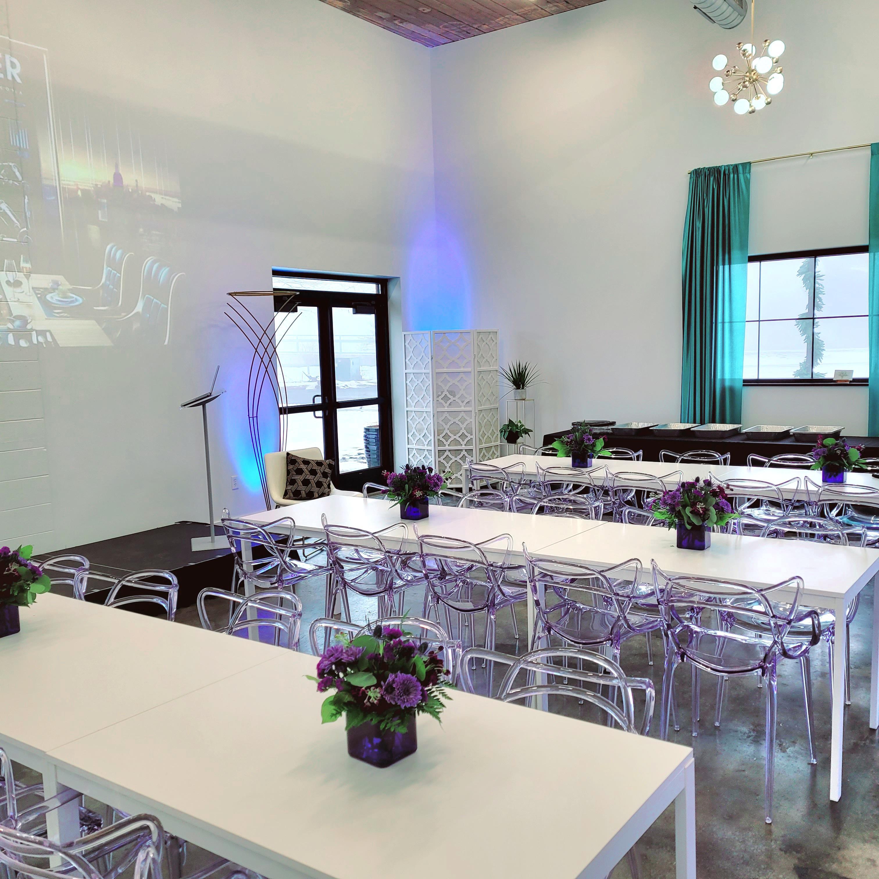 We offer a variety of amenities to make your event a success. From state-of-the-art audio and visual equipment to customizable lighting, we have everything you need to create the perfect atmosphere for your event. Complimentary rental items include table runners and balloon/floral stands. The room has a refrigerator with freezer, white tables, ghost chairs and two handicap accessible bathrooms.