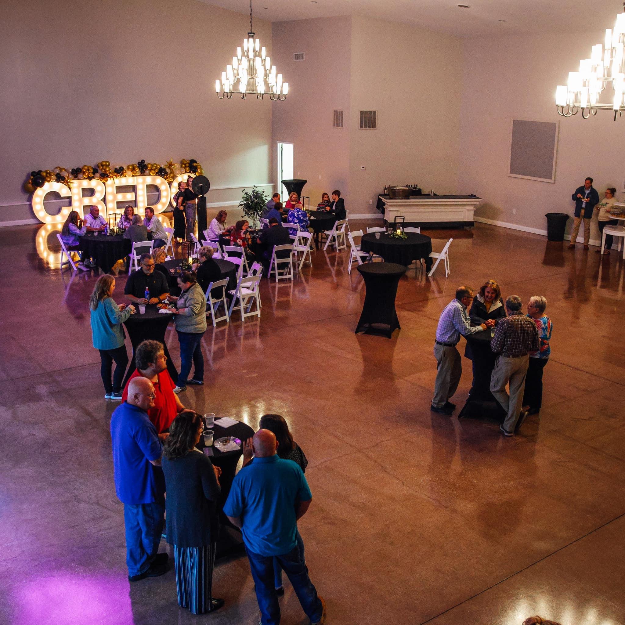 Discover the perfect venue for your event at Credo Pointe Event Center! Ideal for weddings, birthdays, and corporate events, our state-of-the-art facilities and professional staff ensure a seamless and memorable experience. Step into luxury in our Large Entry Foyer with a dazzling chandelier and cozy sitting area, leading to the Grand Event Room. Indulge in the elegance of our Large Bridal Suite, complete with a 5-station vanity, snack bar, private dressing room, and spacious seating area. Additional storage available in our dedicated Storage Room. The heart of the celebration is our Grand Event Room, accommodating up to 290 guests with grand chandeliers and a 25-foot vaulted ceiling. Culinary perfection awaits in our Catering Kitchen, fully equipped for your feast. Tables, chairs, and setup are stress-free with Credo Pointe staff support.