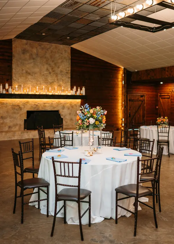 This space features 7,000 square feet of A/C and heated space. 60" round tables, farmhouse tables, and Mahogony Chiavari chairs fill the space. Ample space allows for guests to move freely, even when seated at capacity, and allows for a large dance floor. A built in bar, beverage station, 14'x20' stage, wood burning fireplace, prep kitchen, and buffet area complete the space. A covered porch is attached for guests to easily enter and exit the reception space.