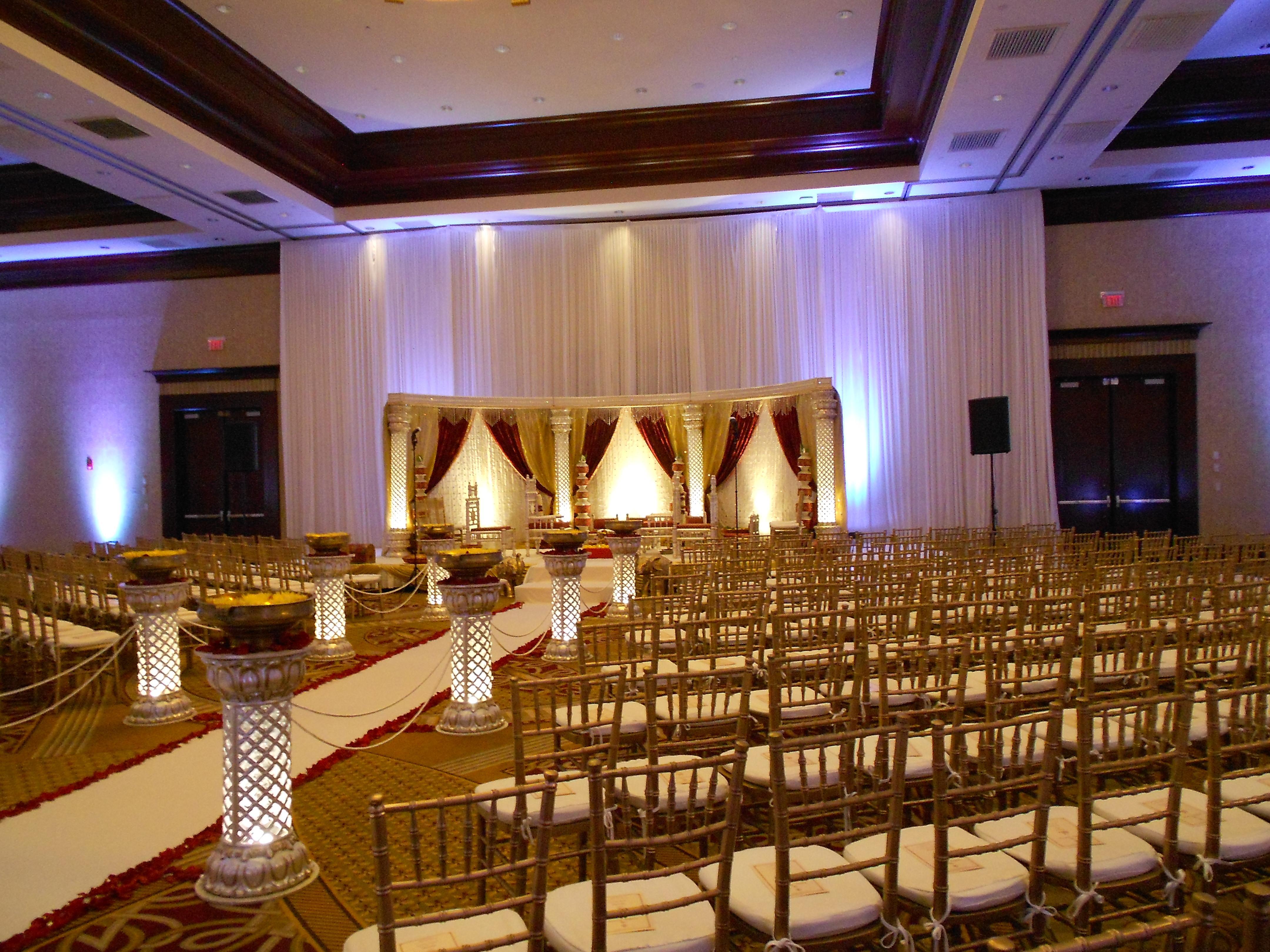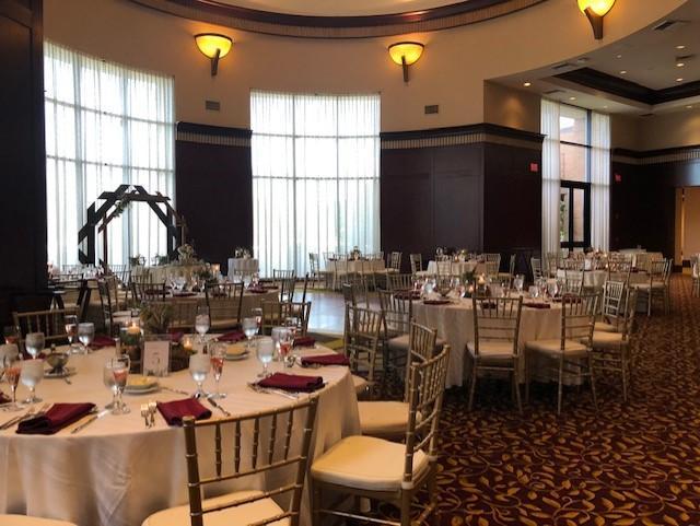 Our Grand Ballroom features 21 foot ceilings, wrap-around foyer, and is a beautiful space that can fit up to 500 guests. The deep wood, maroon tones and large chandeliers offer a classic and elegant space for any event.