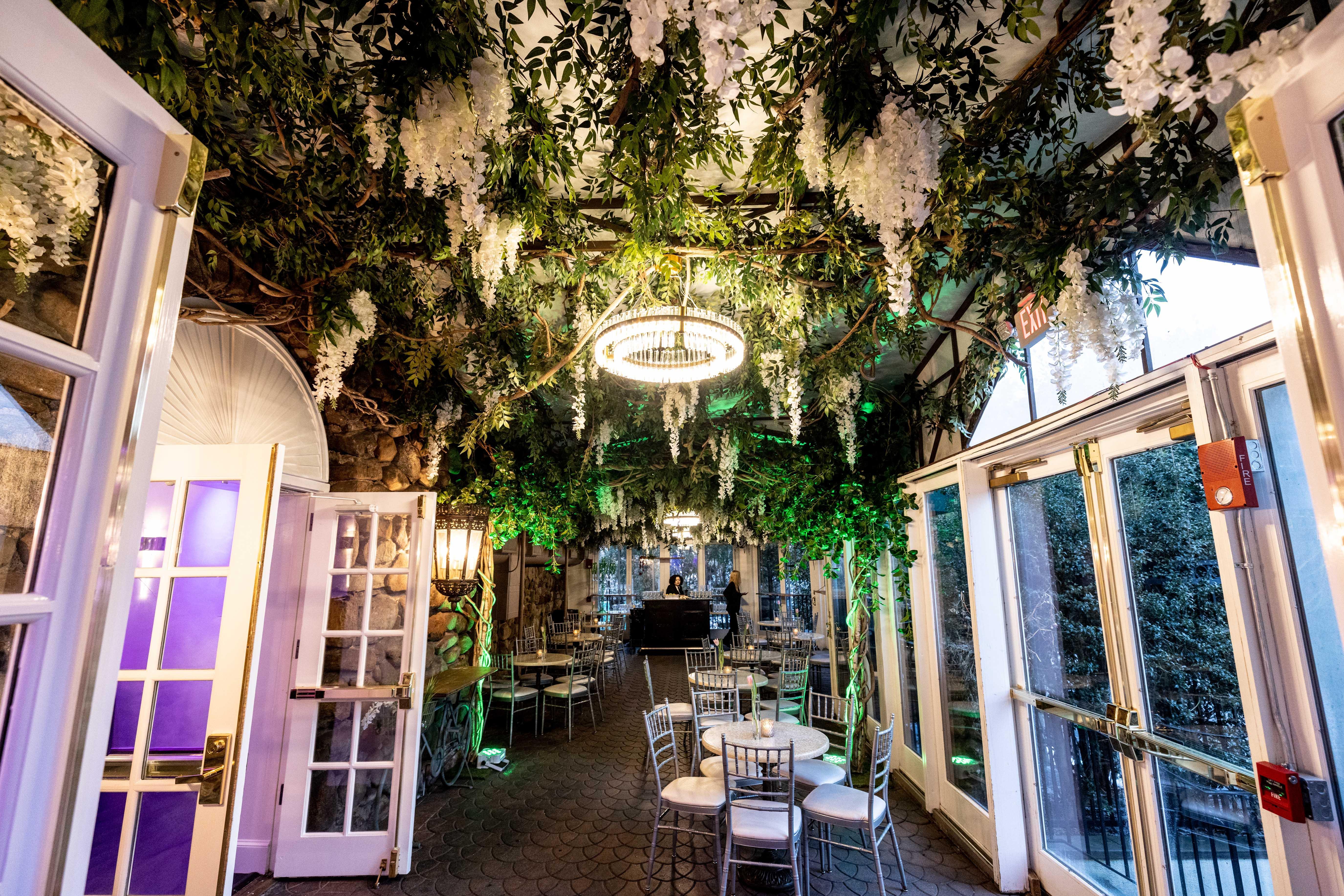 Glittering crystal chandeliers adorn the ceilings and walls of this stunning, 5,000-square-foot space with a capacity for up to 350 guests for dinner and dancing. The glamorous, open room showcasing a gold-detailed ceiling, ornate columns along the walls, a large and round wooden dance floor and curtain-dressed glass windows overlooking the garden can hold its own without any additional décor, yet looks fabulous with custom florals for your occasion. A Juliet balcony overlooks the scene.