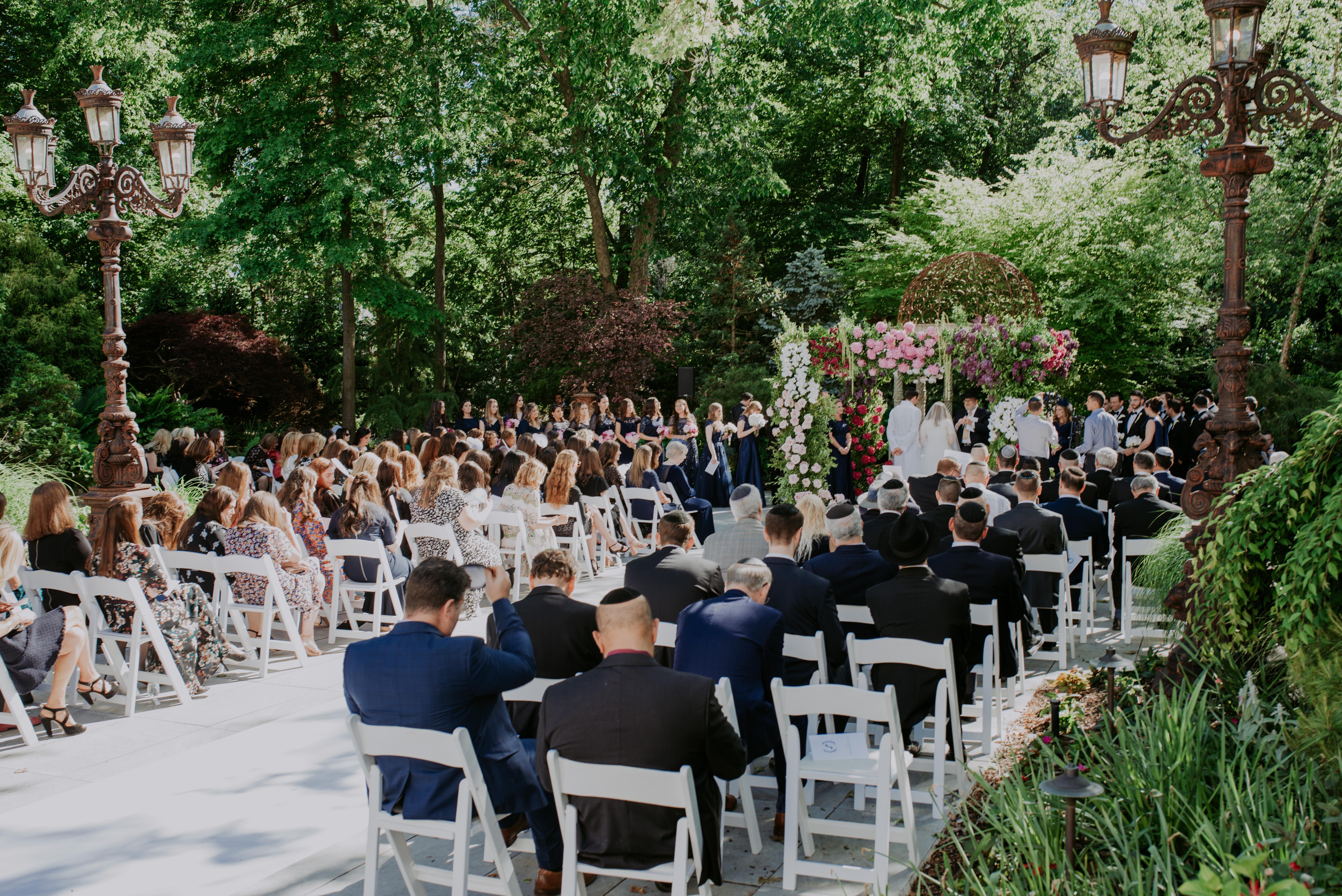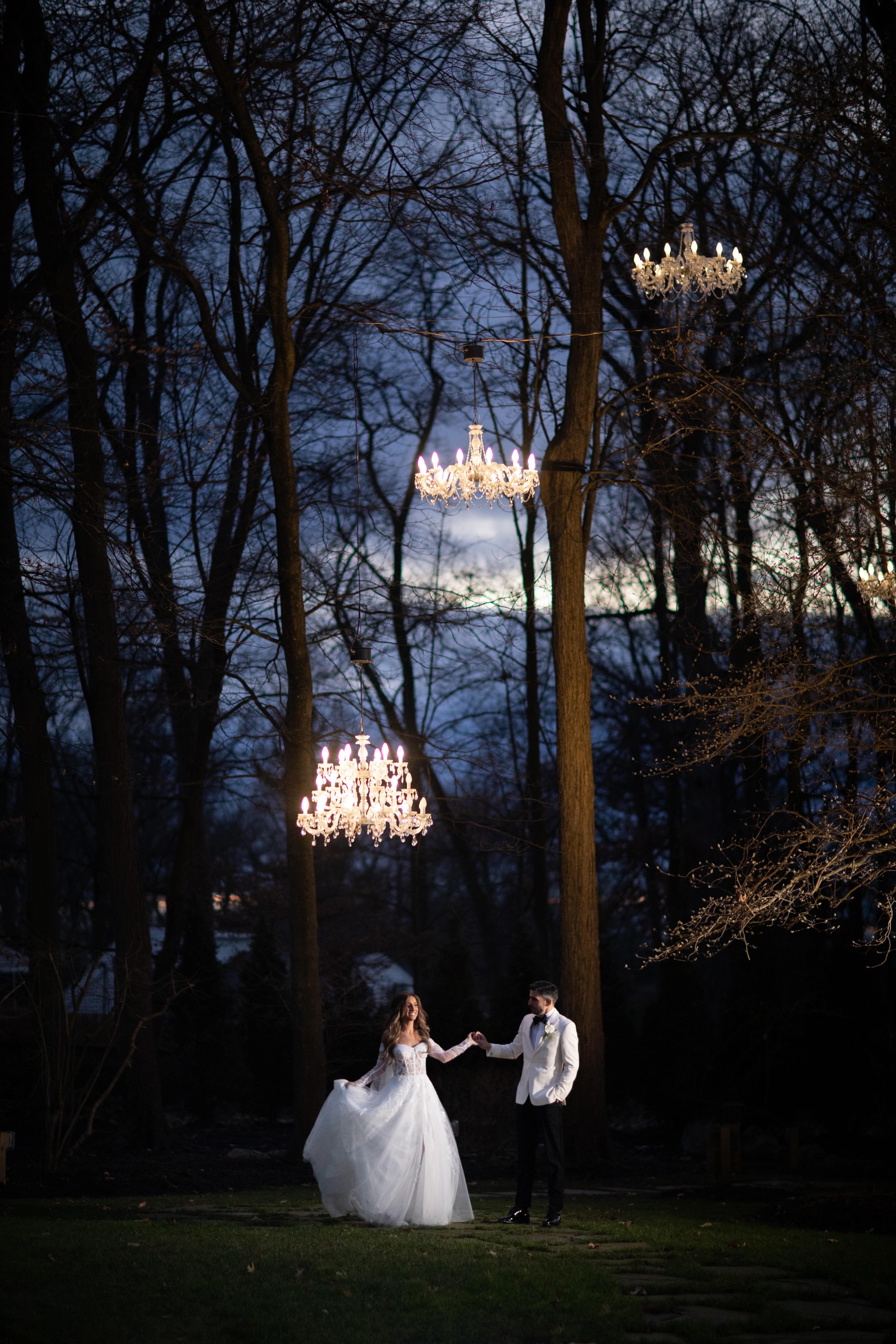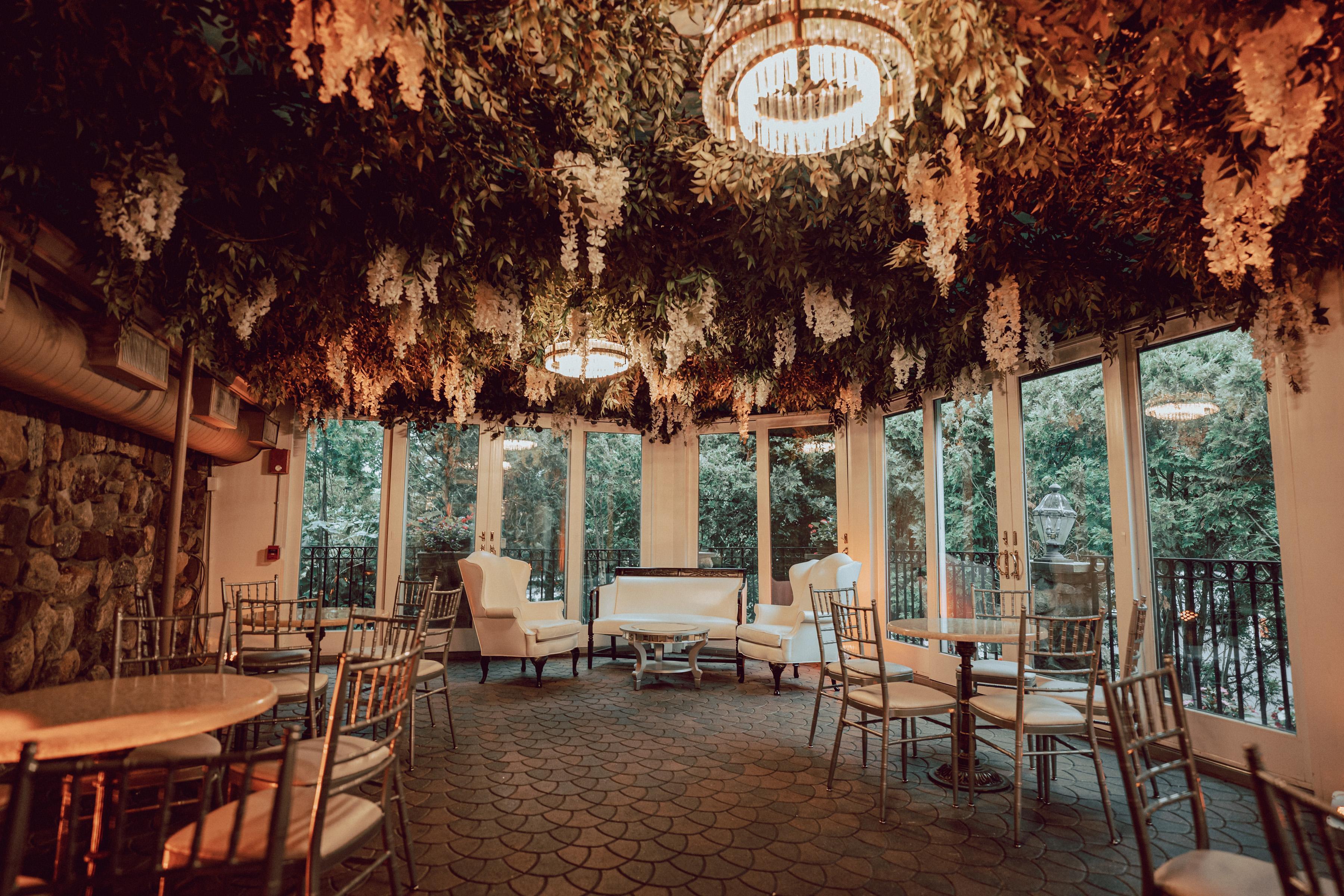 The gazebo serves as a focal point or ceremony space as well as iron street lamps imported from Italy. In the spring, romance often blossoms here along with its fragrant flowers; in the summer, late sunsets make a gorgeous background for evening events; in autumn, the brilliant, jewel-toned colors of fall foliage become a vibrant setting for great photo opportunities; and in winter, the gardens turn into a winter wonderland with glistening icicles that mimic the crystal chandeliers inside.