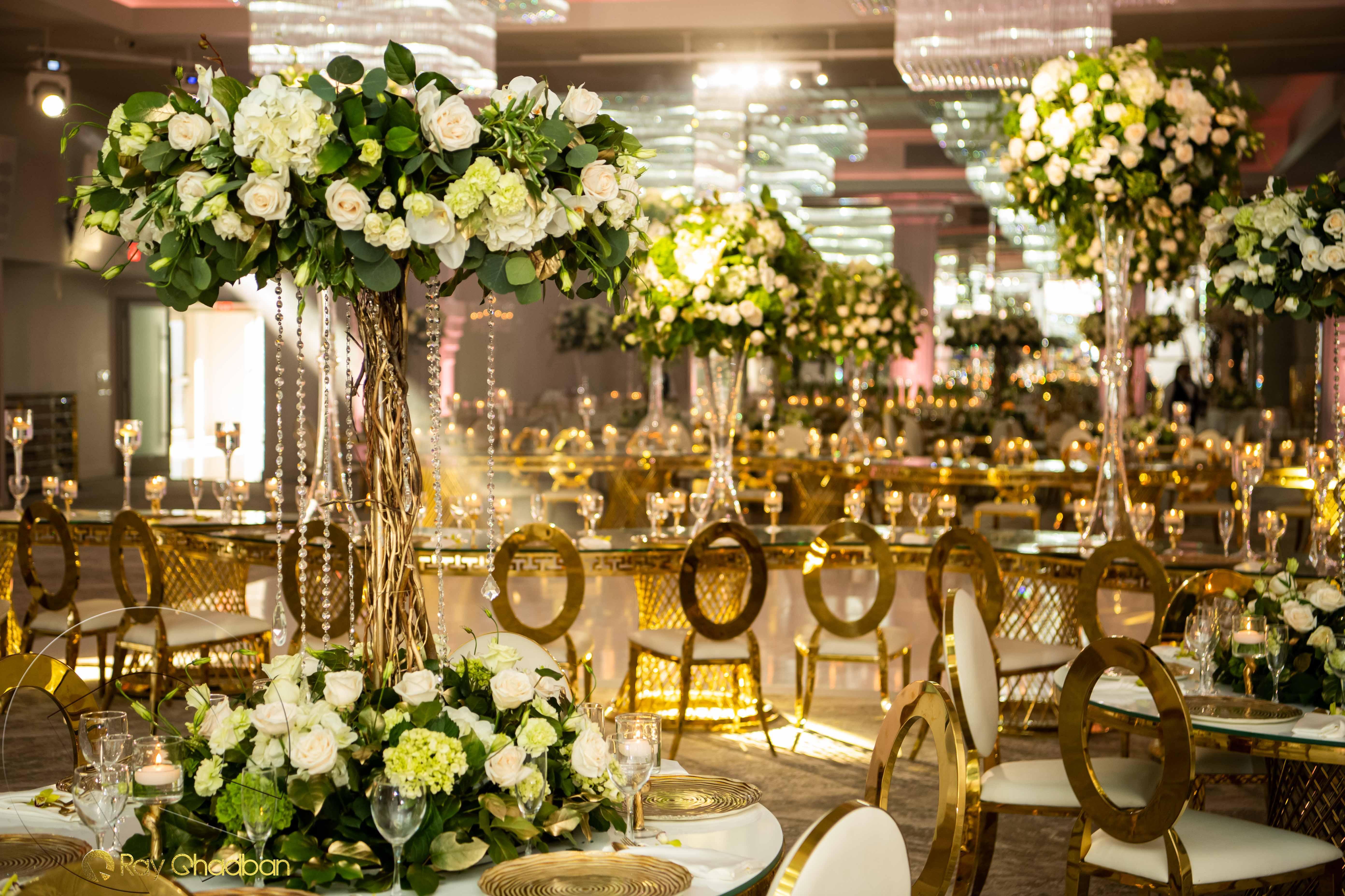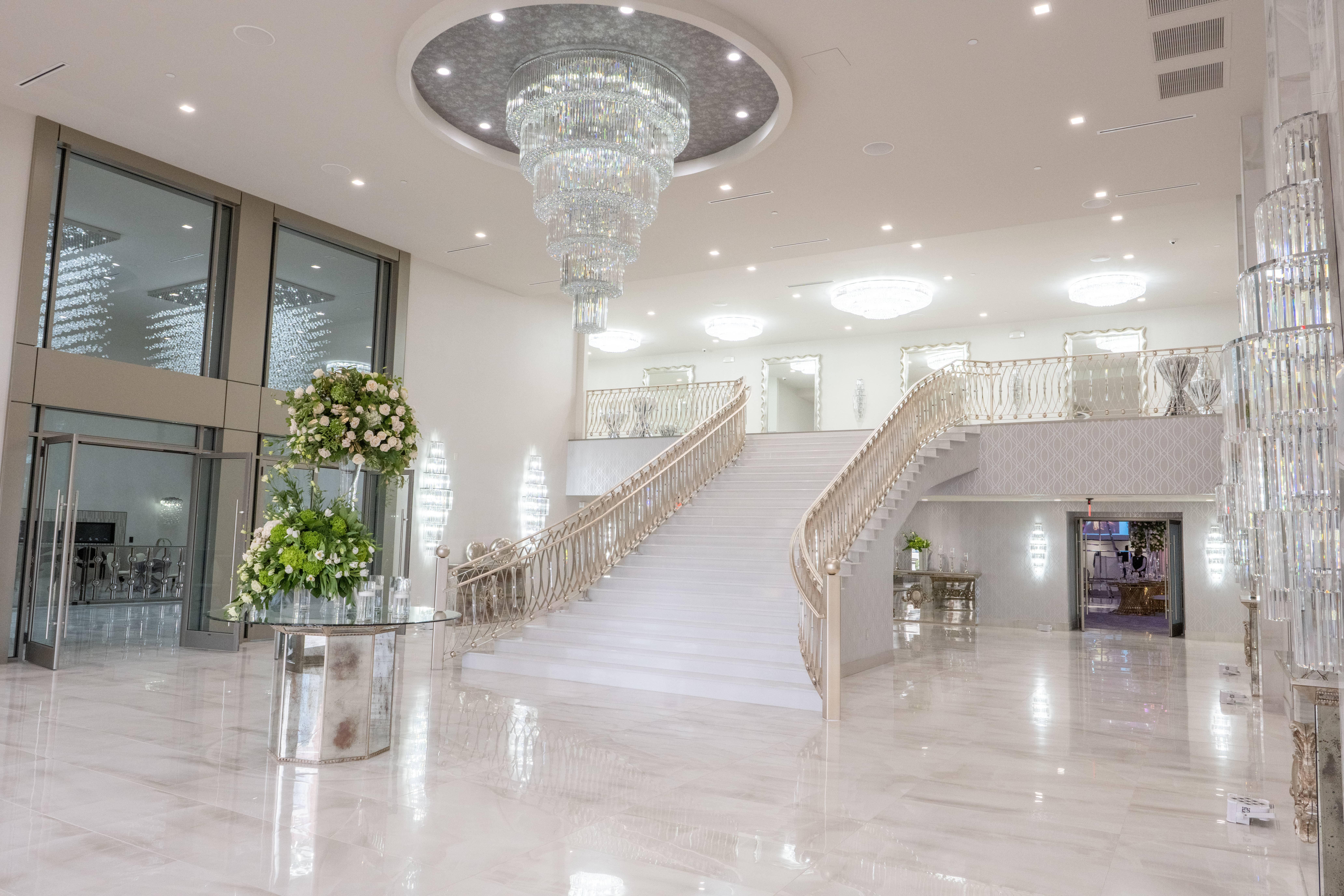 Situated in Fairfax, Virginia, CrystalView Weddings & Events is an elegant wedding venue welcoming couples to celebrate their special day in style. This team is dedicated to providing couples with a service and space to make their event truly unique and unforgettable. With luxurious event areas and staff that can cater to celebrations large and small, couples can rest assured that theirs will be an enjoyable day filled with love. Wedding-goers will be welcomed into a large foyer, with their attention grabbed by a marvelous grand staircase with a chandelier above. Marble flooring gives an air of true lavishness as guests make their way to the reception area. This space is finished in sophisticated style, boasting opulence at every turn. Floor-to-ceiling mirrors line the walls, beautifully reflecting light from the magnificent lighting fixtures in the room. A warm, neutral color palette makes this an ideal space for celebrations of any theme or color scheme.