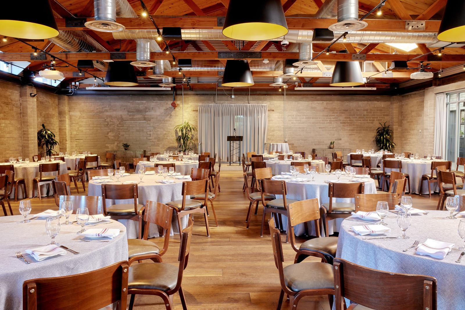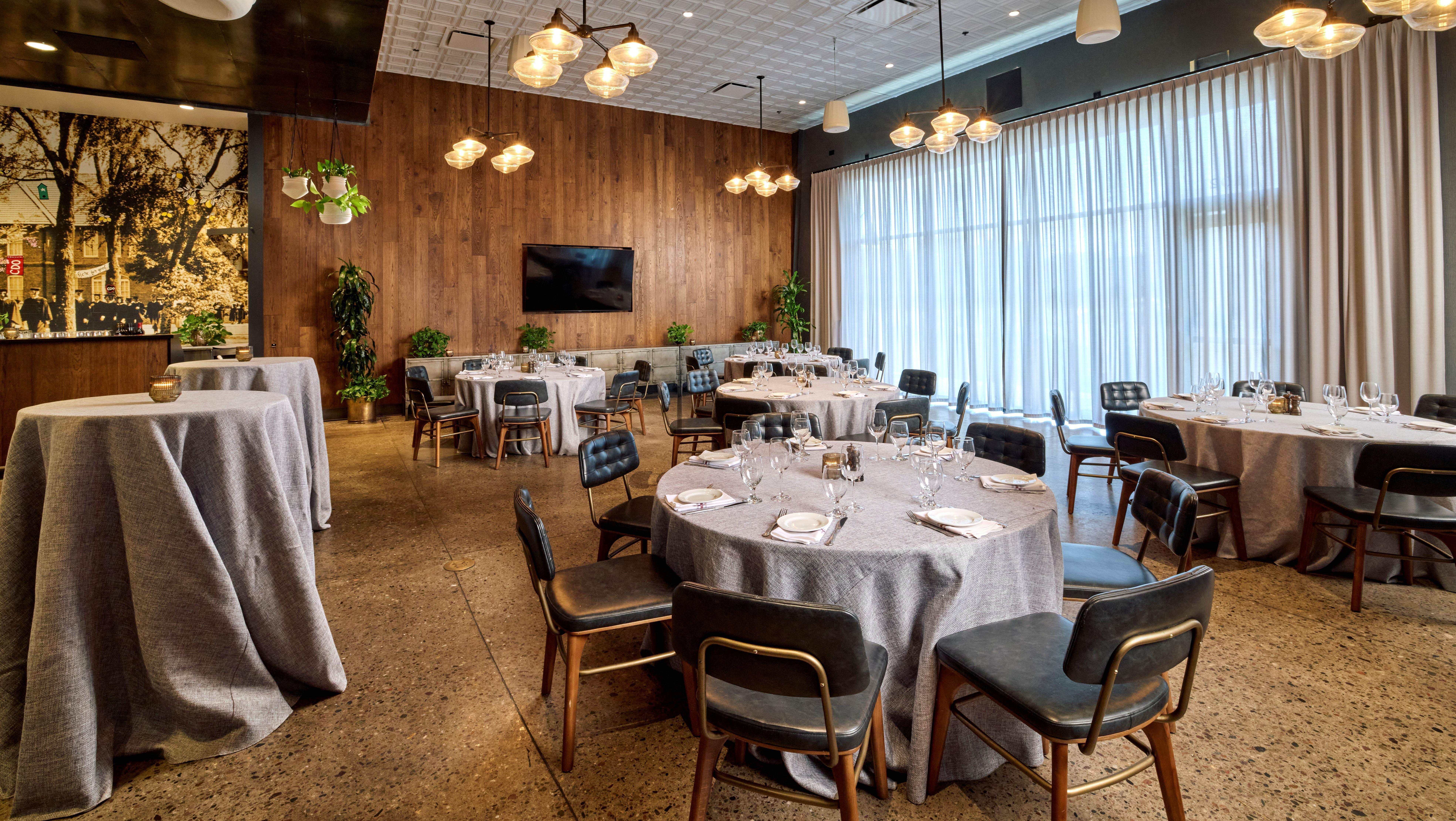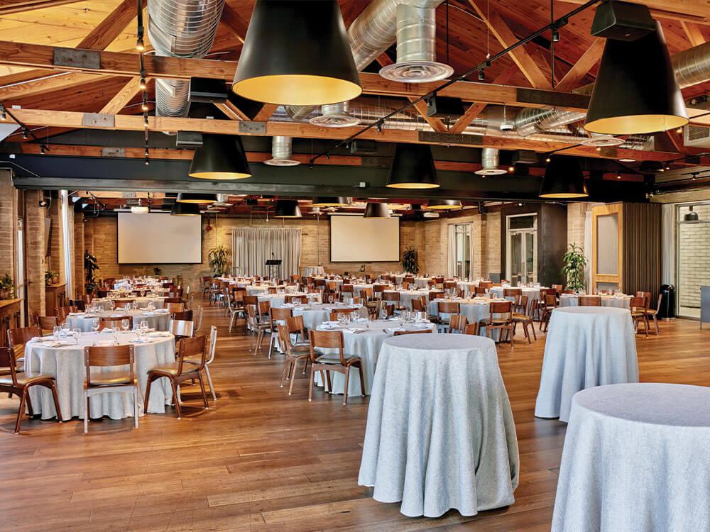 The Broadway: industrial‑chic private room for up to 100 seated or 110 reception guests, complete with linens, chairs, tables, valet, Wi‑Fi, projectors, plasma TVs, mics and full sound system.