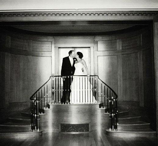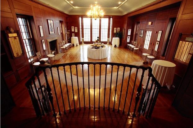 The perfect room for a wedding ceremony or cocktail hour with its double cascading stairway and floor-to-ceiling windows.