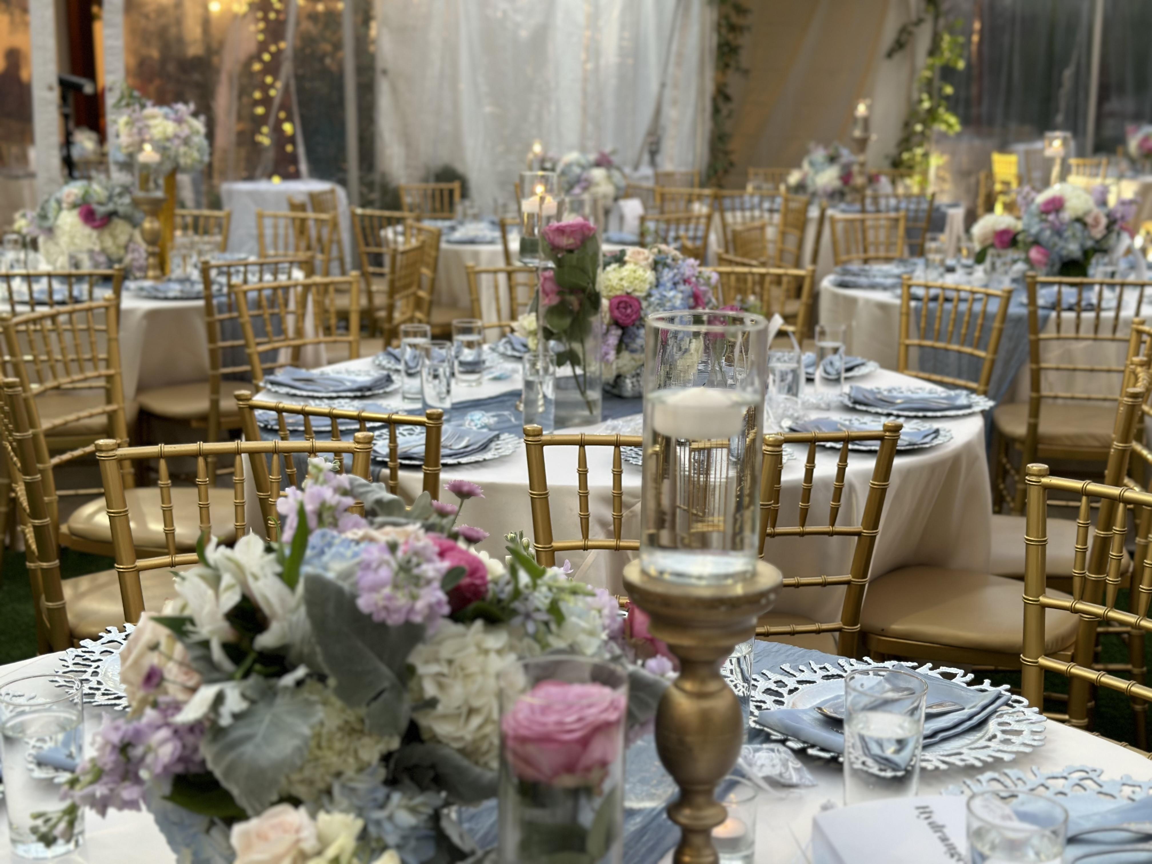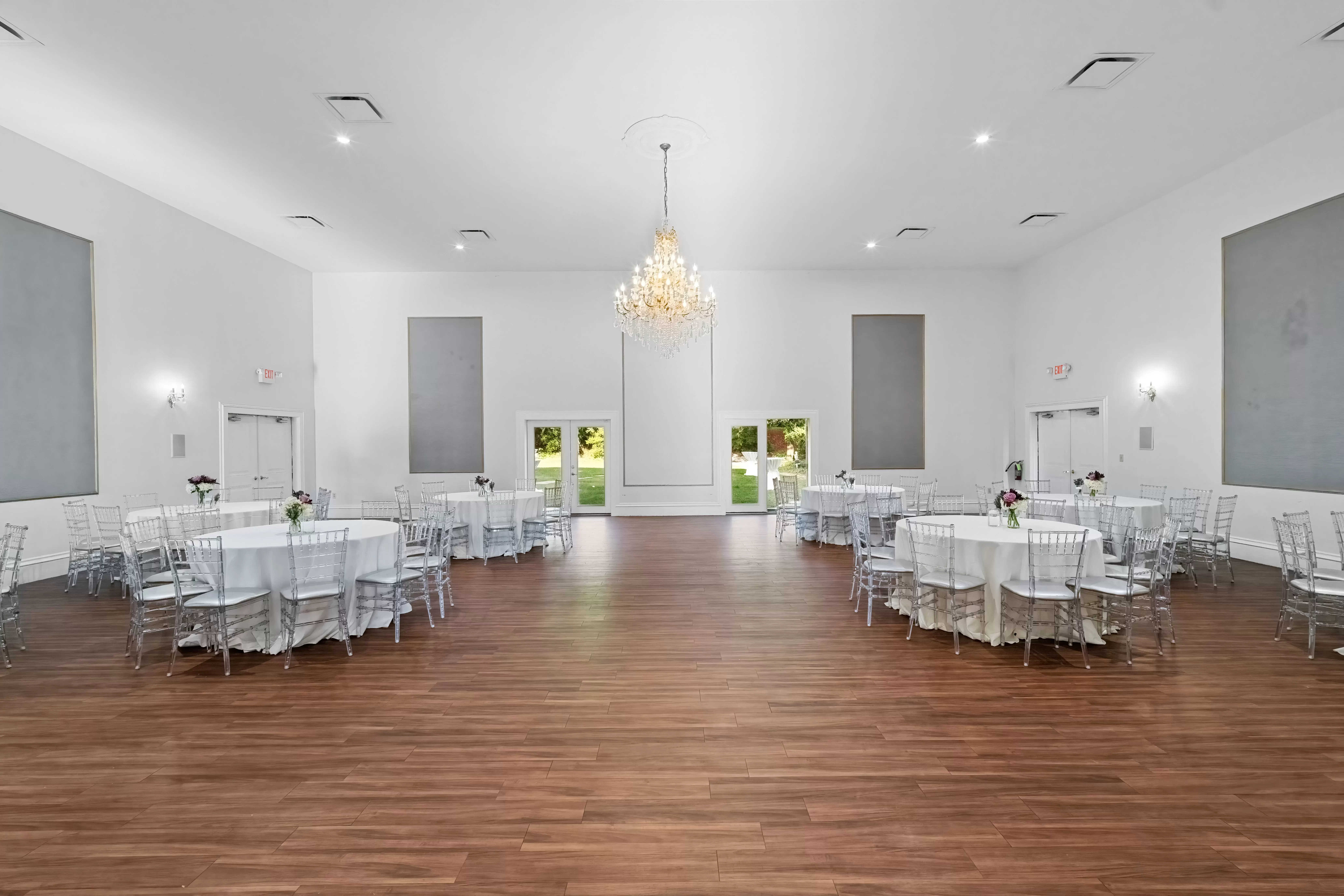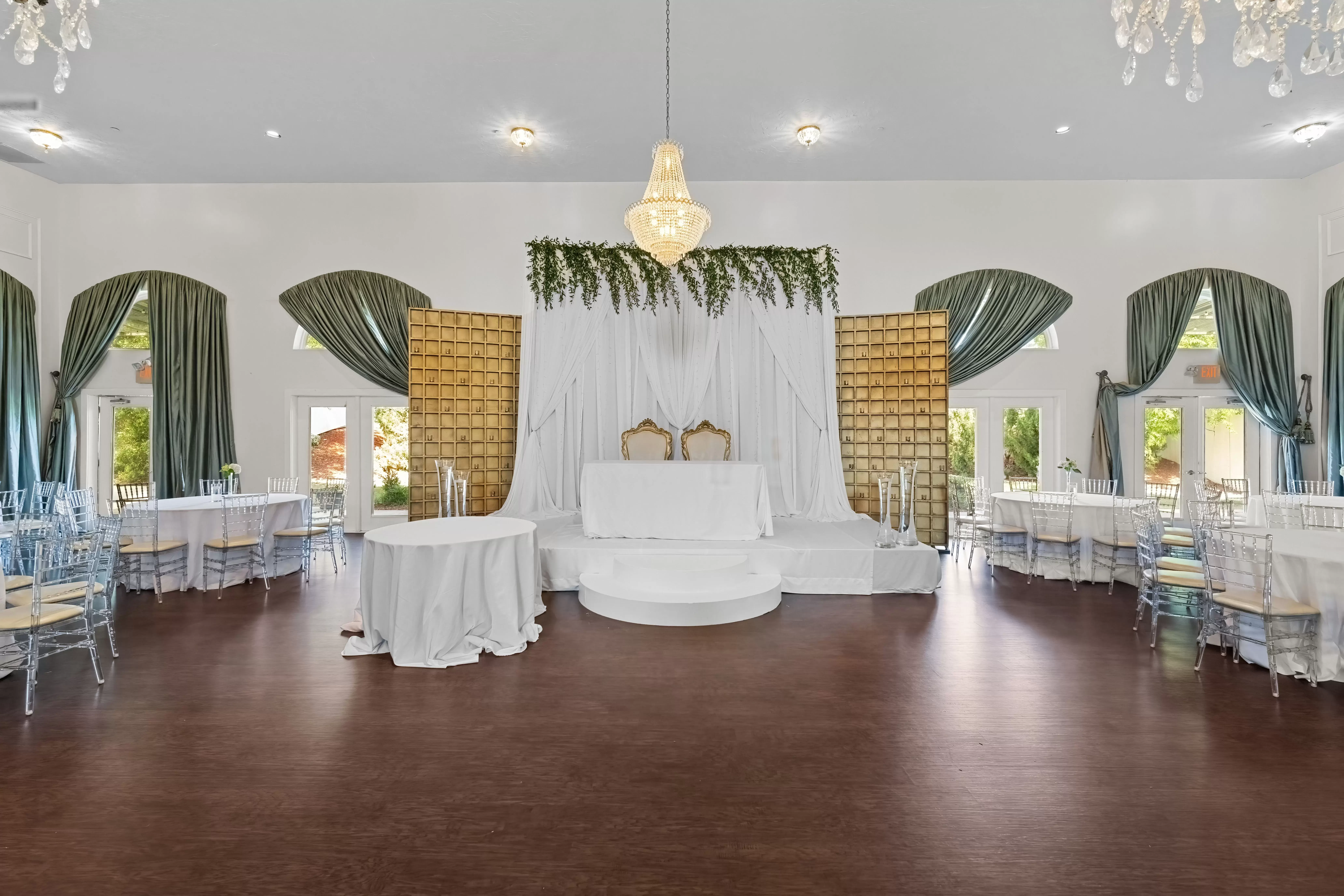 Set up and break down of ballroom. All tables (head table, cake table, sign-in table, etc.) White or ivory linen. Gold or Silver Centerpieces surrounded by votive candles. Clear chiavari chairs. Access to bridal and groom suites. Complimentary cake cutting for wedding receptions.