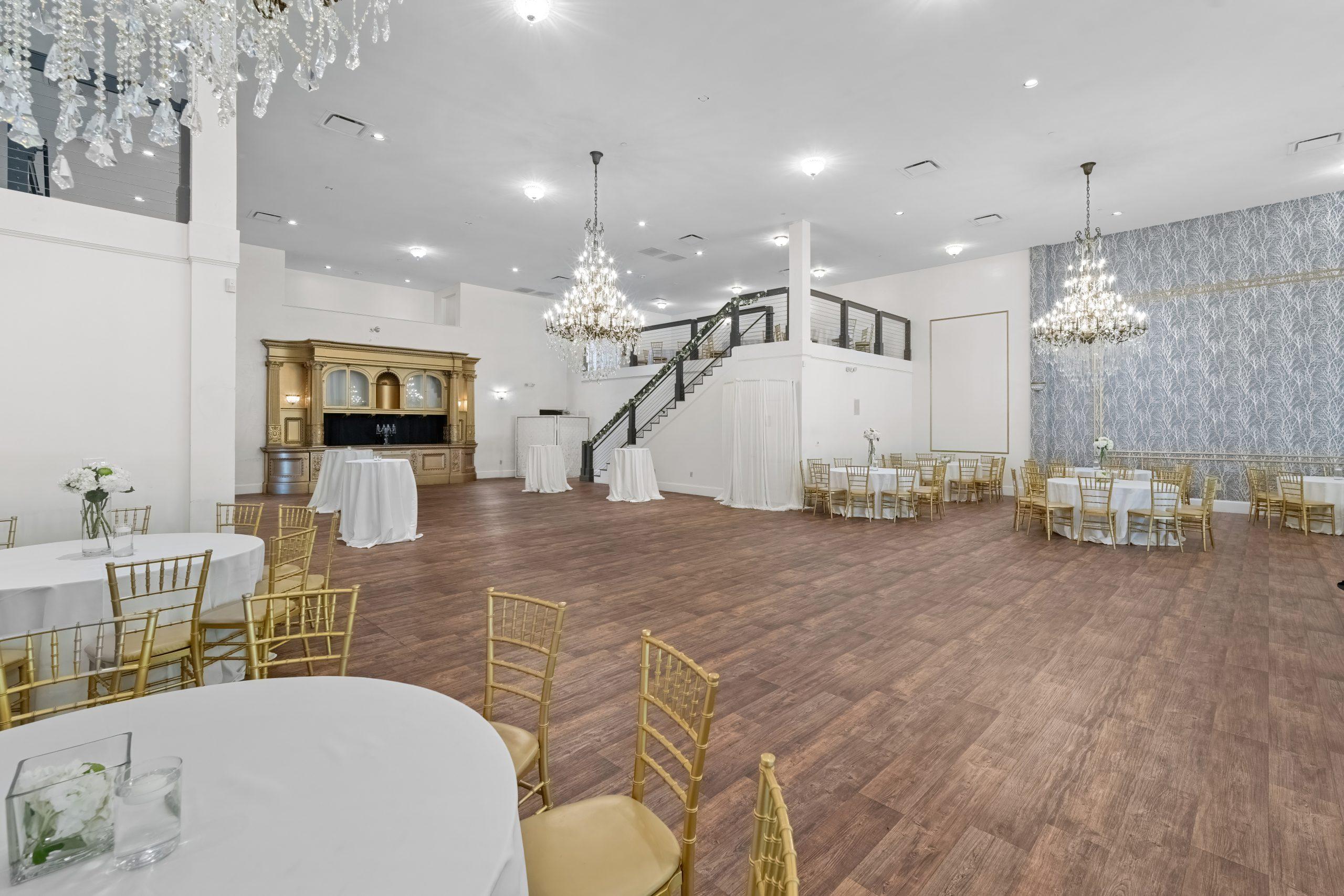 The Malibu ballroom offers 3,000 square feet and accommodates 100 for ceremony style and 100 for reception style with the garden offering approximately 4,000 square feet. This gorgeous ballroom has 2 staircases coming down in the middle from both sides. A beautiful garden set like an oasis with a water feature behind the ceremony arch. The string lights provide a lighted ceiling for the garden, creating a romantic ambiance.