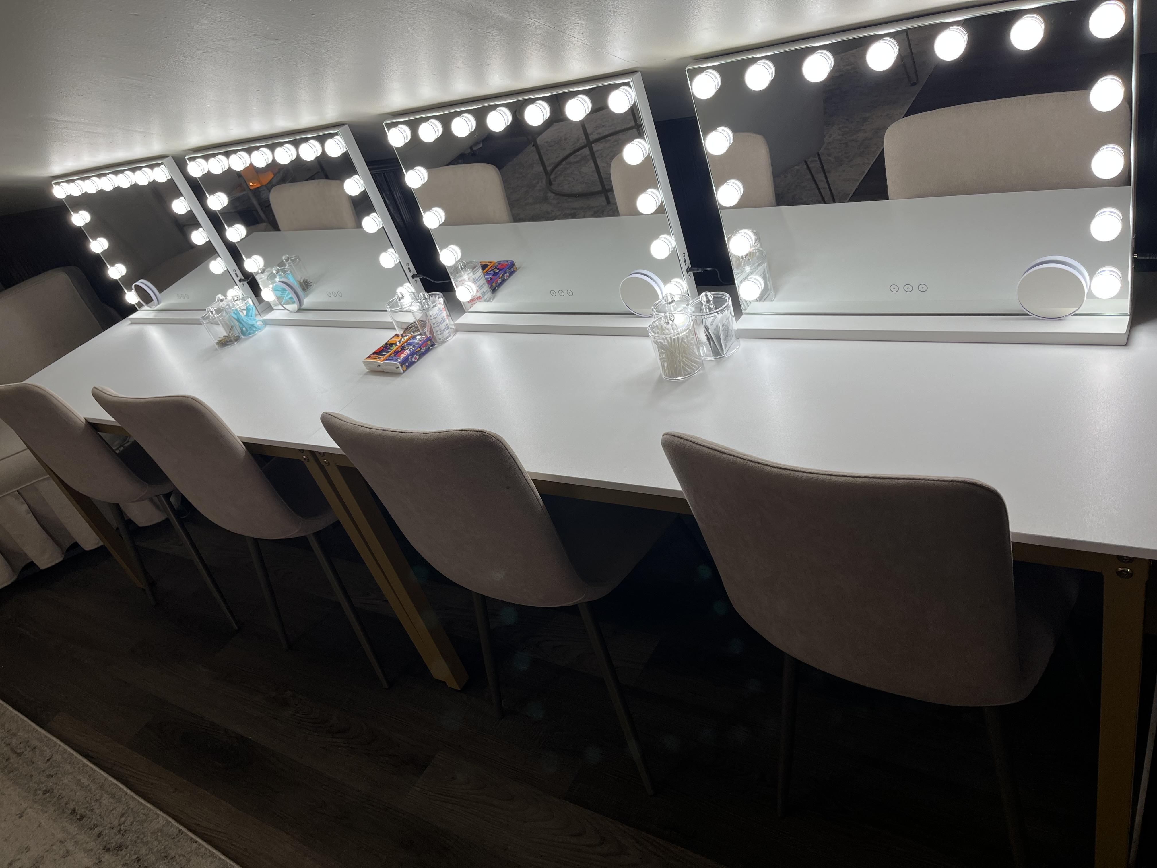 This space includes seating for up to 10 people. 4 spots include mirrors for getting ready + there is a small kitchen and bathroom.