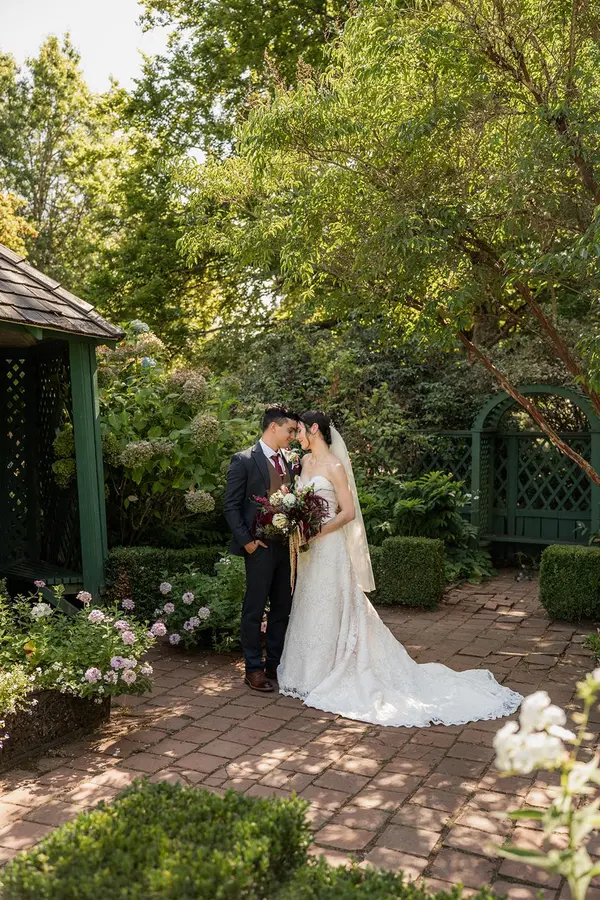 The venue features several gardens, and a tented tennis court all connected by brick and gravel pathways bordered by charming wrought iron fencing and gates. Ivy covered arbors and gazebos provide unparalleled photo opportunities.