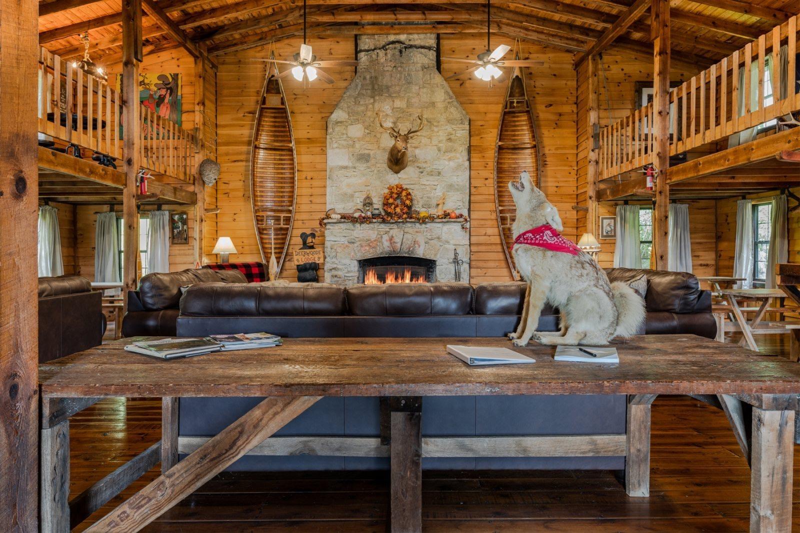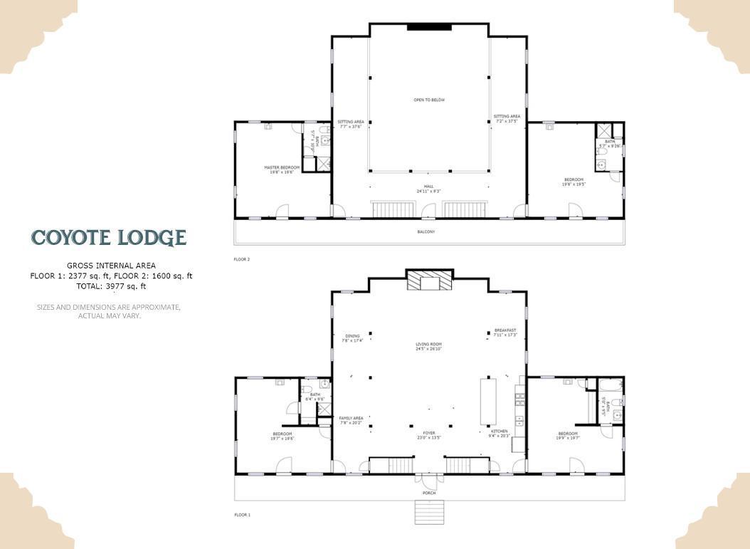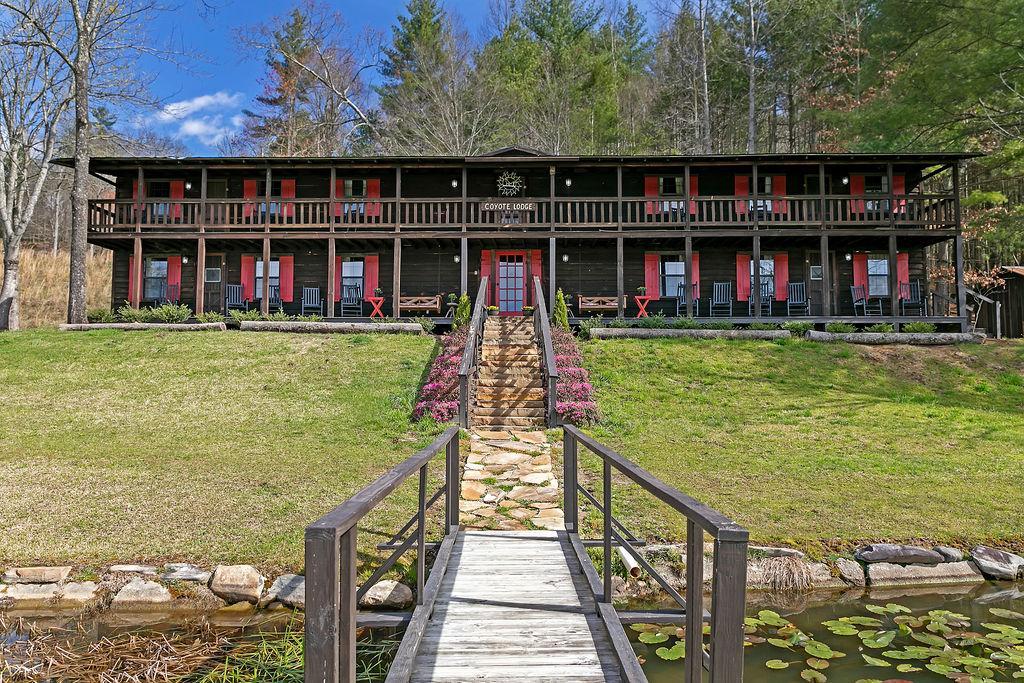 The Coyote Lodge features a massive great room with huge stone fireplace. Perfect for rustic and casual events with less than 75 guests. The two-story balcony inside offers additional seating or standing space and it's open to below. Two bedrooms off the main room downstairs and two bedrooms upstairs, provides sleeping for up to 18 people. Large front porch with swings and rocking chairs with long-range views. Private fire pit and outdoor picnic area.