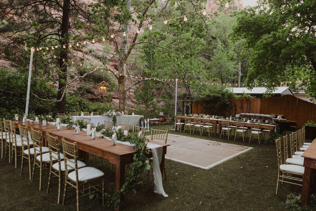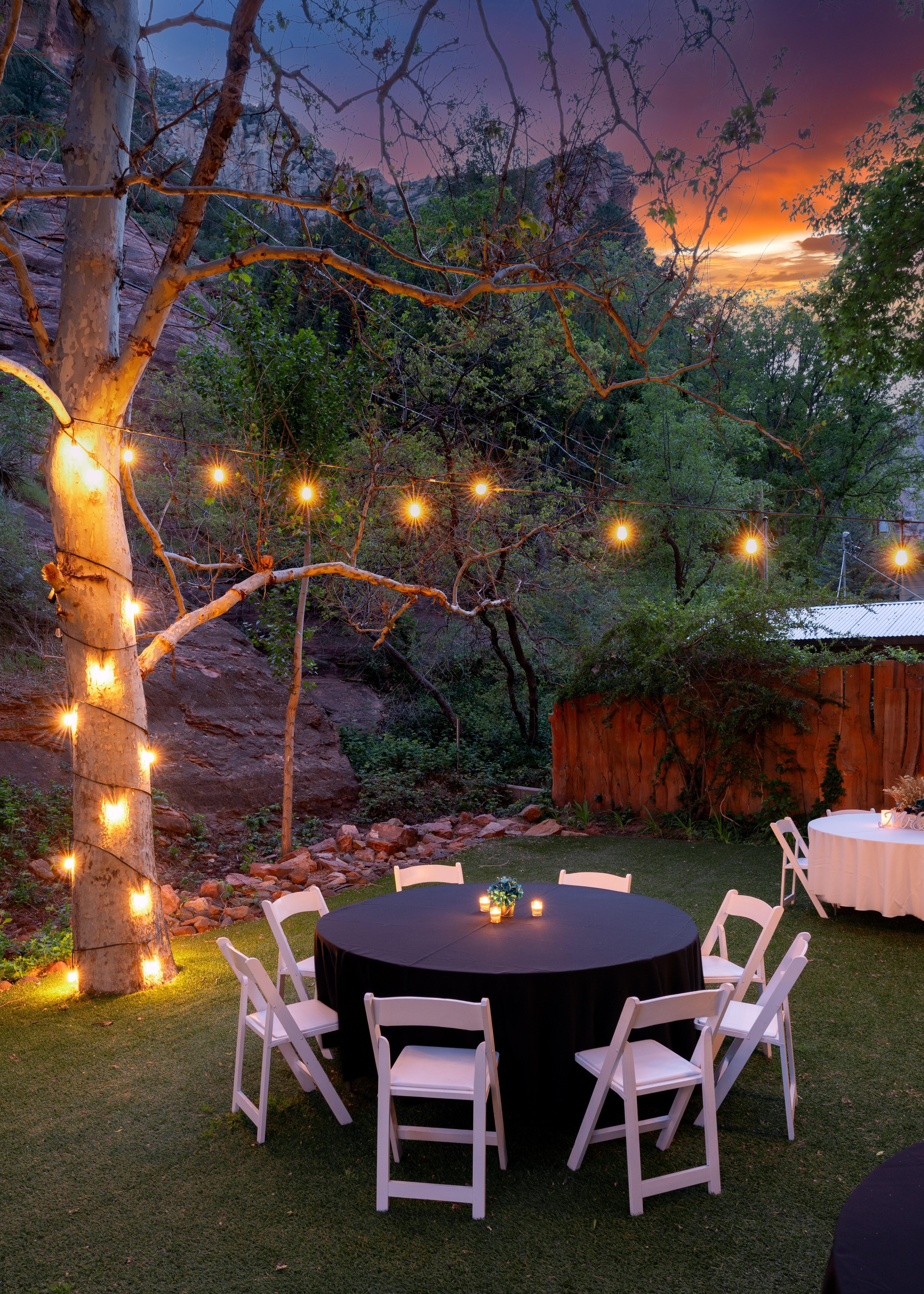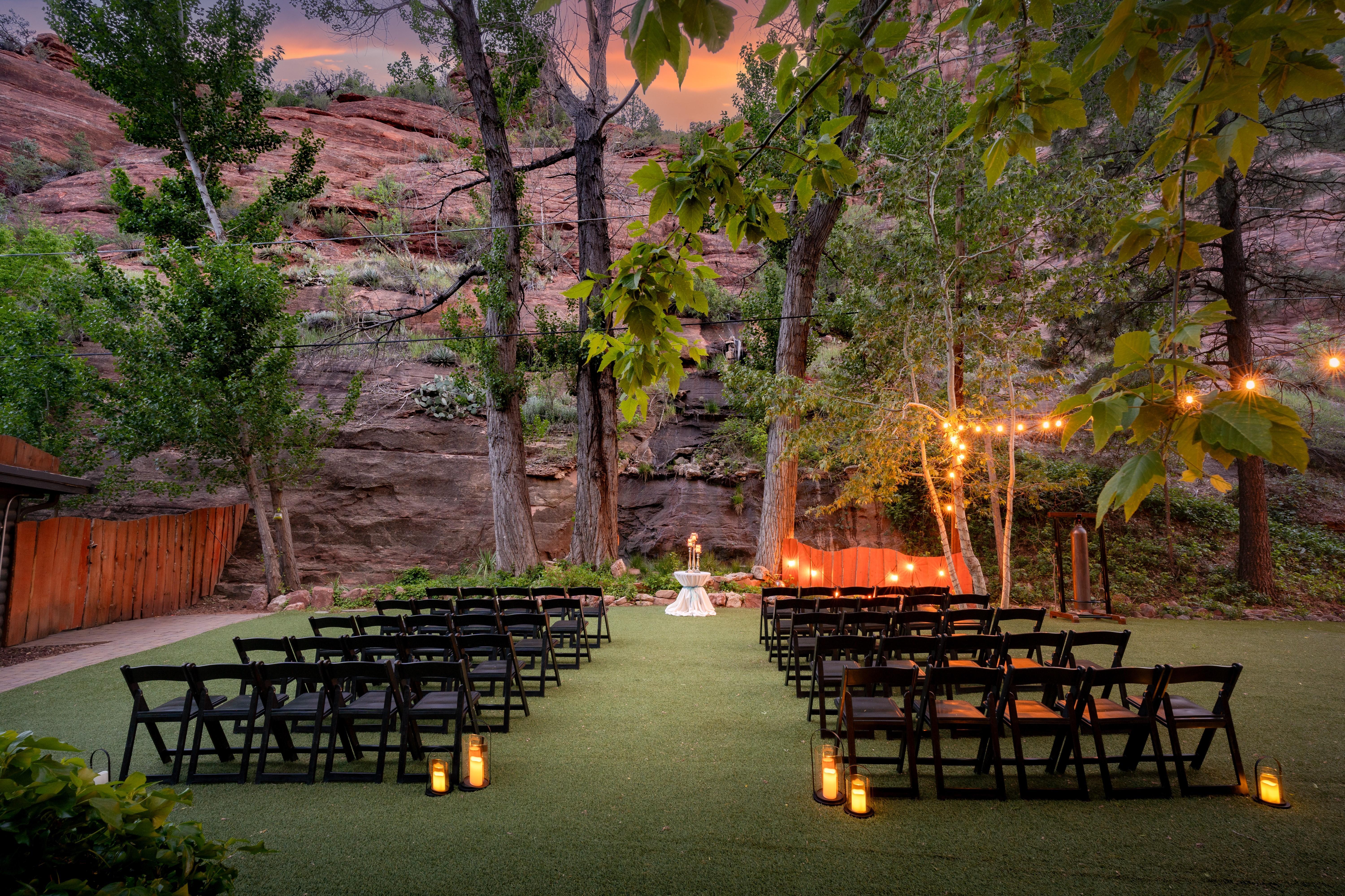 The property is nestled in the Red Rocks of Oak Creek Canyon. With flowing mature trees, lush green grass, beautiful landscaping and the soothing sound of a breathtaking waterfall, our event lawn and cabins are the perfect romantic setting for an Oak Creek Canyon celebration. Packages start with a two-night buyout giving you exclusive access of the property. We are able to accommodate up to eighty guests on our 4,000 sq. ft. event lawn.