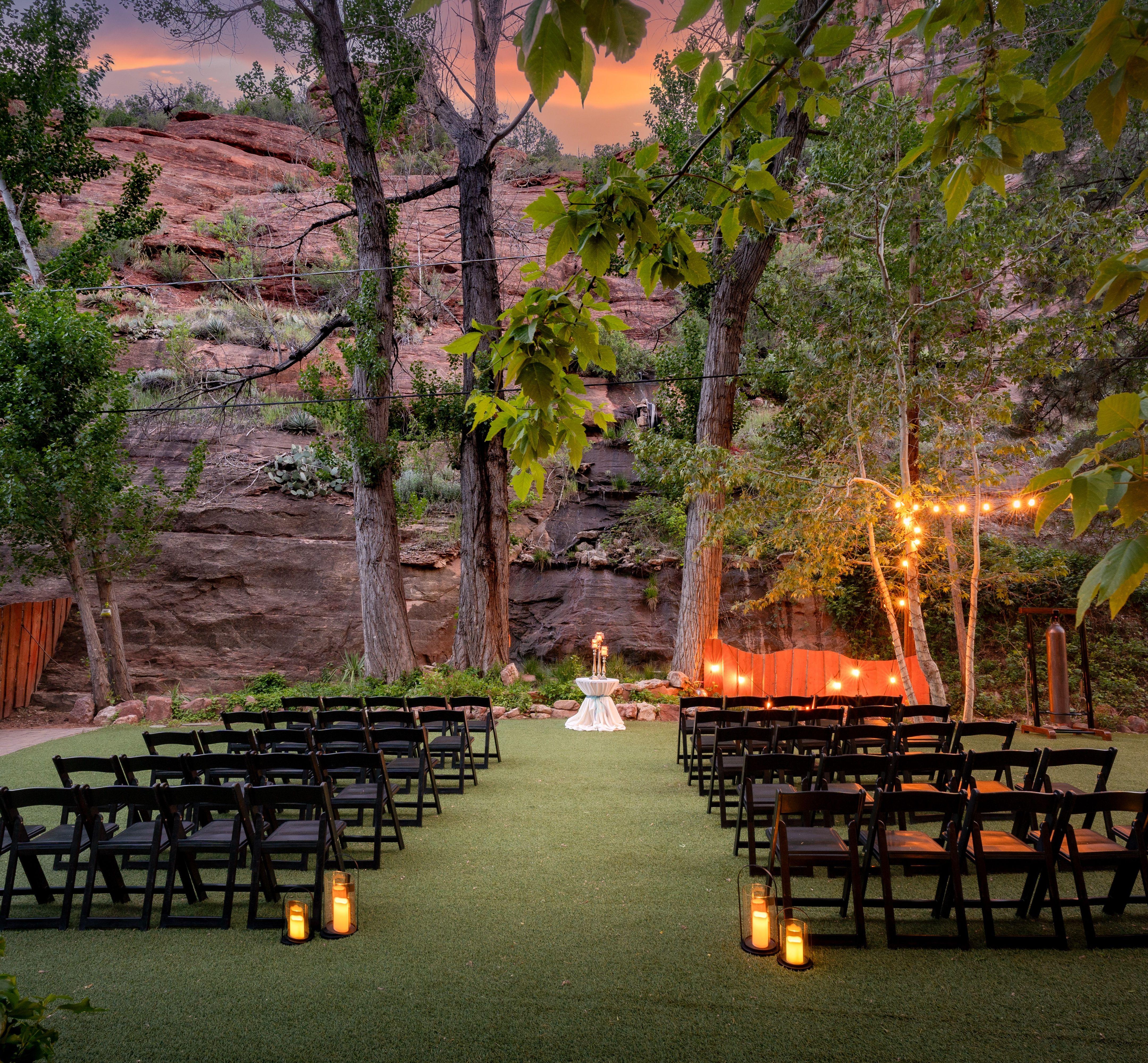 Our wedding packages may be customized based on your vision but start with: • Exclusive use of outdoor spaces and common areas for your wedding and/or reception with full buyout of 10 Cabins and 4 Suites for 2-night minimum • 4,000 sq ft event lawn nestled against the red rocks with flowing waterfall and bistro lights • Honeymoon suite for 2-nights • Event, admin and cleaning fees
