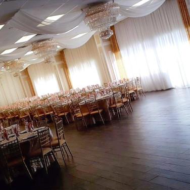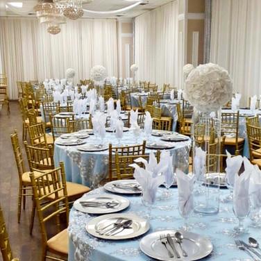 • Security is required and two security guards will be provided by Destiny Banquet Hall. • On-site Facility Manager (a representative of Destiny Banquet Hall) • Standard round tables • Chiavari Gold chairs • Table and chair set up . Bartender • Ample on-site guest parking and central AC/Heater • Permanent restrooms for guests • LED Dance floor • Buffet tables for dinner service . Patio Area with 2 Cocktail Tables . Cleaning after event