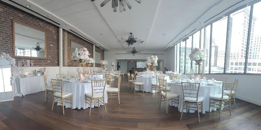 The Observatory is an enclosed room that can accommodate up to 80 guests with a plated meal service and an area for dancing, or 120 for a strolling reception. Surrounded by the cloud-scraping buildings and sweeping skyline views of downtown, outdoor terrace, and a hypnotic light installation by local artist Patrick Ethen.