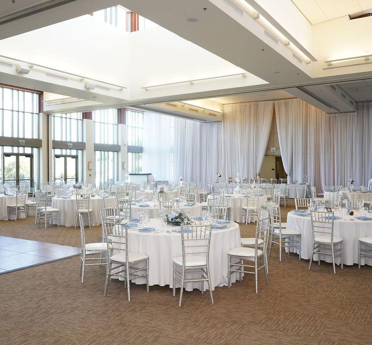 The Grand View Ballroom, the largest event space, features a window wall with beautiful scenic views of the San Gabriel Valley, as well as a raised platform stage for performances, audio/visual equipment, an outdoor patio, a foyer, and a motor coach entrance.