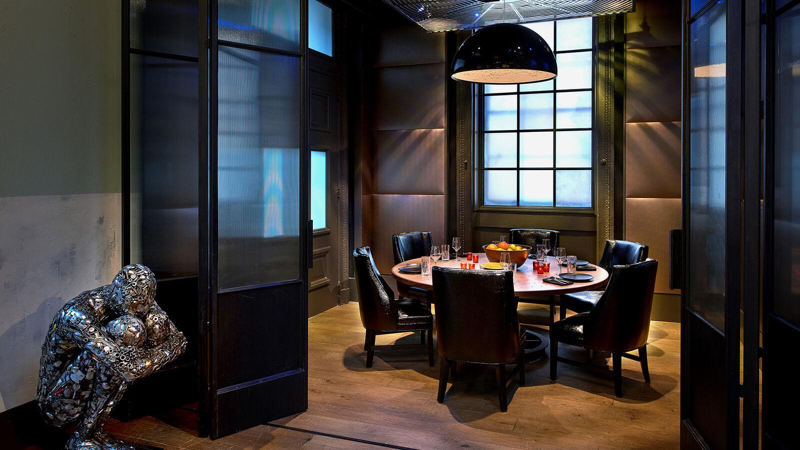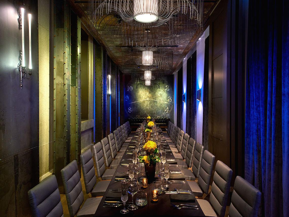 The Eston Room is ideal for business meetings, luncheons, and intimate dinners. The room features a stately round table, lush vegan leather seating and vegan leather wall panels. This space can be fully enclosed for privacy.