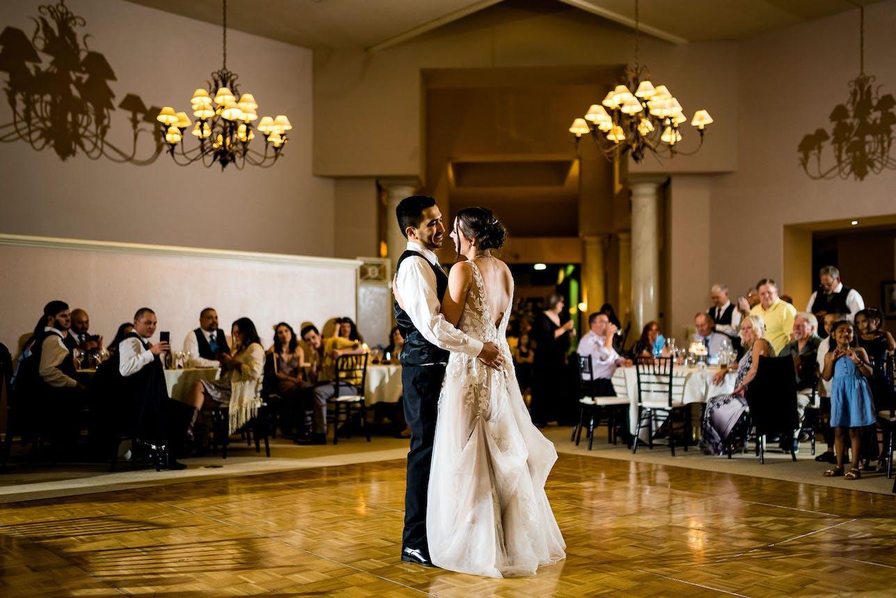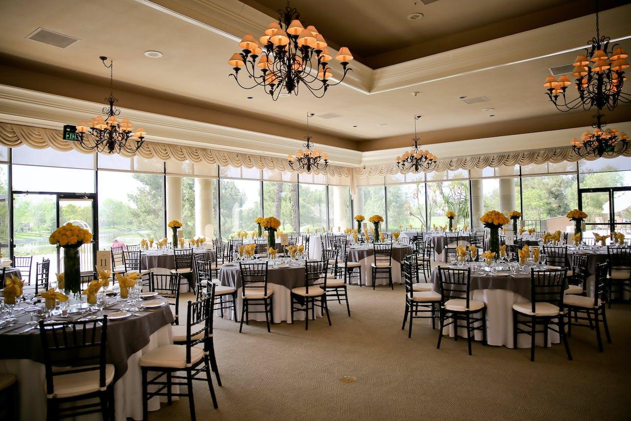 Our spacious grand dining room can host up to 160 guests! As guests gather for your wedding, the reception area provides an amazing setting which includes a custom size dance floor, layered wall accents, large chandlers and floor to ceiling windows that give you the view of an 18-Hole Championship Golf Course!