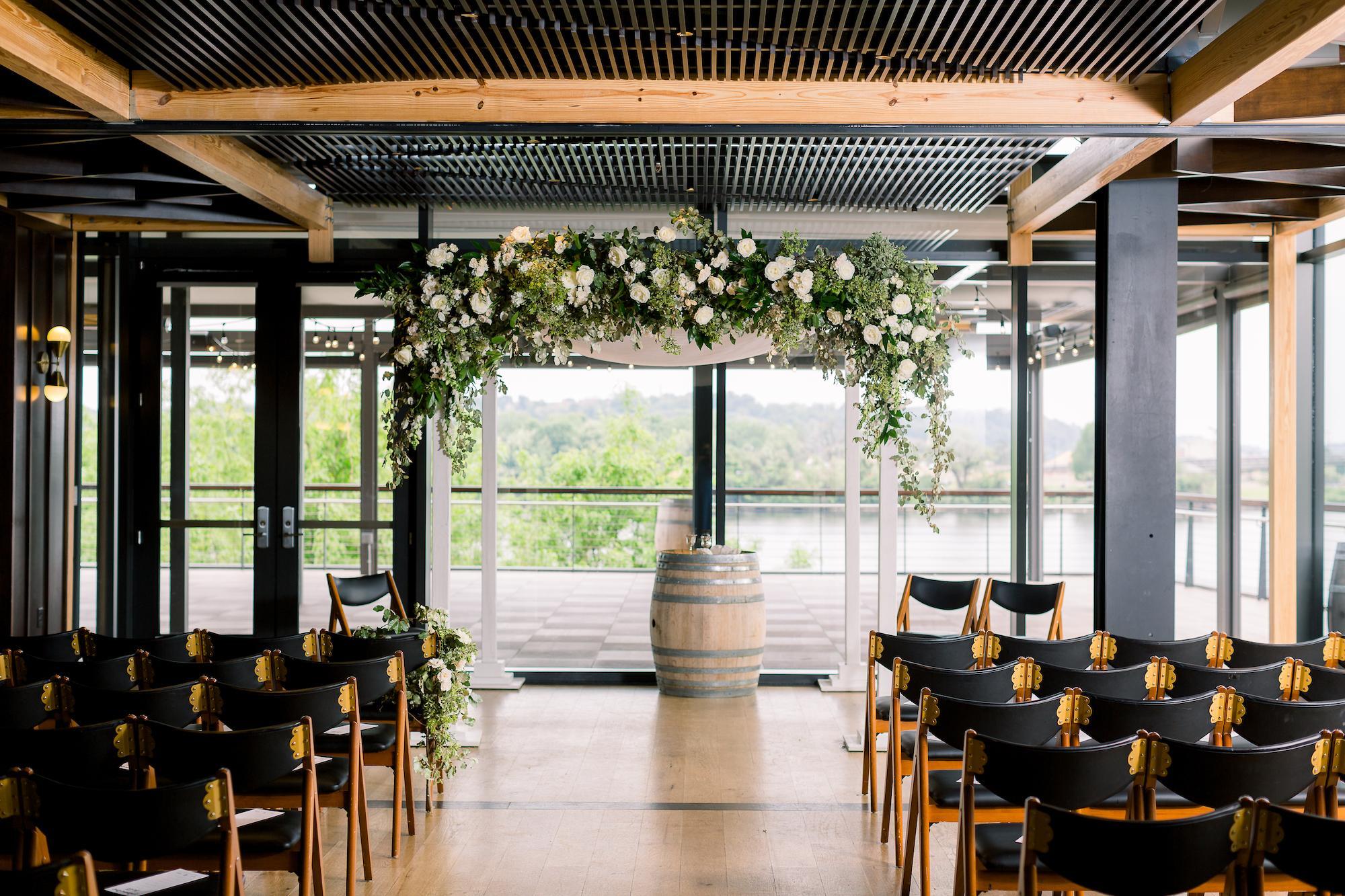 Host your ceremony on our wraparound terrace or in our second floor, indoor private space with floor to ceiling windows. Enjoy cocktail hour either outdoors on the terrace or on our mezzanine level overlooking the winery production space and barrel room. Then dine and dance the night away with unobstructed riverfront and sunset views.