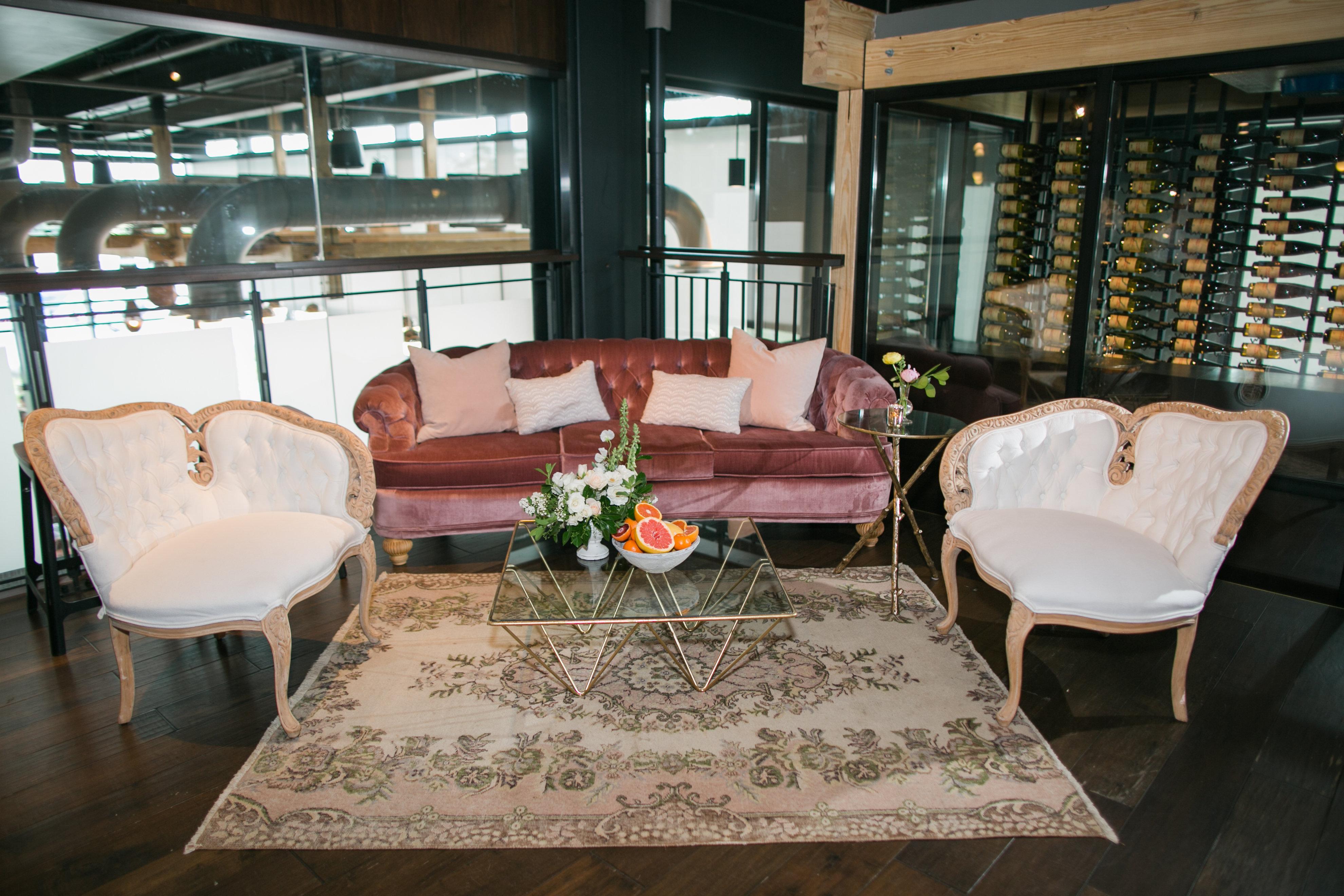 This space is the perfect place to greet guests and host a cocktail hour. With glass windows overlooking the winery and wine displays, you'll have the perfect backdrop for photos. High top tables, staged couches and chairs and other furniture additions are commonly utilized in this space.