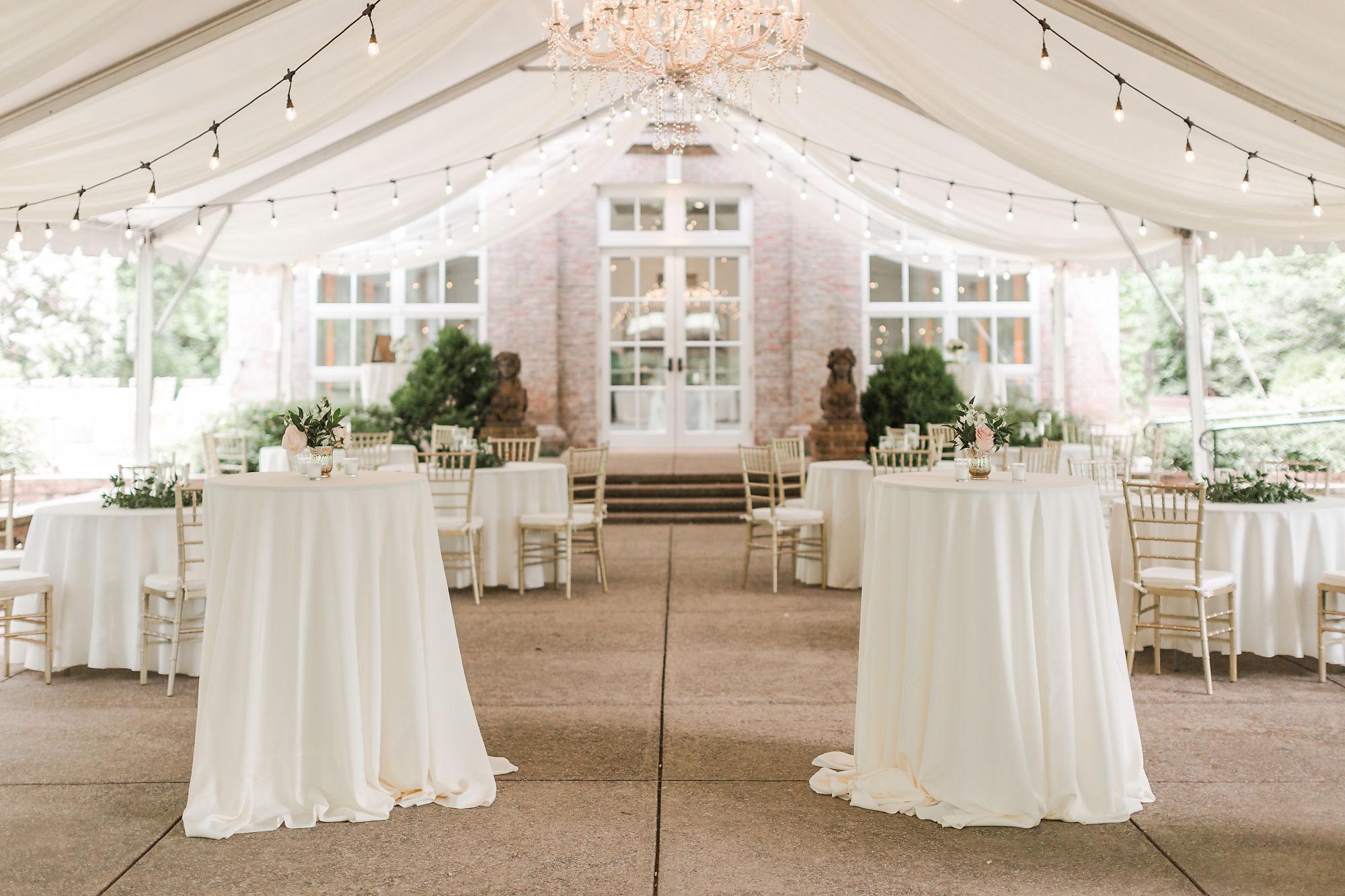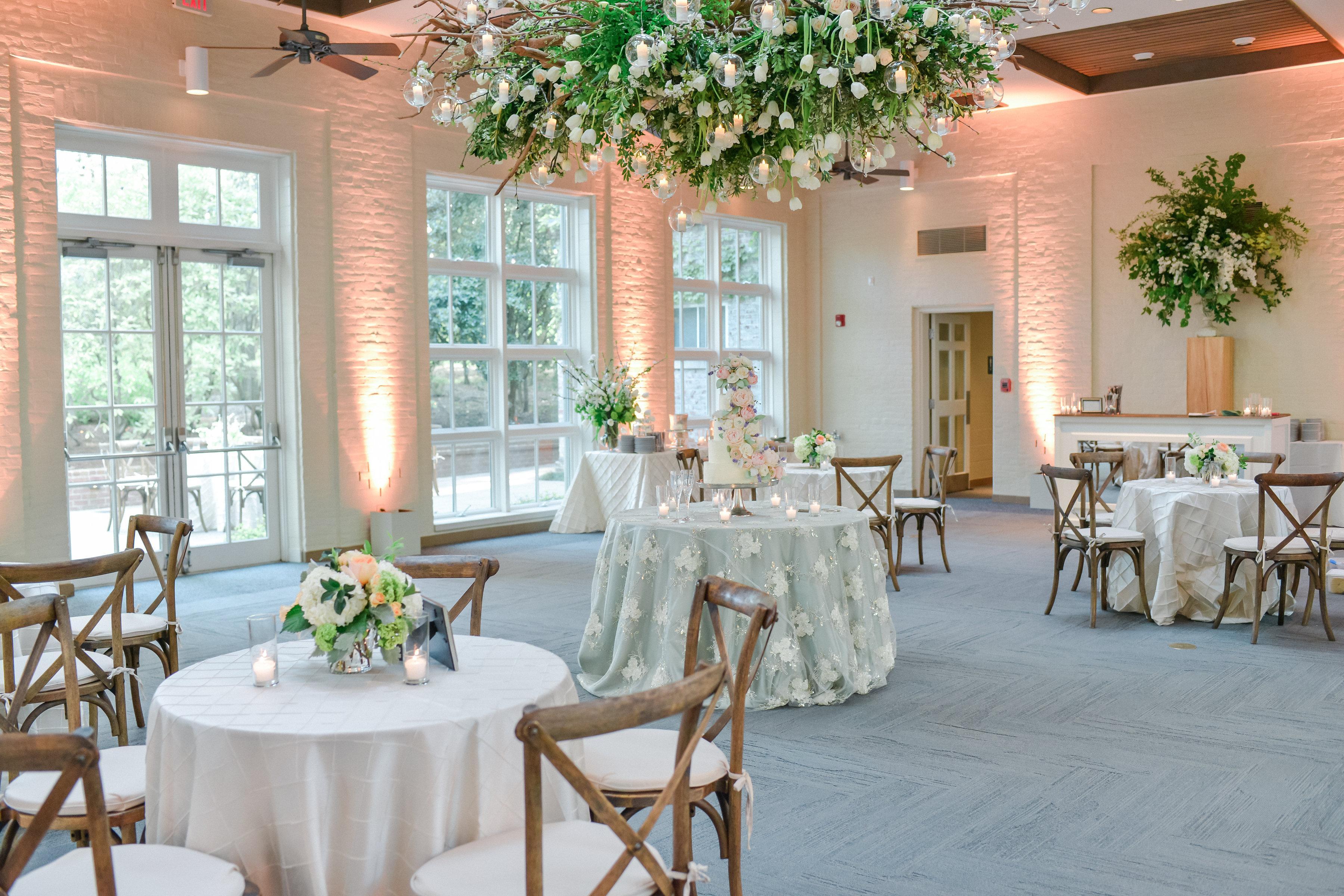 The Hughes Pavilion is a beautiful brick building with floor-to-ceiling windows and outdoor patio space, featuring panoramic views of the woodland gardens. This space is perfect for a cocktail-style reception or a seated rehearsal dinner with cocktails; it can accommodate up to 150 seated if using both the inside and outside areas. Its neutral color palette and simple yet elegant design allow couples to keep it simple or go big with their design to truly make it their own.