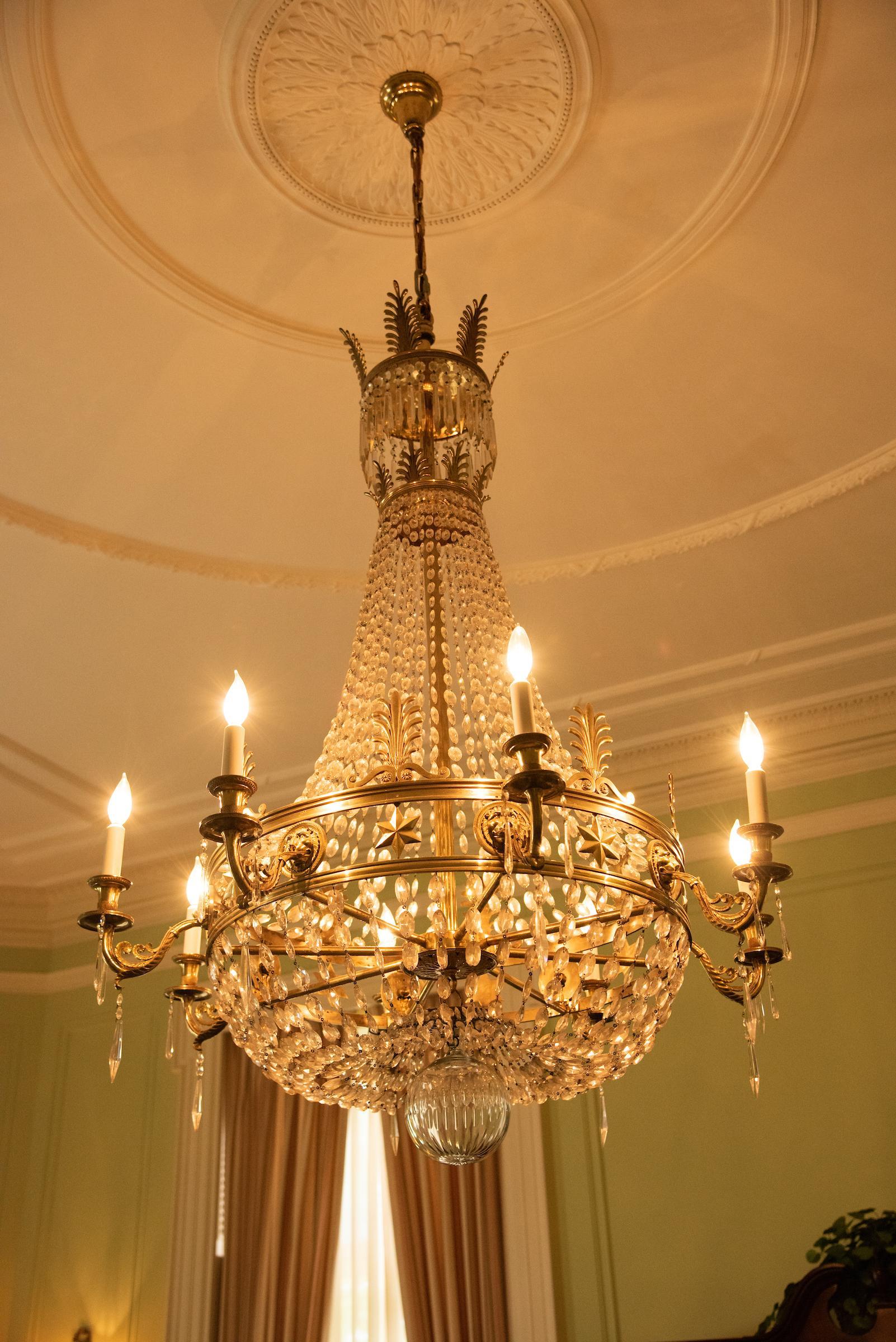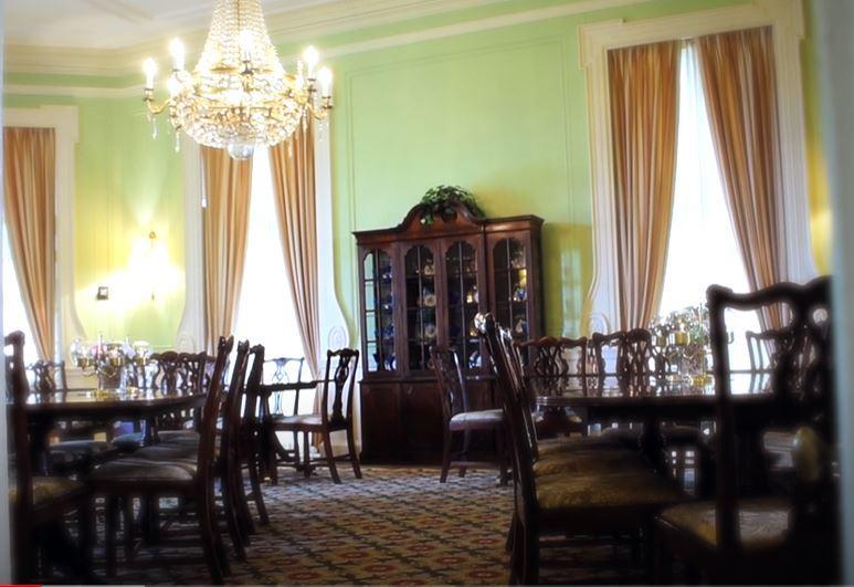 original 1929 chandelier original wall scones ornate molding music historic family China and Tiffany bowls on display five classic dining tables in cherry with 50 chairs - expand from 4 guests to 10 at each table Breakfast Room right next door for increase capacity