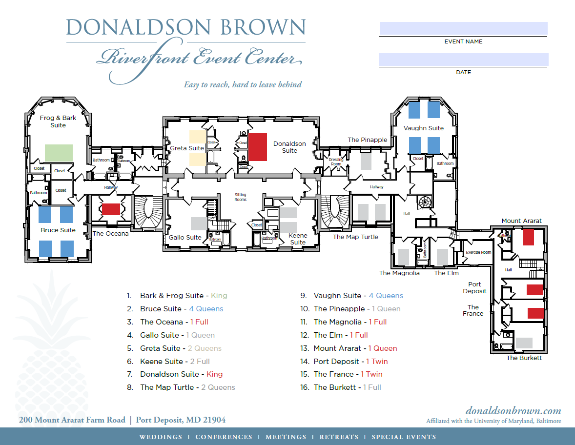 With seven luxurious suites and ten additional bedrooms, Donaldson Brown offers a unique experience of love and laughter.