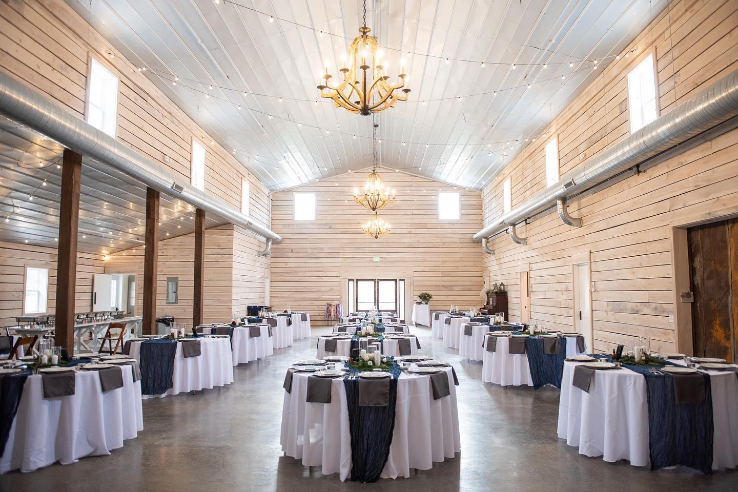 Modern event barn with white-washed poplar walls, creating a bright, elegant space with heating and cooling for ultimate comfort.