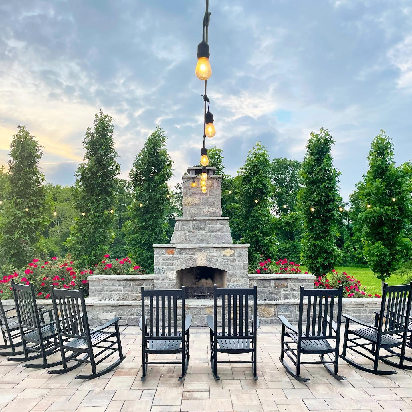 The event barn at Double Creek Farm consists of a main hall, bridal suite with private half bathroom, mens and womens restrooms, catering kitchen, storage area, and master crafted hardscape patio with wood burning fireplace and rustic bar.