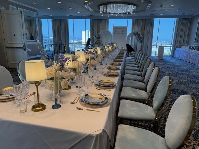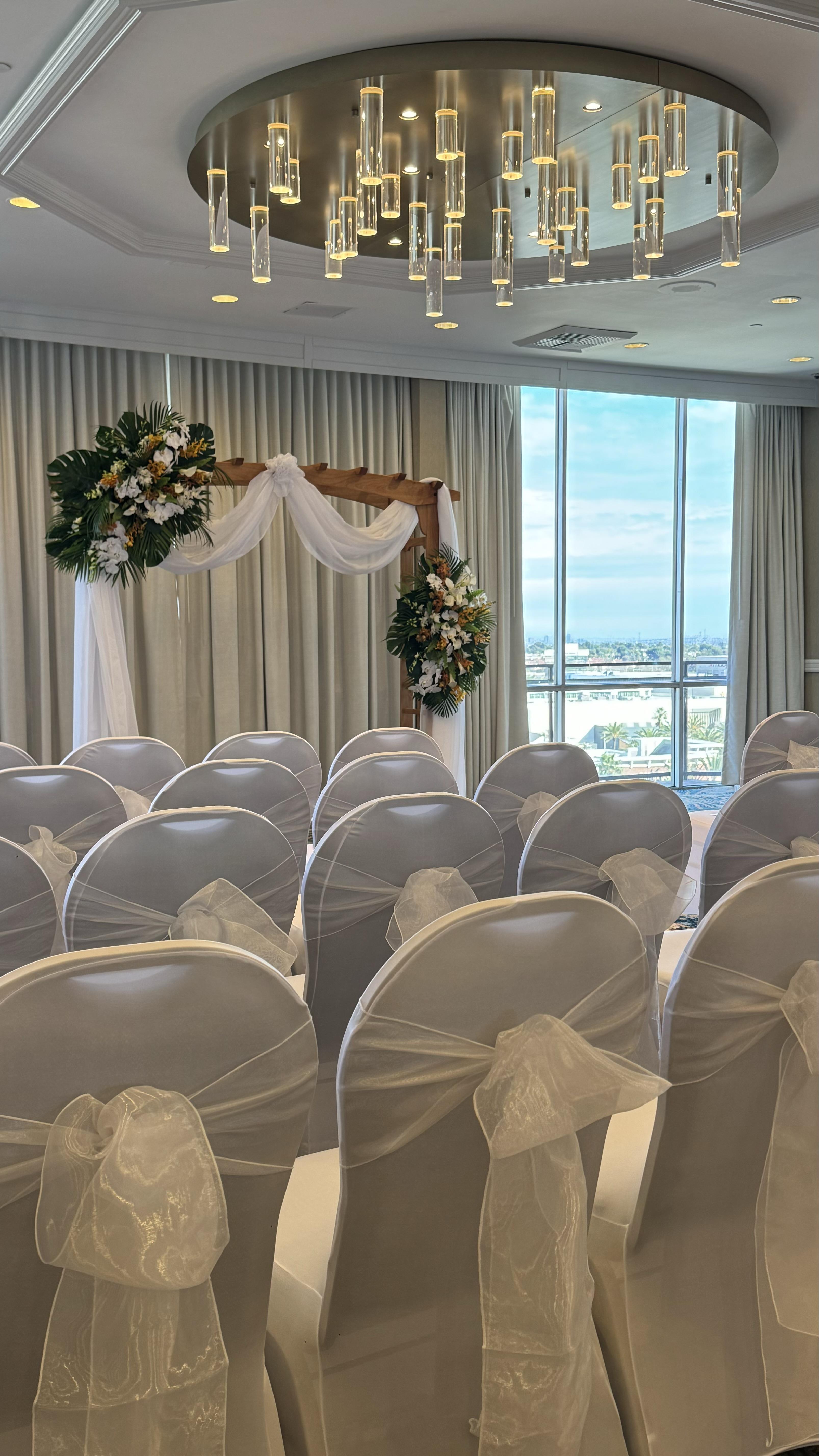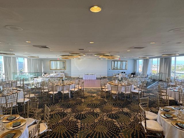 Located on the top floor of the hotel, the ballroom features floor-to-ceiling windows that provide sweeping panoramic views of the city and coastline, creating a stunning backdrop for ceremonies and receptions. Inside, guests are welcomed into a modern space with high ceilings, soft neutral tones, and refined finishes that complement any wedding color palette or décor theme. The spacious layout can accommodate both intimate celebrations and larger gatherings.