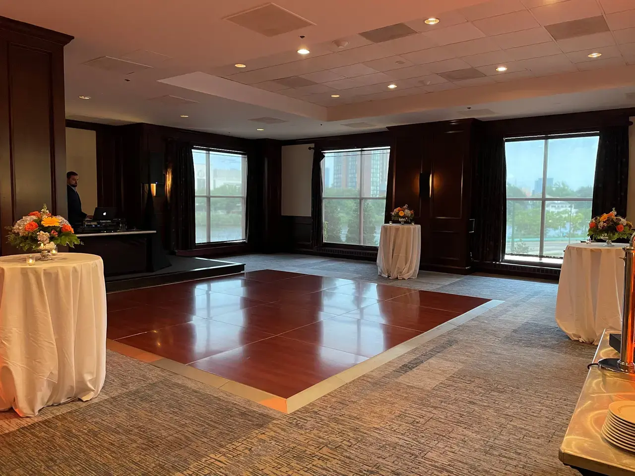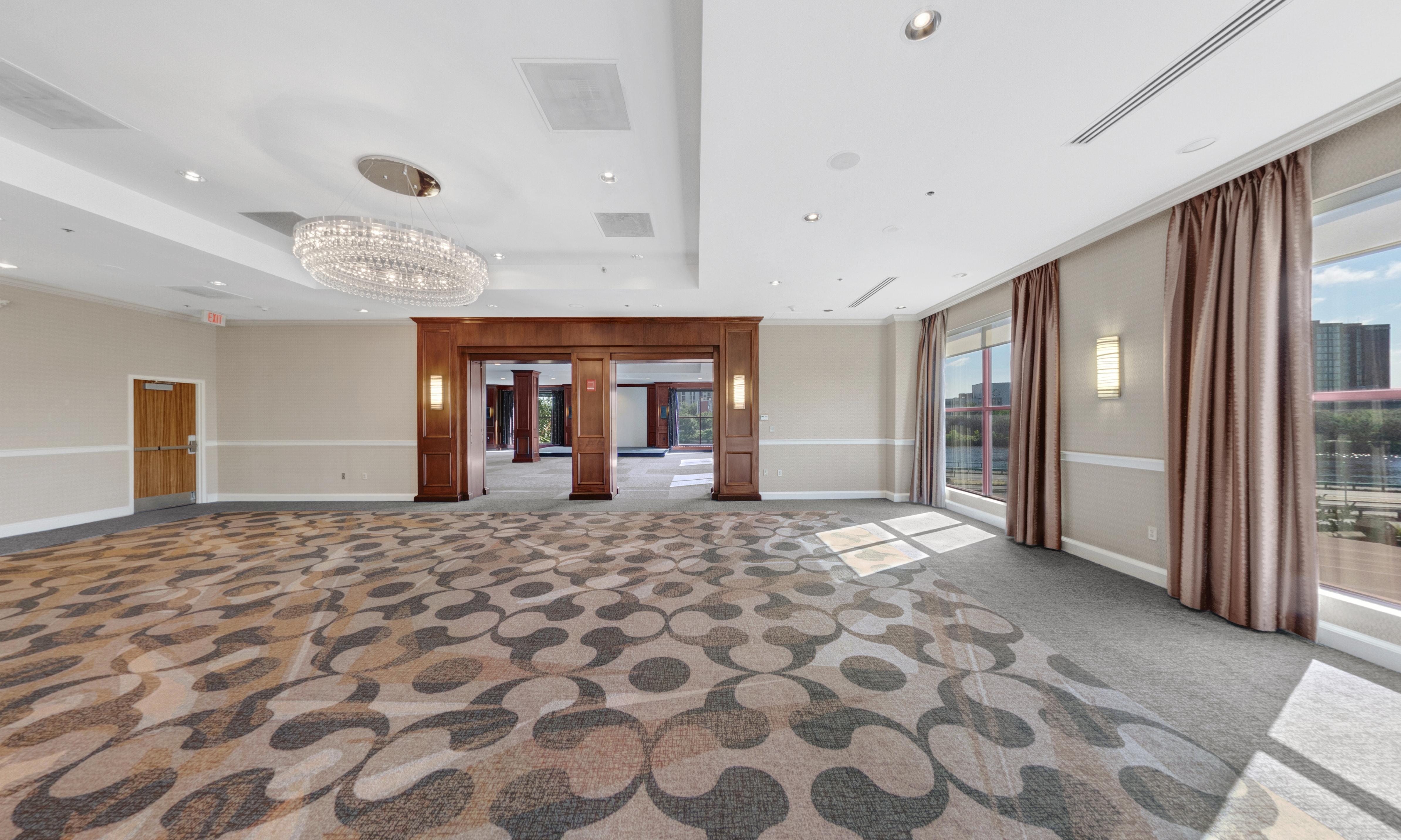 Elegant ballroom with floor to ceiling windows overlooking the Charles River.