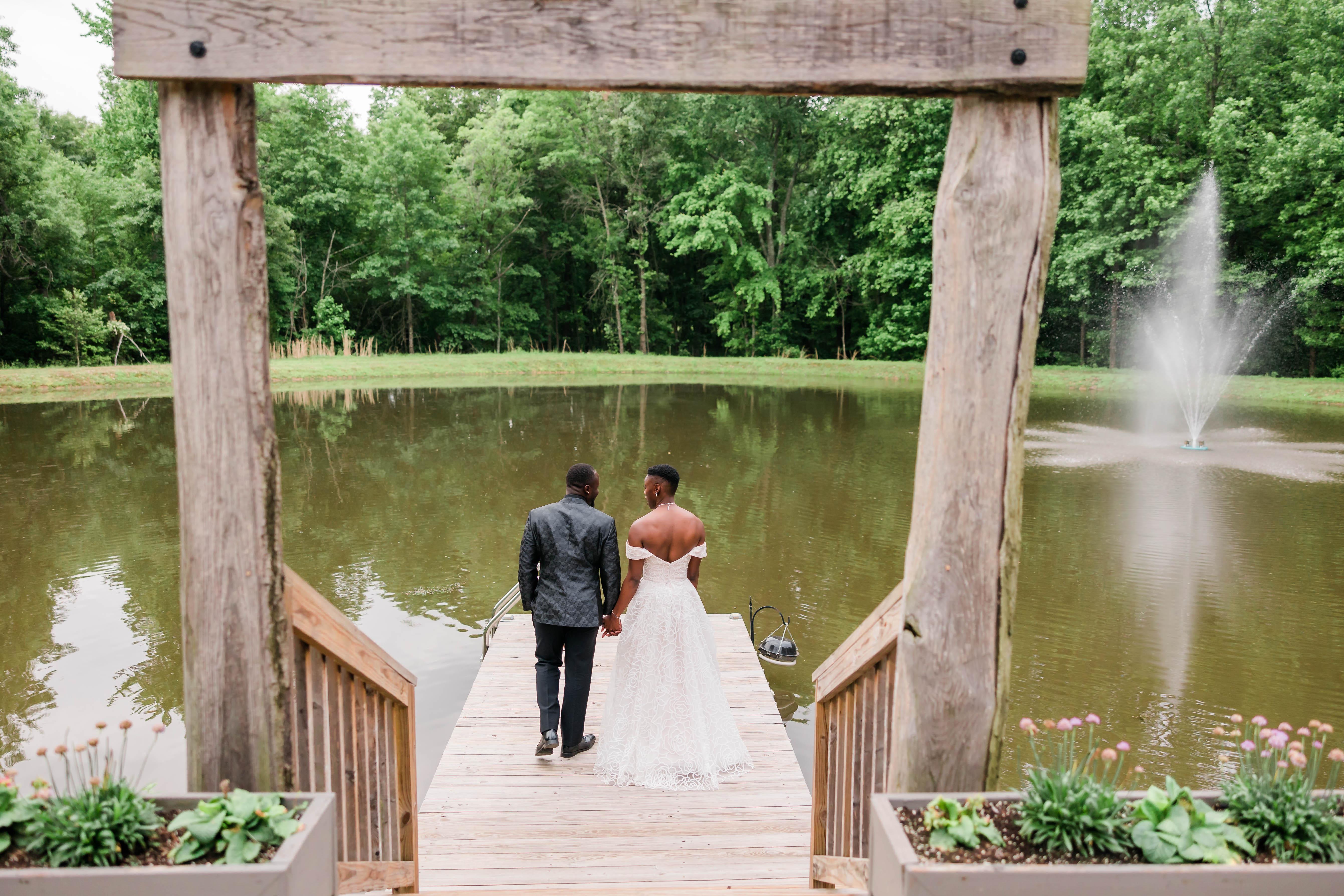 Our patio and outdoor areas have many features that will allow your wedding to break the mold! A beautiful stamped concrete patio leads out of the barn to the large deck of the cottage. Draped in string lights, this area would be perfect for your dance floor, cocktail hour, or ceremony. The 1 acre pond features a gorgeous fountain and waterfall serving as the perfect backdrop for your ceremony and photos. It also has a sand beach with a fire pit, a cozy detail you and your guests will love!