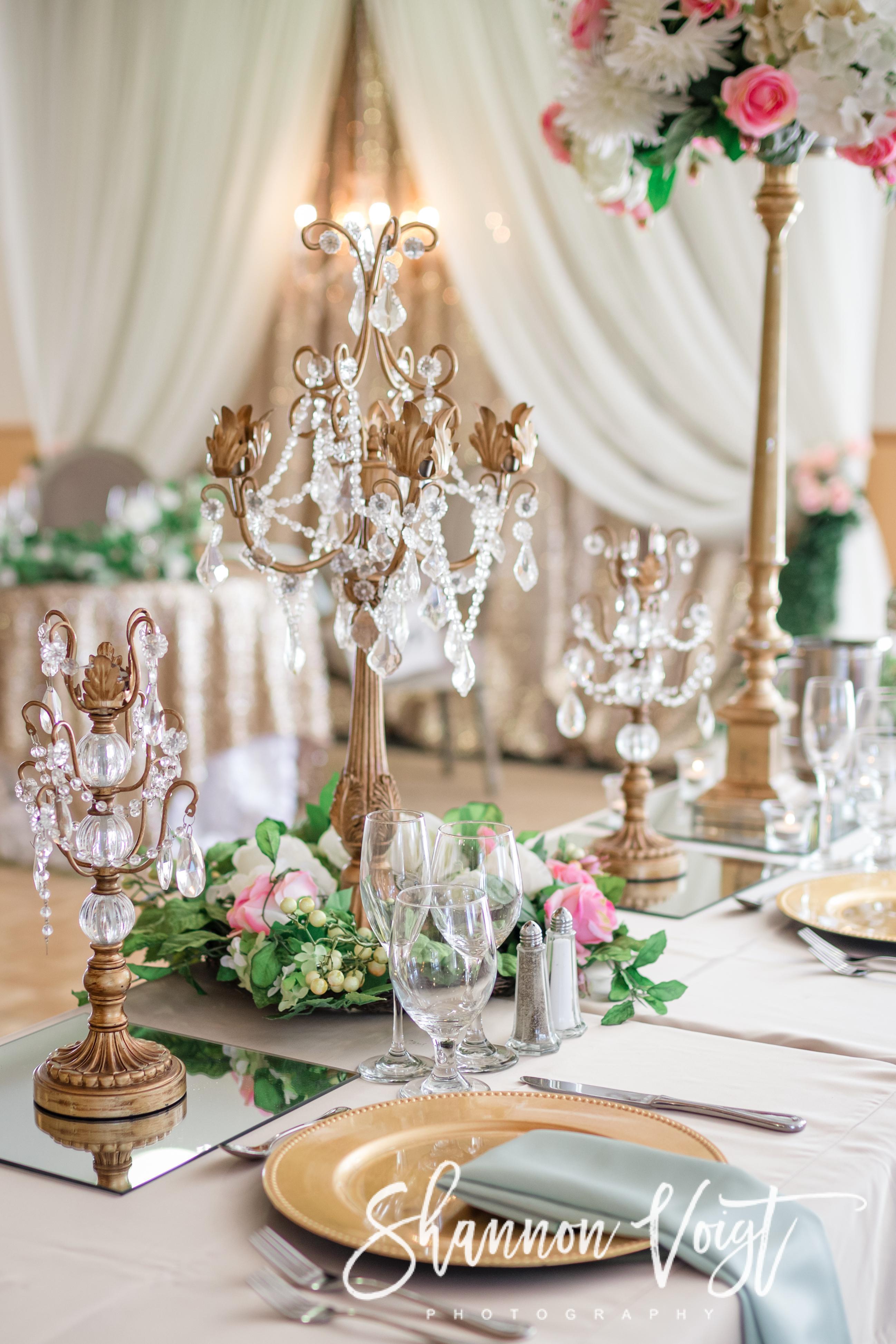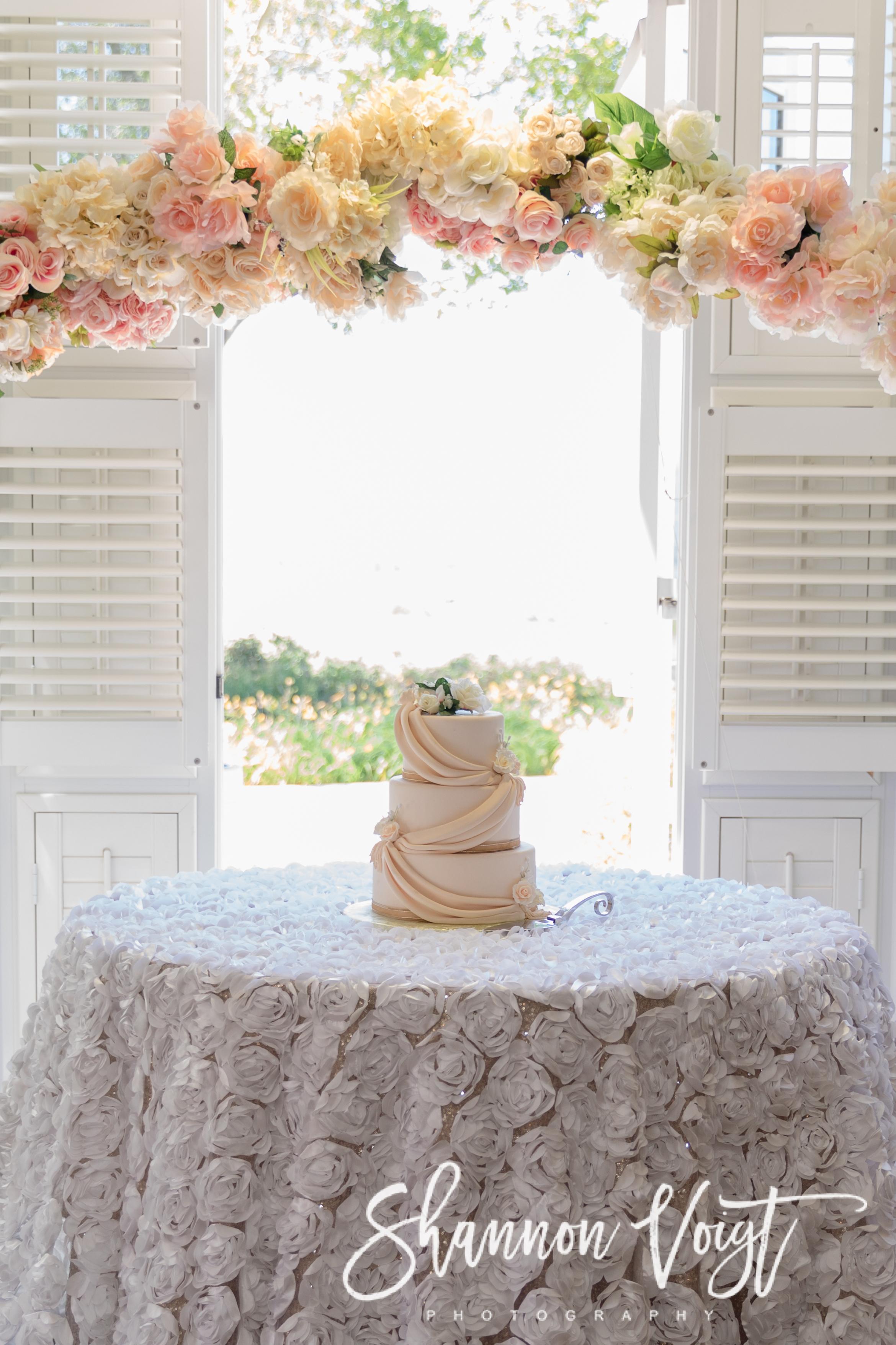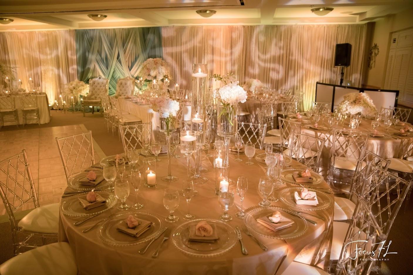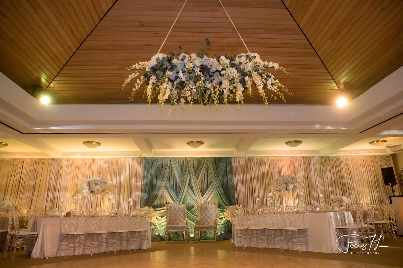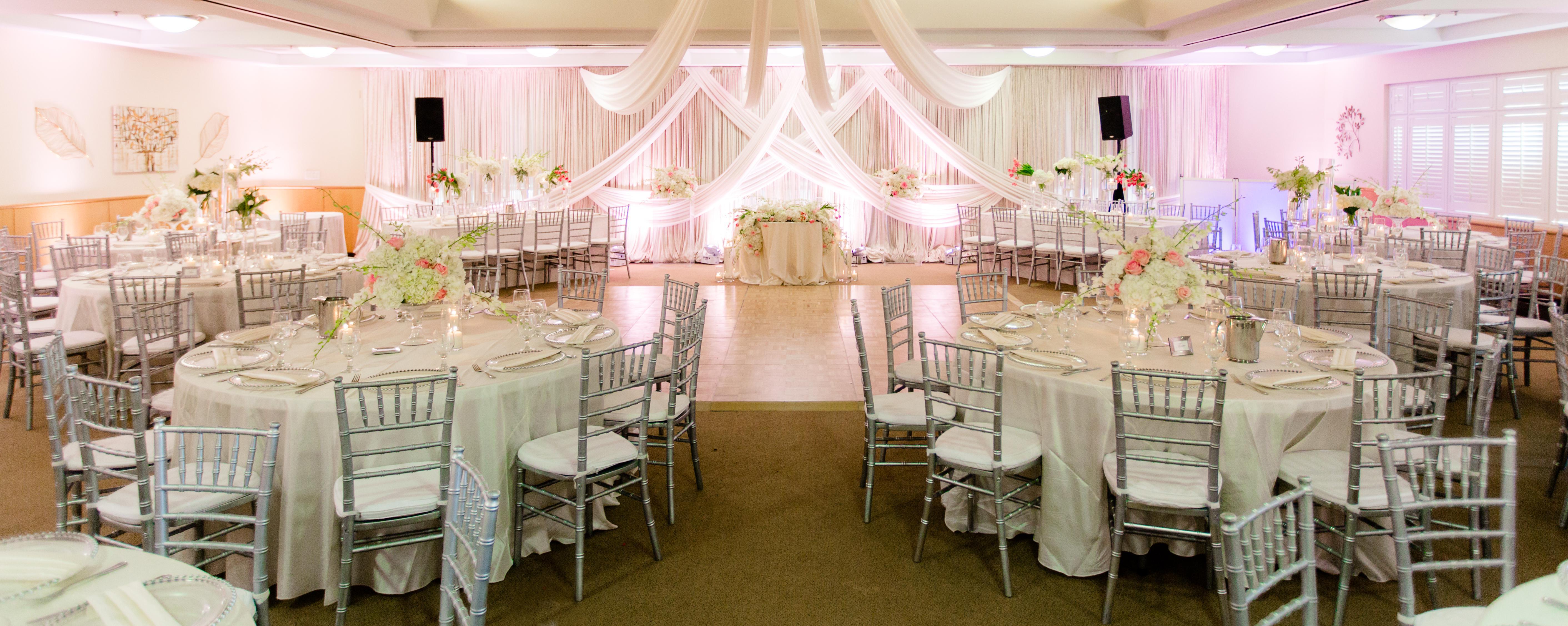This ballroom comes with coffered ceilings, draping and chandelier as well as a bay window to place your wedding cake and backdrop for the sweetheart table as well as a unique curved bar!
