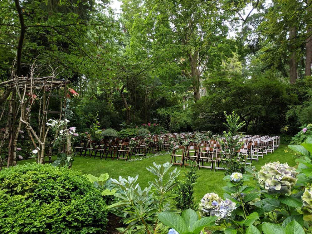 We had a 35 person wedding at Dunn Gardens in July 2024. It was absolutely amazing. Choosing the gardens was hands-down the best decision of our wedding and I cannot recommend this venue highly enough. My husband and I searched all over WA and the Bay Area for wedding venues. We were looking for: - an outdoor wedding in the woods - a space appropriate for 40 guests - the ability to host a medium fancy, catered event- like an elevated backyard wedding We chanced upon Dunn Gardens on a botanical garden website. The moment we visited, we knew it was the perfect spot for us. The space alone may be the most gorgeous, well hidden little pocket of Seattle out there. Even folks not looking to get married should check the gardens out- we visited many times in the year leading up to our wedding, and in every season, the garden is a stunning, PNW dream. This is just what we wanted: a place where we could be at peace in the trees with our guests. It was so magical day-of, and all our guests commented on how special and beautiful the venue was. Though the scenery alone is enough to set this venue apart, the rest of our experience here was also incredible. The professionalism and assistance we received from our venue coordinator, Sara, was wonderful. She helped us every step of the way (for a year!) coordinating with our outside vendors, helping us make key decisions, and solving problems for us that arose day-of with our caterers. Working with Sara was one of the best parts of our wedding process. We also loved the flexibility and access the venue provided. In addition to our Saturday wedding, we hosted a casual rehearsal dinner and nature walk at the gardens Friday night, plus a floral prep party in the garden cottage Friday afternoon. Then, after the wedding, we had Sunday and Monday to clean up. The ongoing access to the gardens all weekend was so helpful logistically and gave us more time to enjoy the space with our families. Most of our wedding took place on lawns outside (there are many little areas to set things up- we had our rehearsal dinner on the cottage lawn, ceremony on the tennis lawn, and reception on the great lawn). For our floral prep, rehearsal dinner food area, and getting ready areas, we used the cottage. We did not rent a tent since it was July (a tent would be a good idea most other months). The venue was very flexible with our choice of vendors and our timeline and vision for the event. A few restrictions that worked fine for us were the limit on the headcount (40 at the time we had our wedding), time cutoff (guests out by 9pm- this was perfect, we bar hopped in Fremont with our friends afterwards), and no microphones, speakers, or DJs (we had a keyboardist, which was great. No mics for the ceremony and toasts, which was not a problem at all). A few more helpful things the venue provided were plastic banquet tables, folding chairs, use of furniture for things like outdoor lounging and gift tables, tablecloths (casual style, perfect for the rehearsal pizza dinner), vases (used for floral prep), and chalkboard signs. We loved our wedding and we are so grateful to have had it at Dunn Gardens. I can’t imagine a more perfect place to get married. I recommend this venue wholeheartedly, and encourage any couple thinking about it to stop in for a visit. You will fall in love with this garden- we certainly did and will be back for years to come.