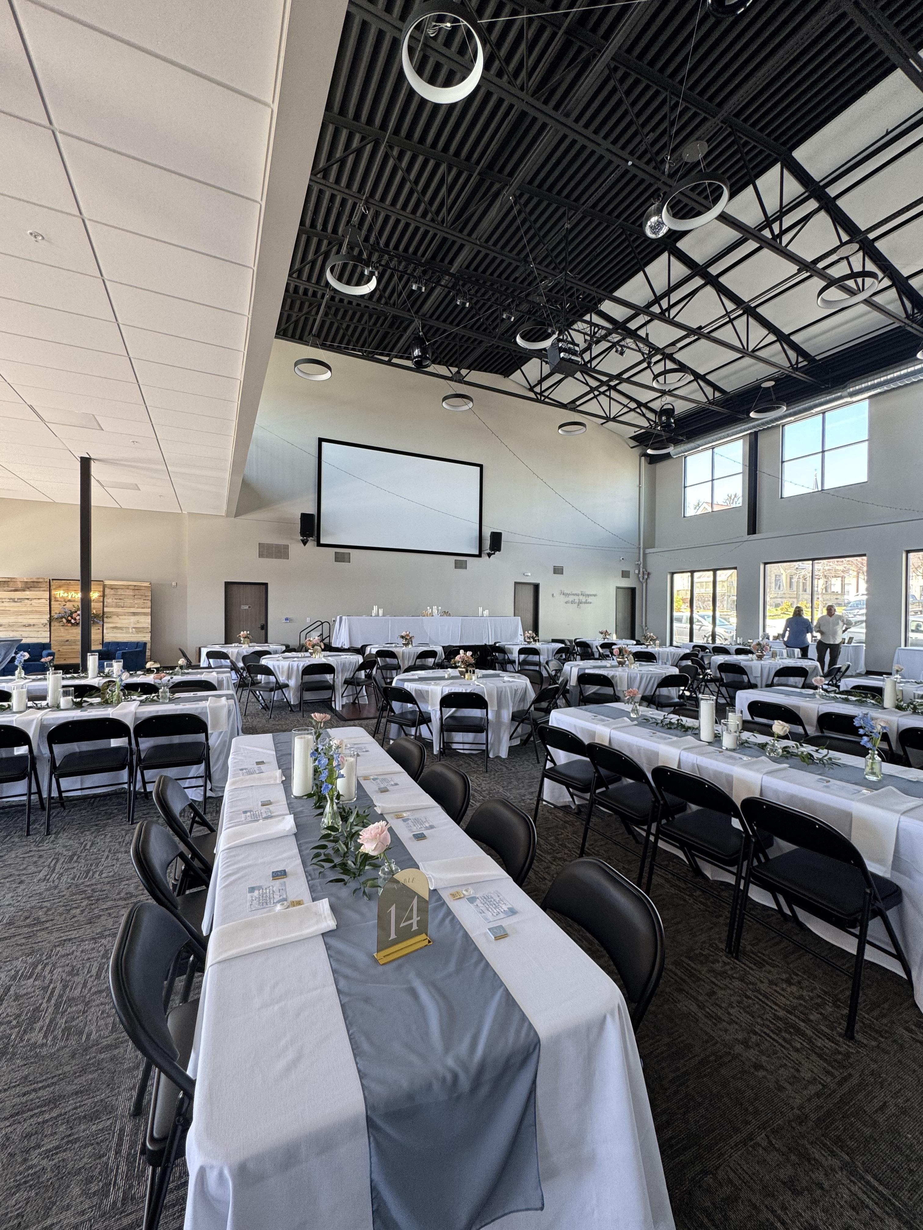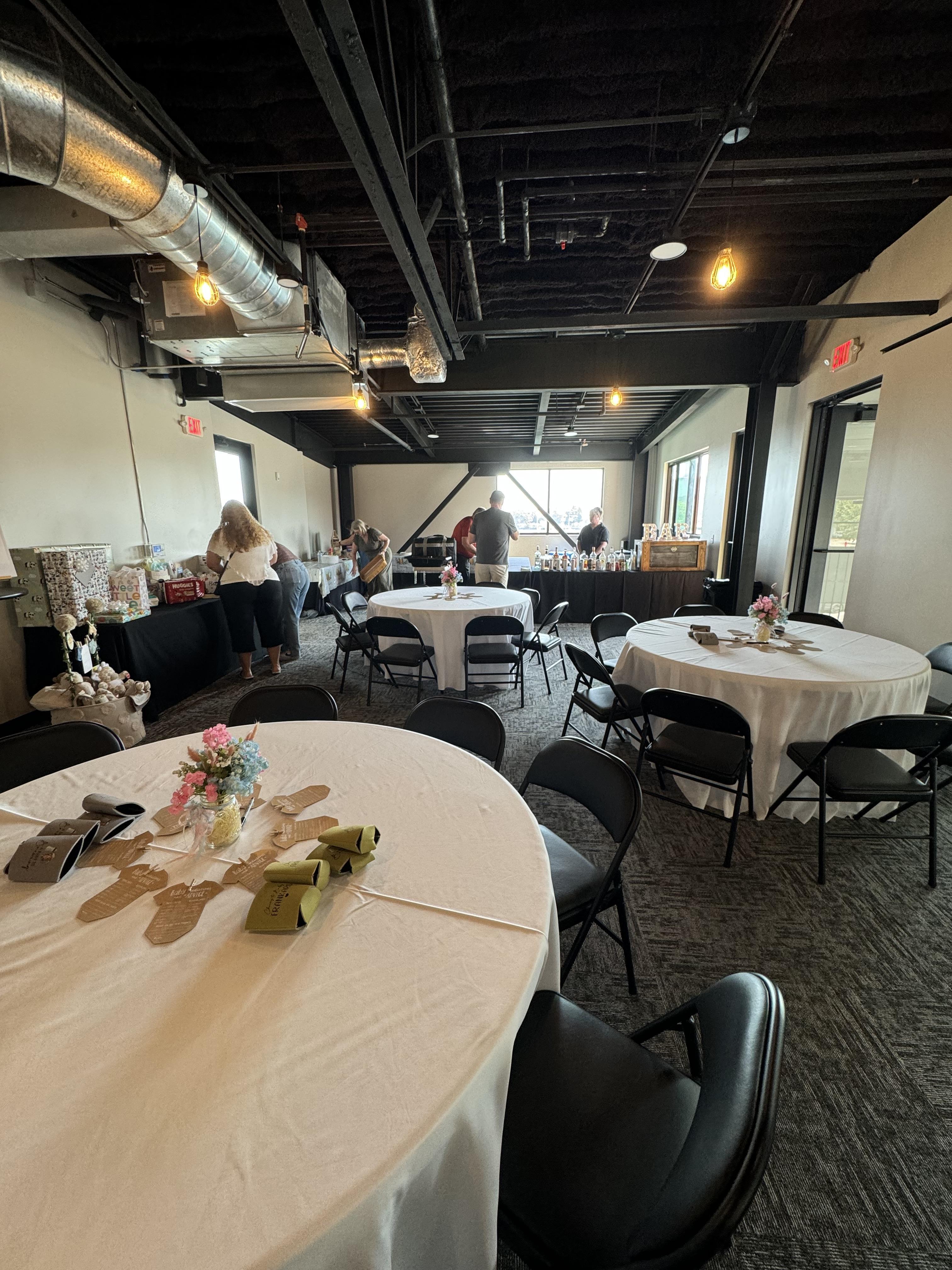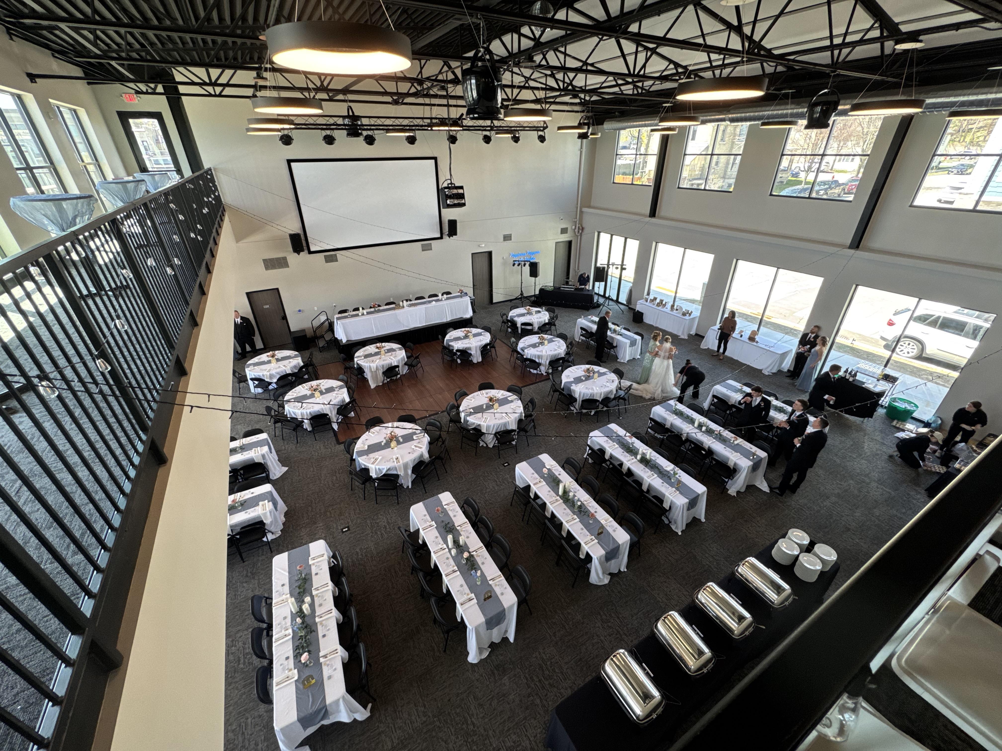 Edison Hall offers over 4,000 square feet of flexible event space, accommodating up to 250 guests for seated dinners and up to 300 for cocktail-style receptions. The open floor plan, vaulted ceilings, and industrial-modern aesthetic make it easy to transform the space for weddings, galas, corporate events, or private celebrations. The venue also features a removable stage, a dedicated bar area, and convenient access to on-site catering and beverage services.