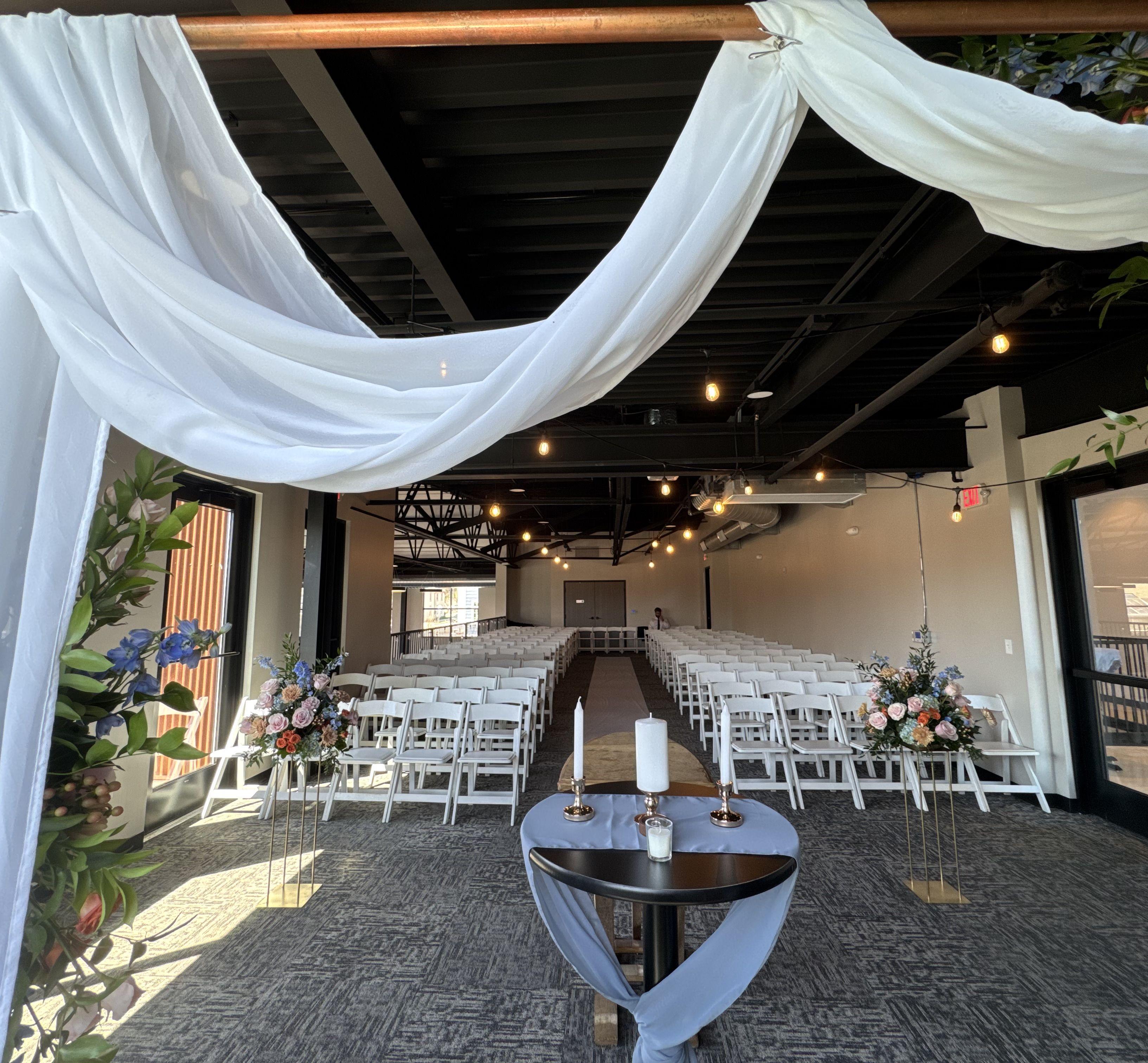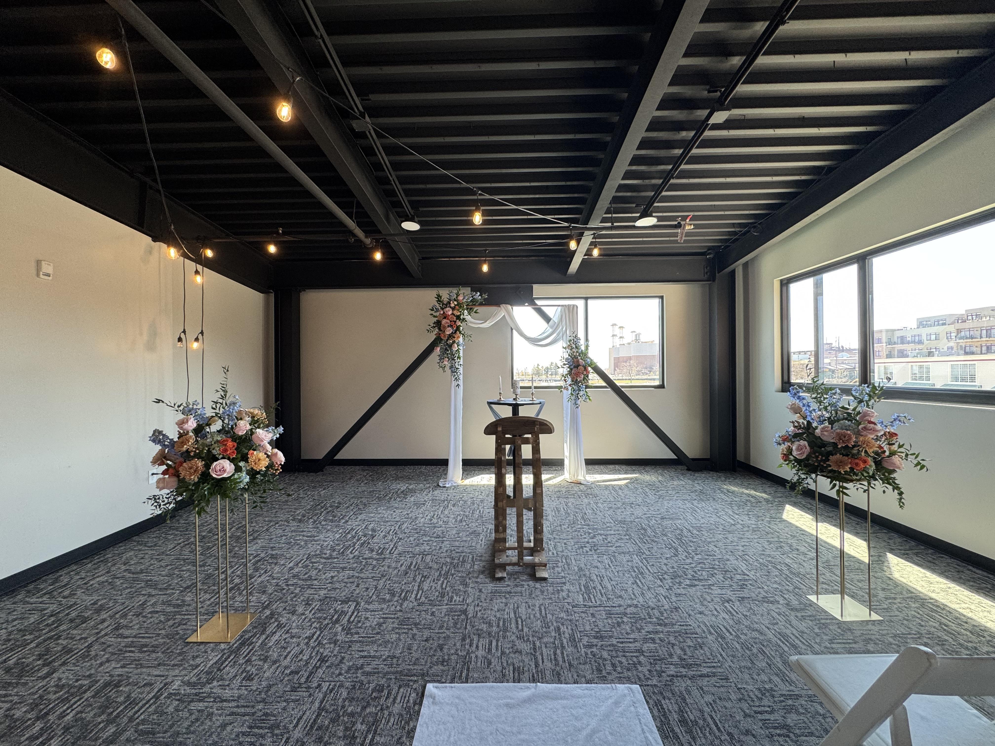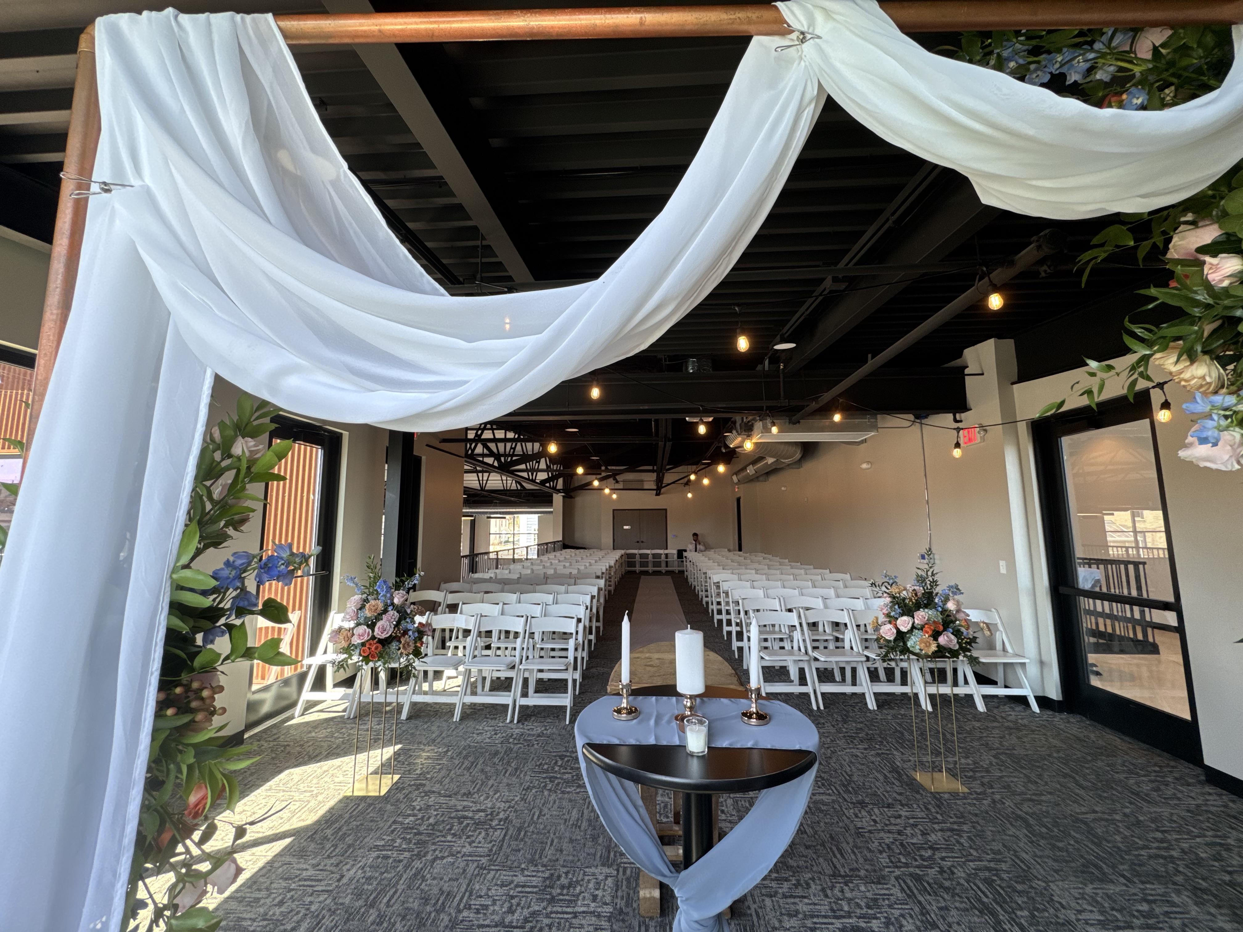 Edison Hall offers over 4,000 square feet of flexible event space, accommodating up to 250 guests for seated dinners and up to 300 for cocktail-style receptions. The open floor plan, vaulted ceilings, and industrial-modern aesthetic make it easy to transform the space for weddings, galas, corporate events, or private celebrations. The venue also features a removable stage, a dedicated bar area, and convenient access to on-site catering and beverage services.