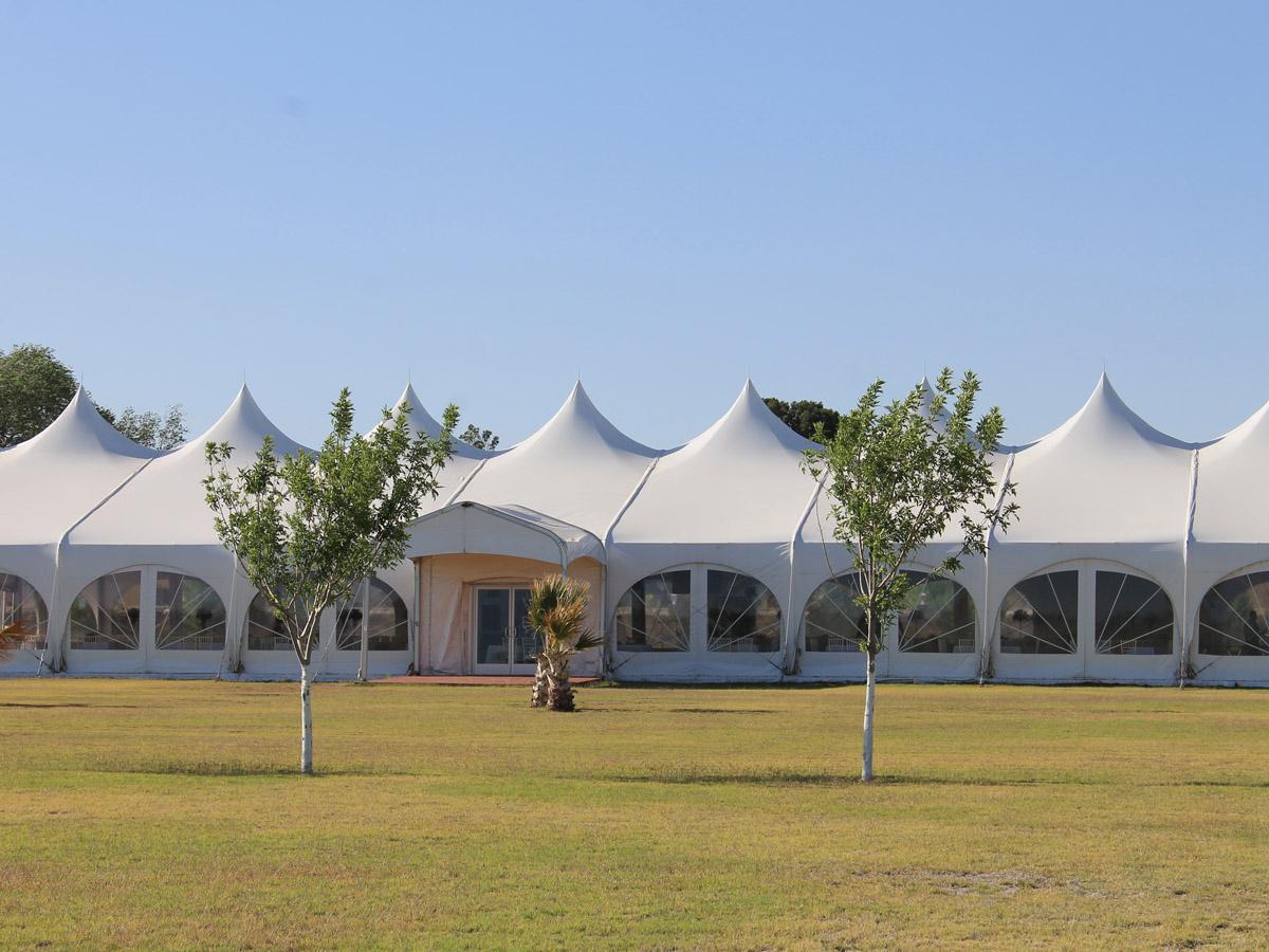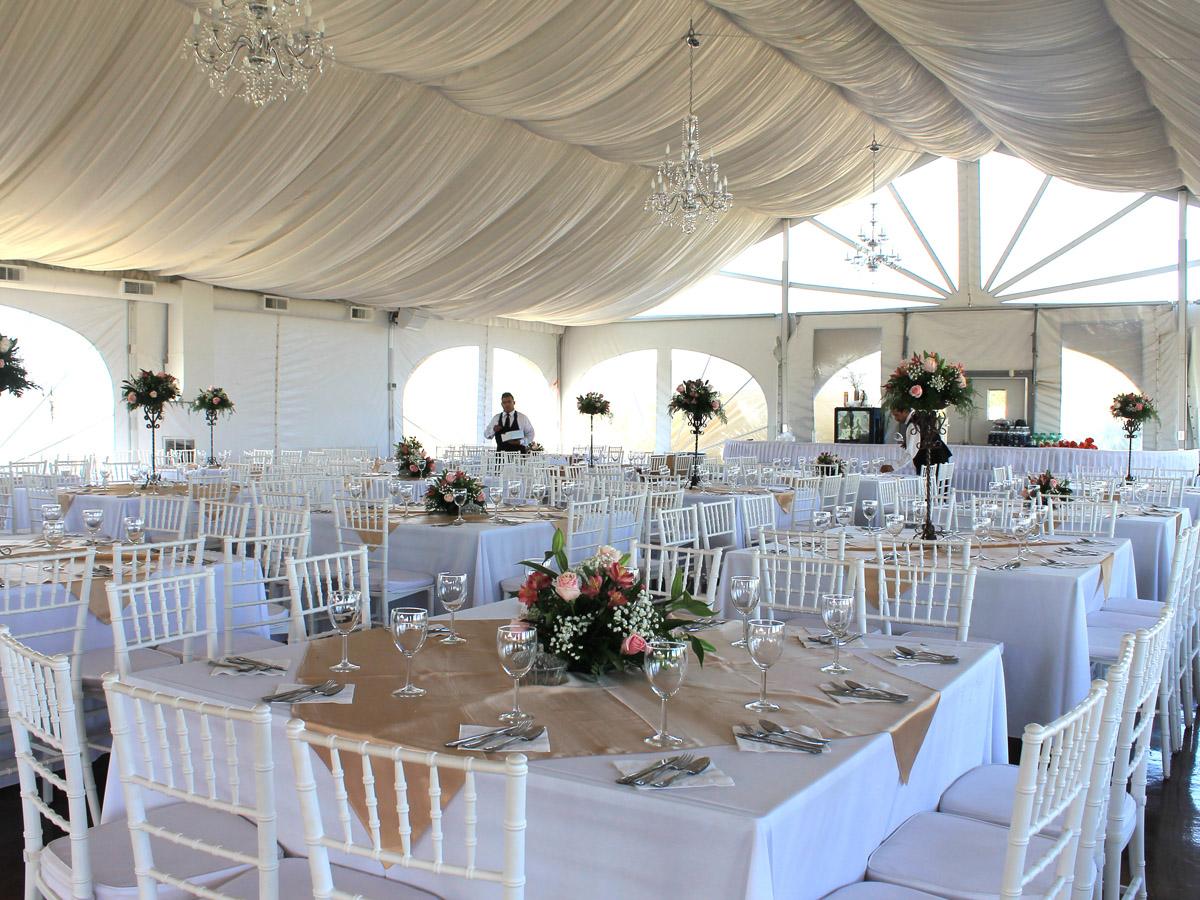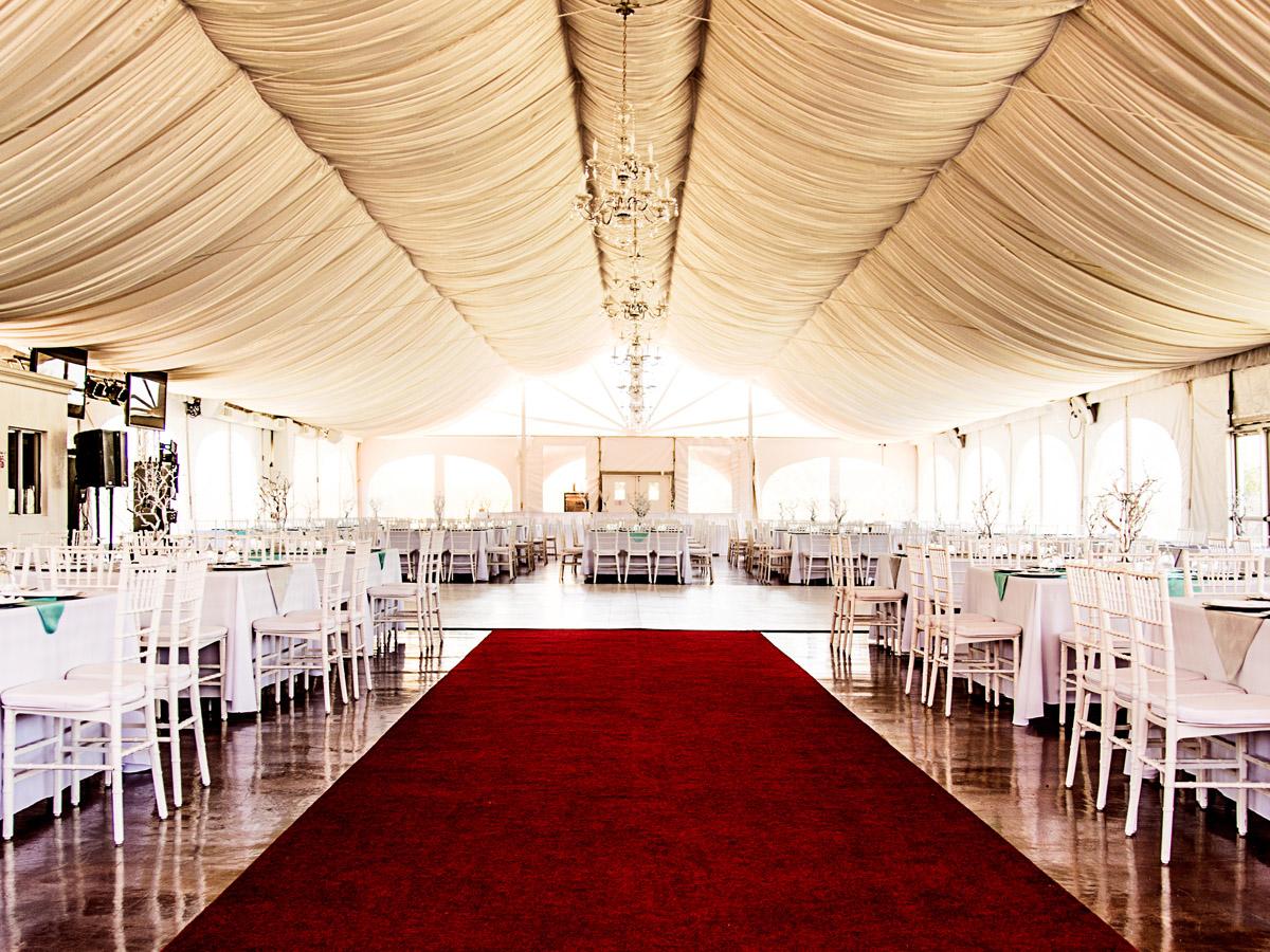 Experience the best of both worlds with our elegant Tent Pavilion. This contemporary outdoor space offers stunning views, protected from the elements by a fully sealed, climate-controlled environment. Our stylish décor includes modern square tables paired with elegant Tiffany chairs, all illuminated by beautiful chandeliers suspended from high ceilings. State-of-the-art sound and lighting systems ensure a truly unforgettable experience.
