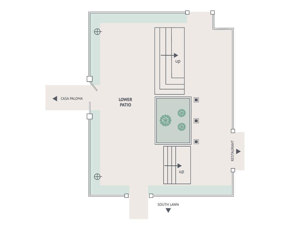 The Lower Patio at El Chorro offers a serene, semi-private retreat enveloped by lush foliage and natural charm. This intimate, woodsy setting creates a peaceful backdrop for smaller wedding events, from welcome cocktails to heartfelt ceremonies and dinners.