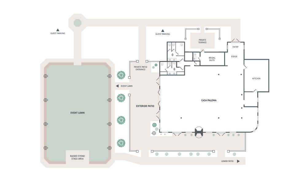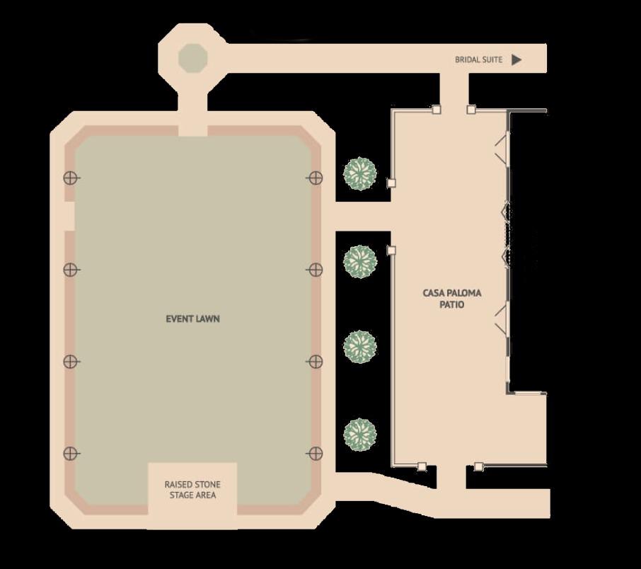 Casa Paloma offers a unique pavilion setting that perfectly balances spaciousness with an intimate atmosphere. Designed for larger groups, it opens onto a series of charming patios, fireplaces, and lush gardens, infusing every event with a touch of whimsy and romance. Ideal for both receptions and cocktail gatherings, this venue creates a magical ambiance for your special day.