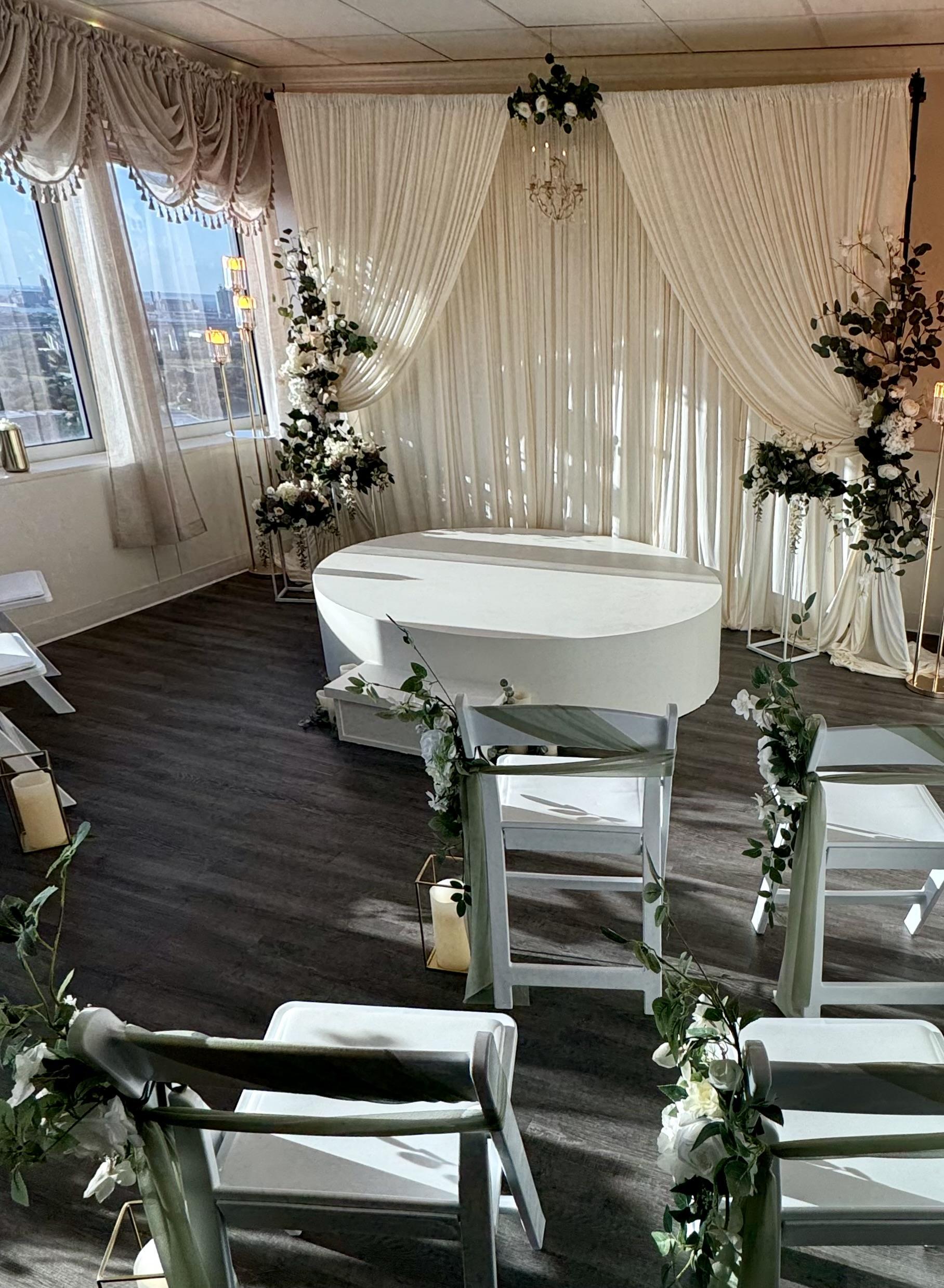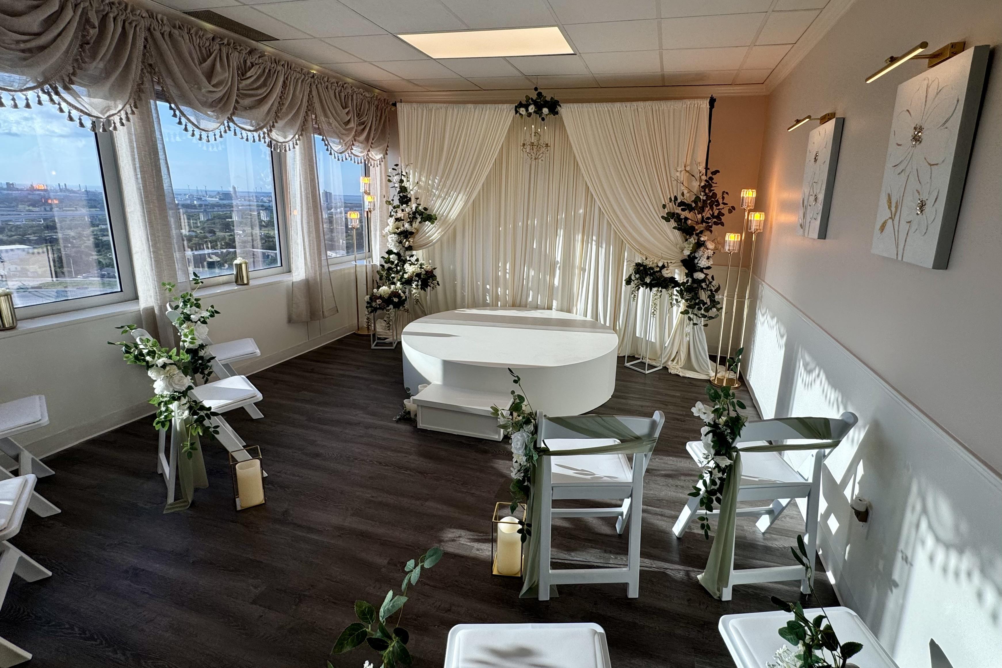 Our venue is located on the 17th floor overlooking the gulf in the heart of downtown Corpus Christi. We’ve created a serene and romantic atmosphere, perfect for an intimate elopement ceremony or a micro wedding. With a touch of sophistication and grace, our intimate venue offers a unique experience unrivaled by traditional quick weddings. Come step into a world where your special day is celebrated in a setting of pure elegance, designed to create memories that last a lifetime. Come visit our elegant chapel today!
