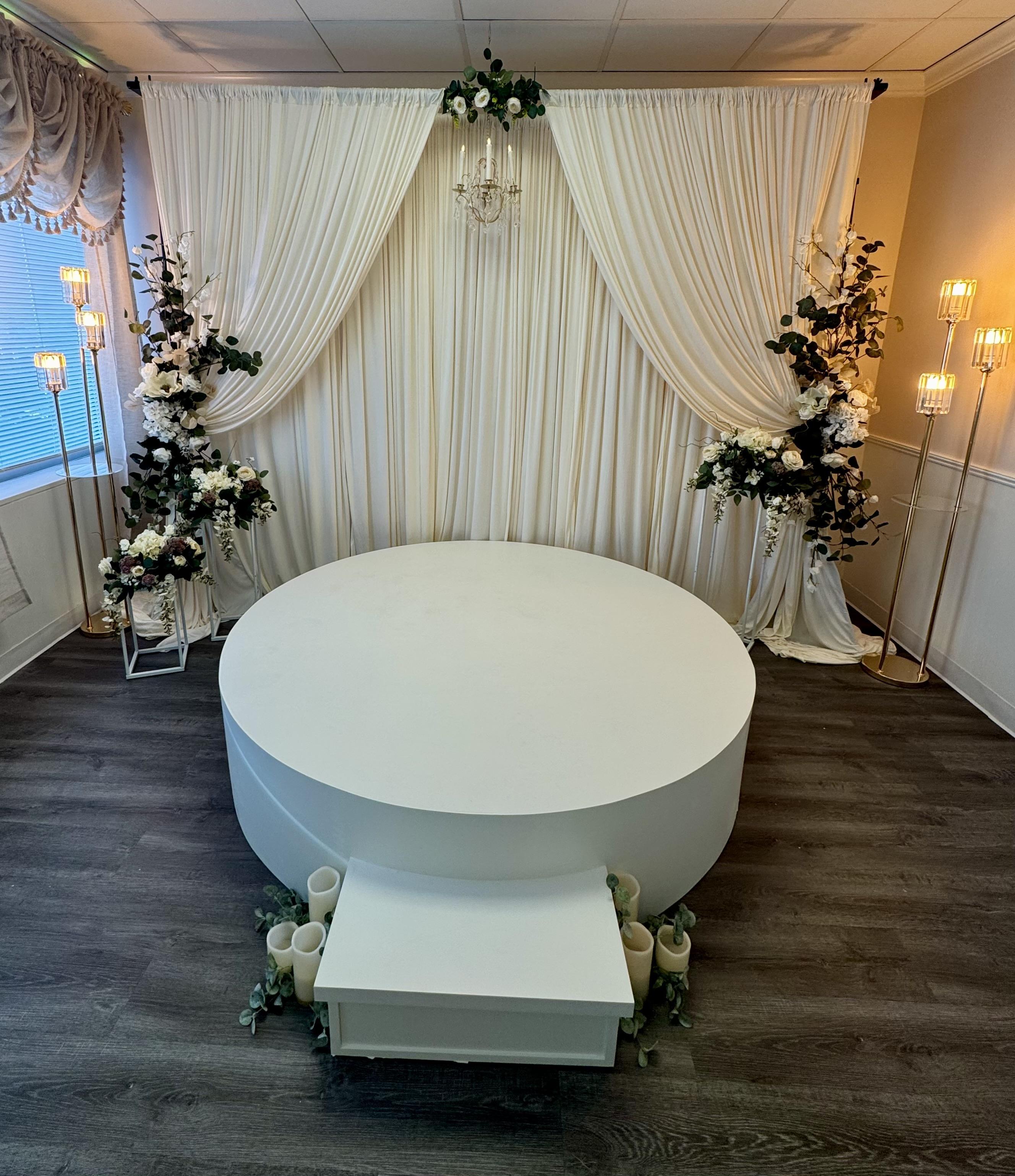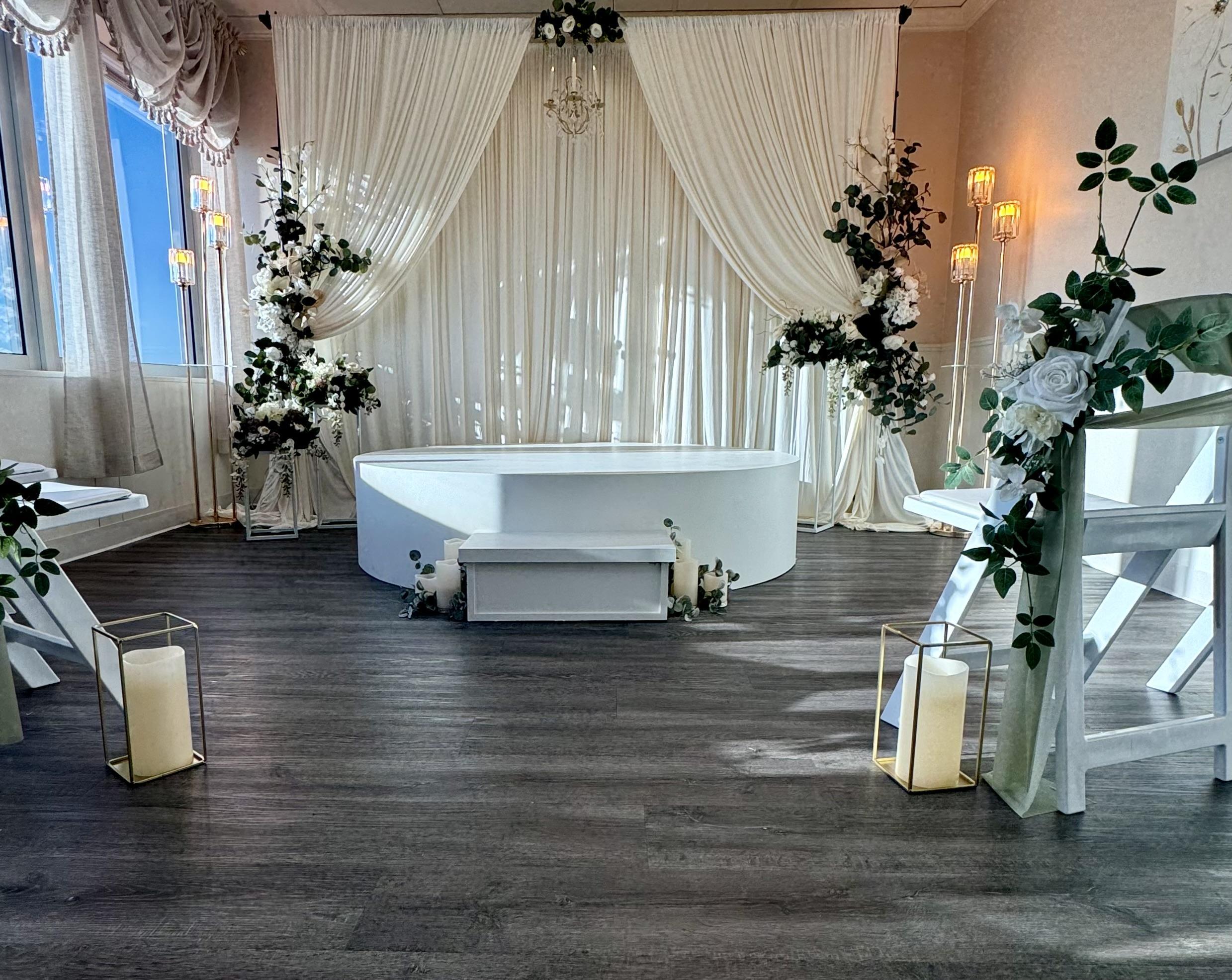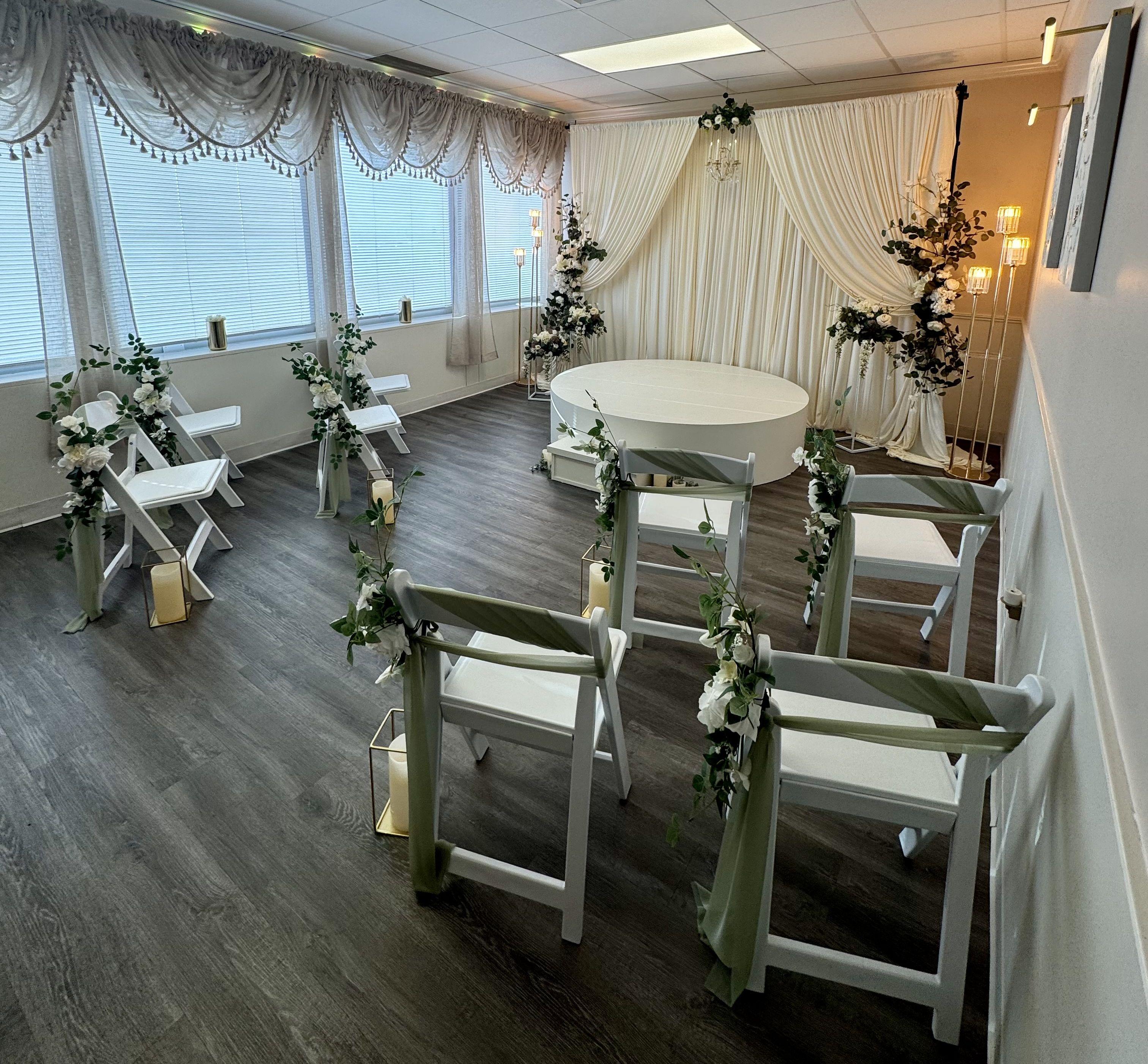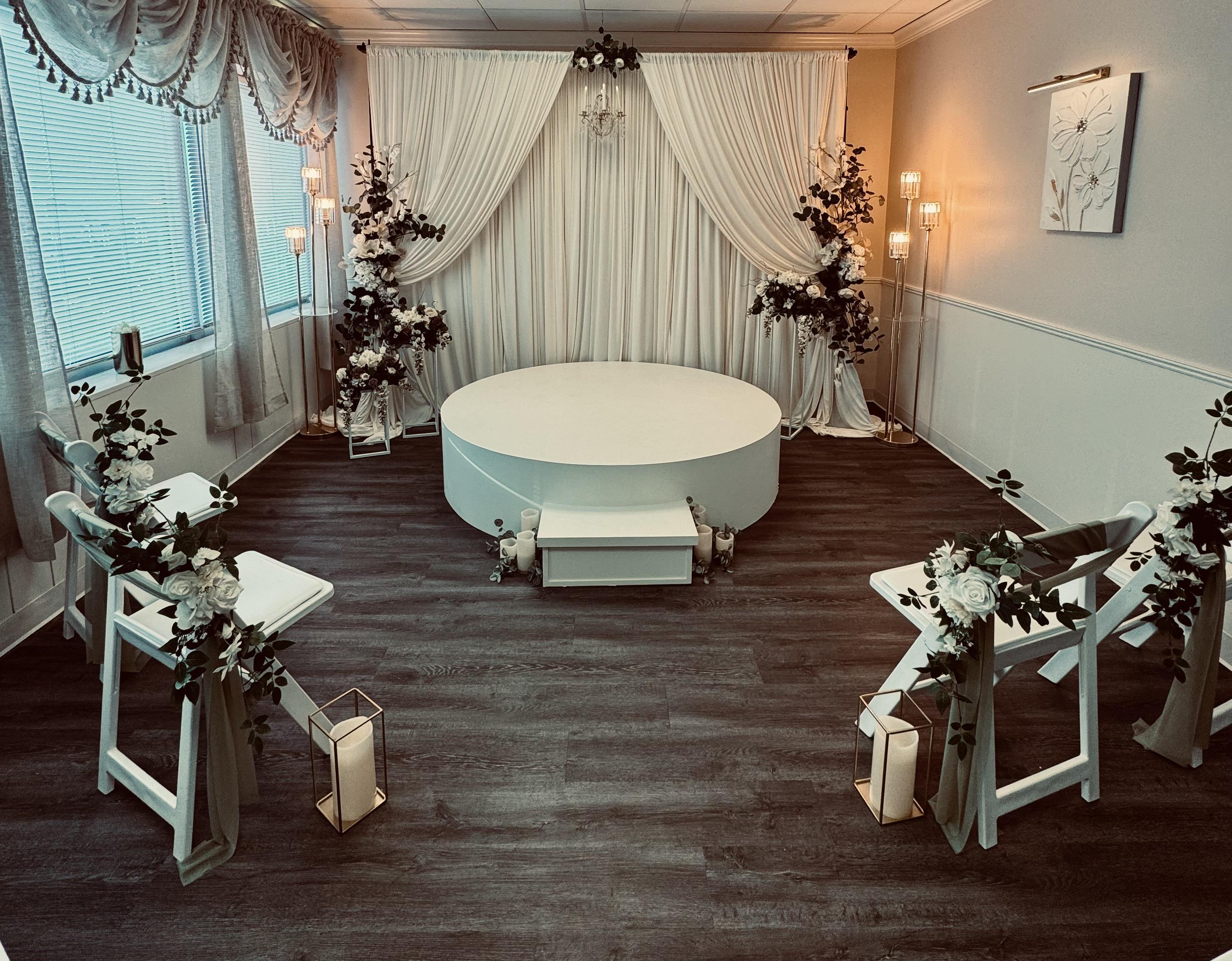- Backdrop curtain with optional dimmers - Beautiful dropdown chandelier - Dimmers and lighting throughout with optional settings -Optional Bluetooth speaker with classical music perfect for a wedding - Beautiful floral arrangements and candles throughout the venue - Elegantly decorated chairs for up to 8 guests - Round platform for couple