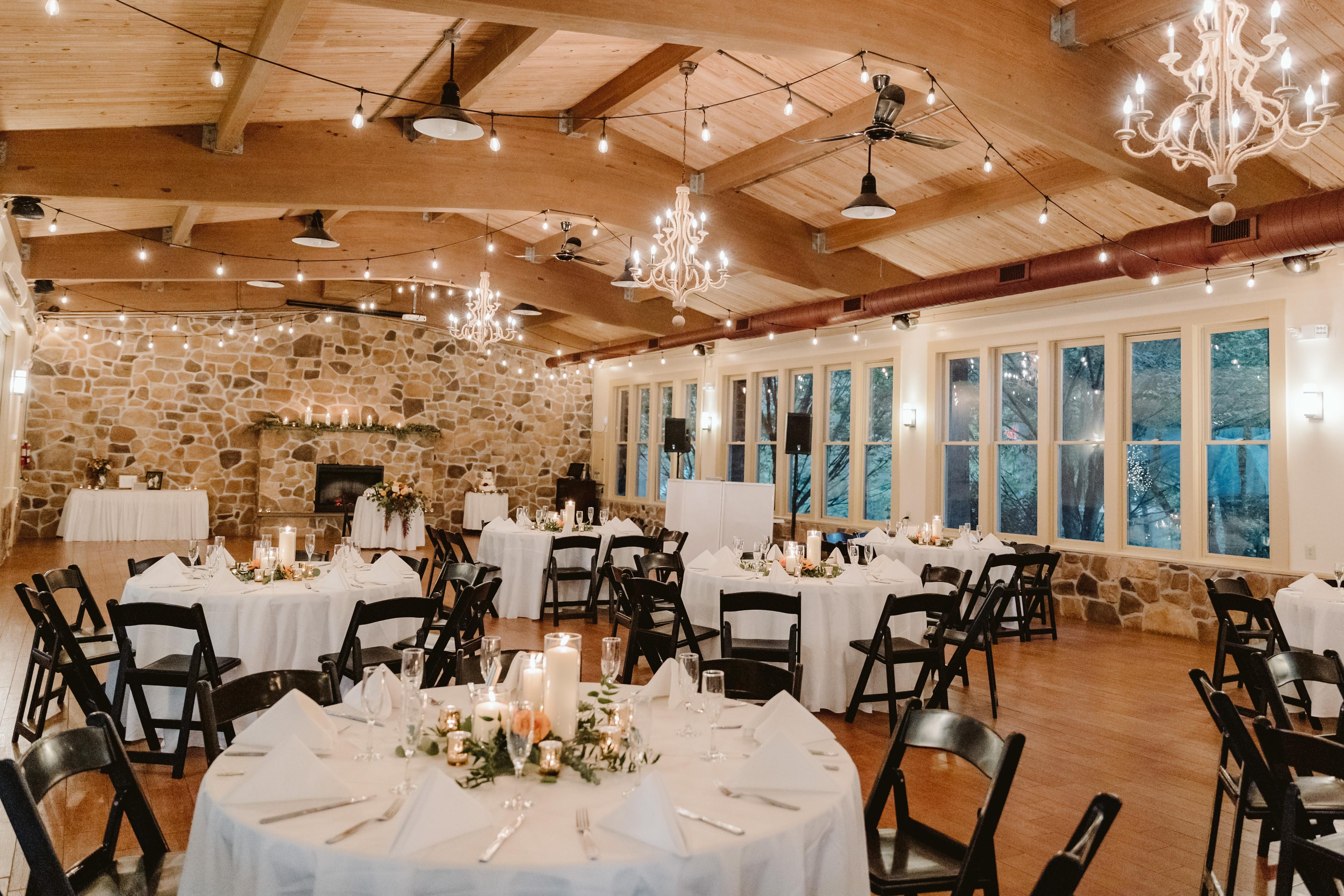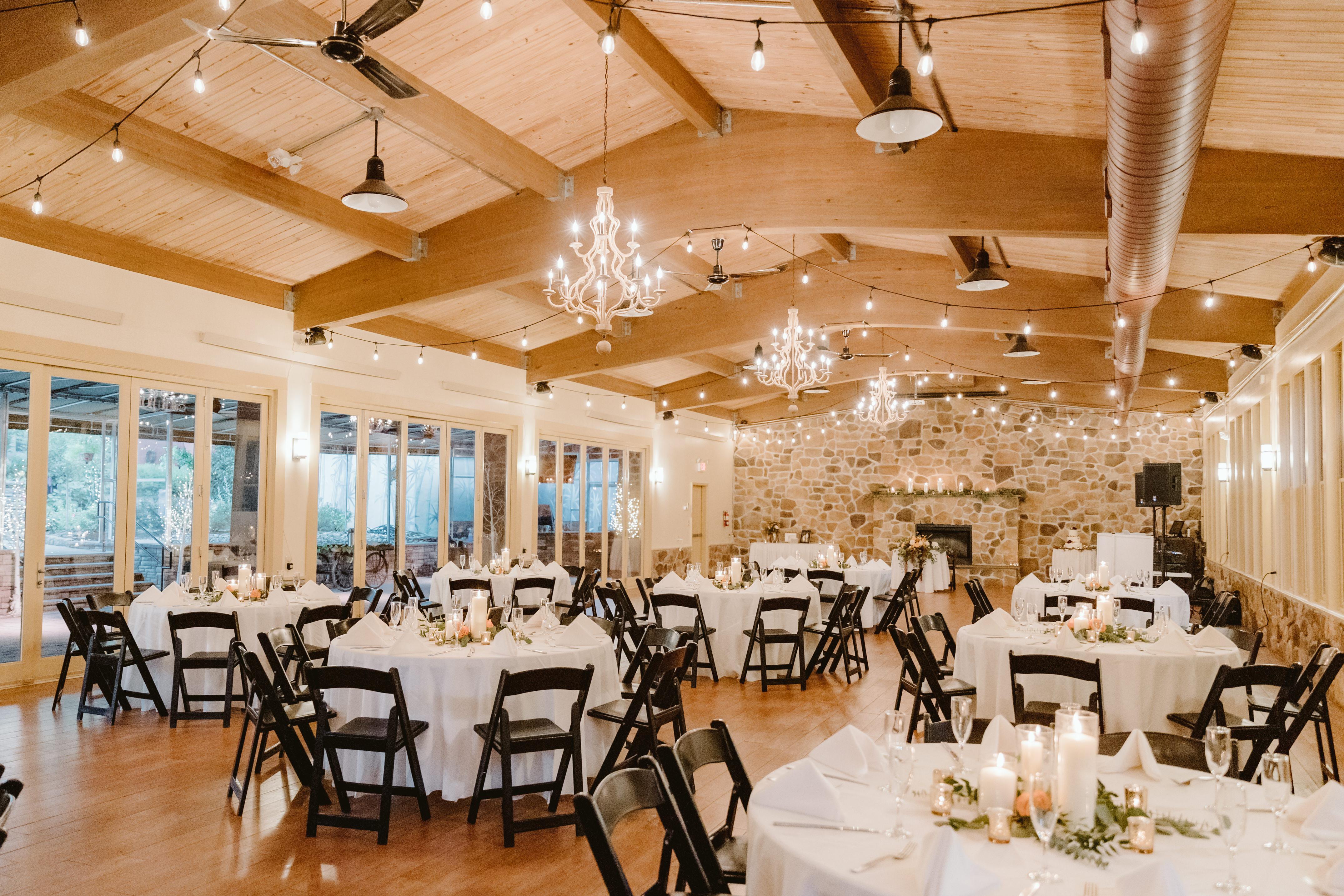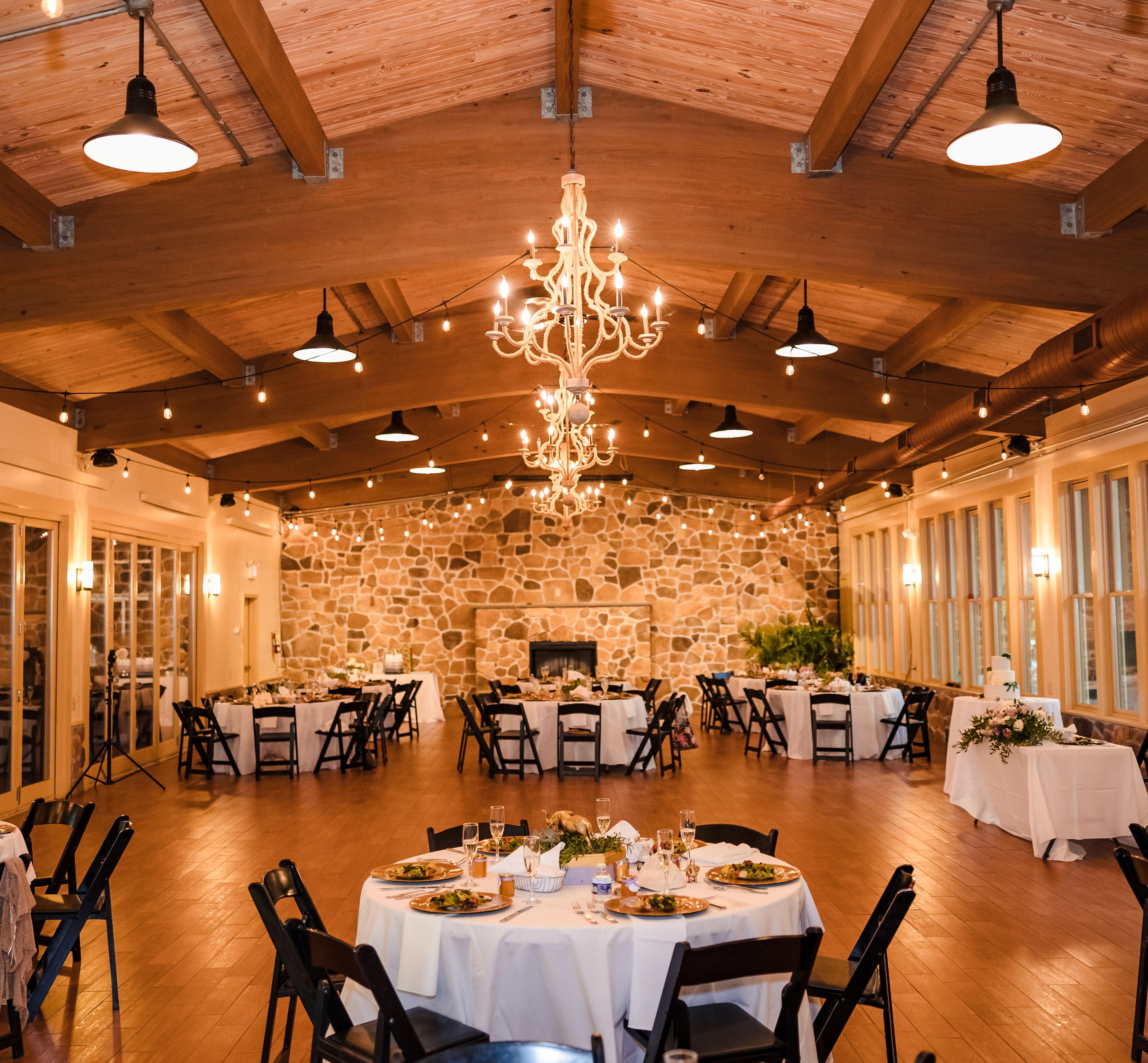 Our beautiful premier indoor event space can seat up to 150 guests, complete with a dance floor and room for catering services. The space features a full stone accent wall, along with wood-accented flooring and ceilings, making for an elegant lodge-like feel. It also has retractable, floor-to-ceiling glass doors along the garden side of the pavilion, giving the option of open access to the adjacent patio and garden area.