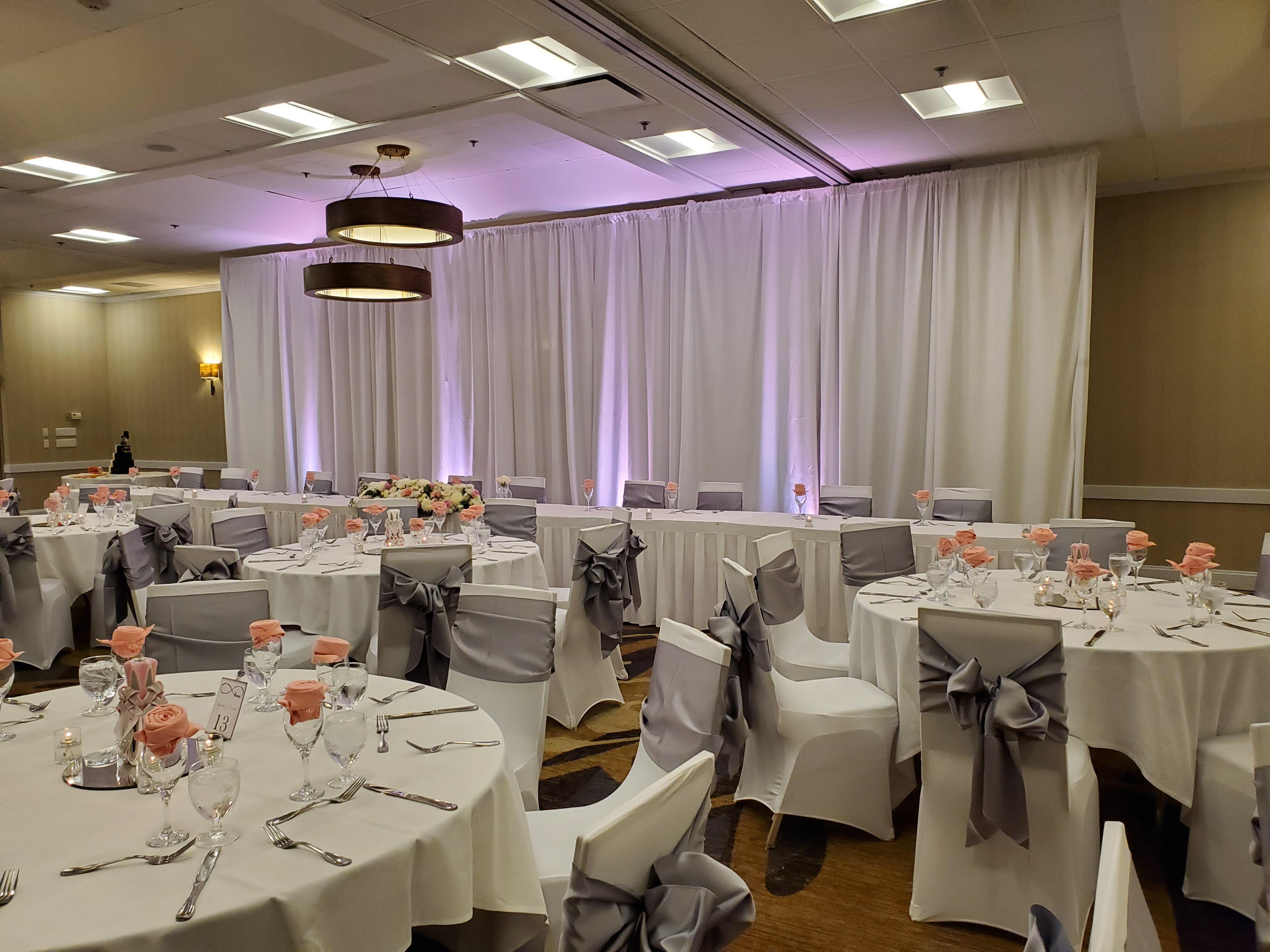 - Dimmer Lighting - Optional Chandeliers - 60” round tables seating 10 per table - head table or sweetheart table with white pipe and drape - variety of linen and napkin colors to choose from - china, silverware, glassware, toasting coupe champagne glasses - wooden dance floor - use of hotel centerpiece items: up to three votive candles per table, vases and round 12” mirror tiles - silver cake cutter - cake and place card table - professional banquet staff