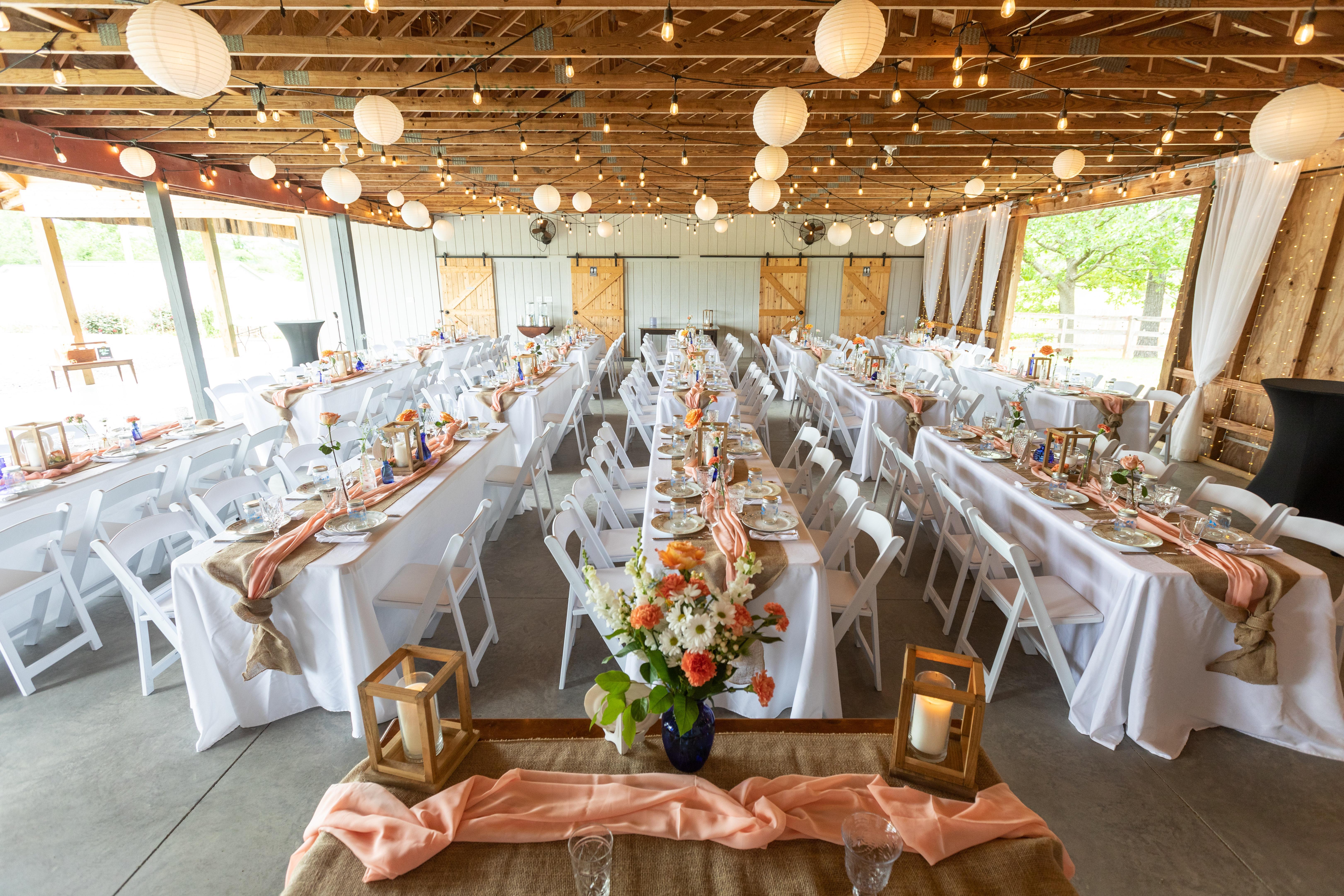 Guests enjoy 50 mile mountain views with fantastic sunsets, two porch swings, a hammock and a variety of games spread across the lush green spaces surrounding this event area. Our chic modern barn - reception hall is outfitted with multiple areas for bar, bands and DJ's. 4 (four) bathrooms, distinct tables for Sweetheart, Welcome, Beverage, Coffee, Favors & Dessert. Tables, chairs, tablecloths, napkins, vintage mix/match China, flatware, glassware, set up and clean up included. And more!