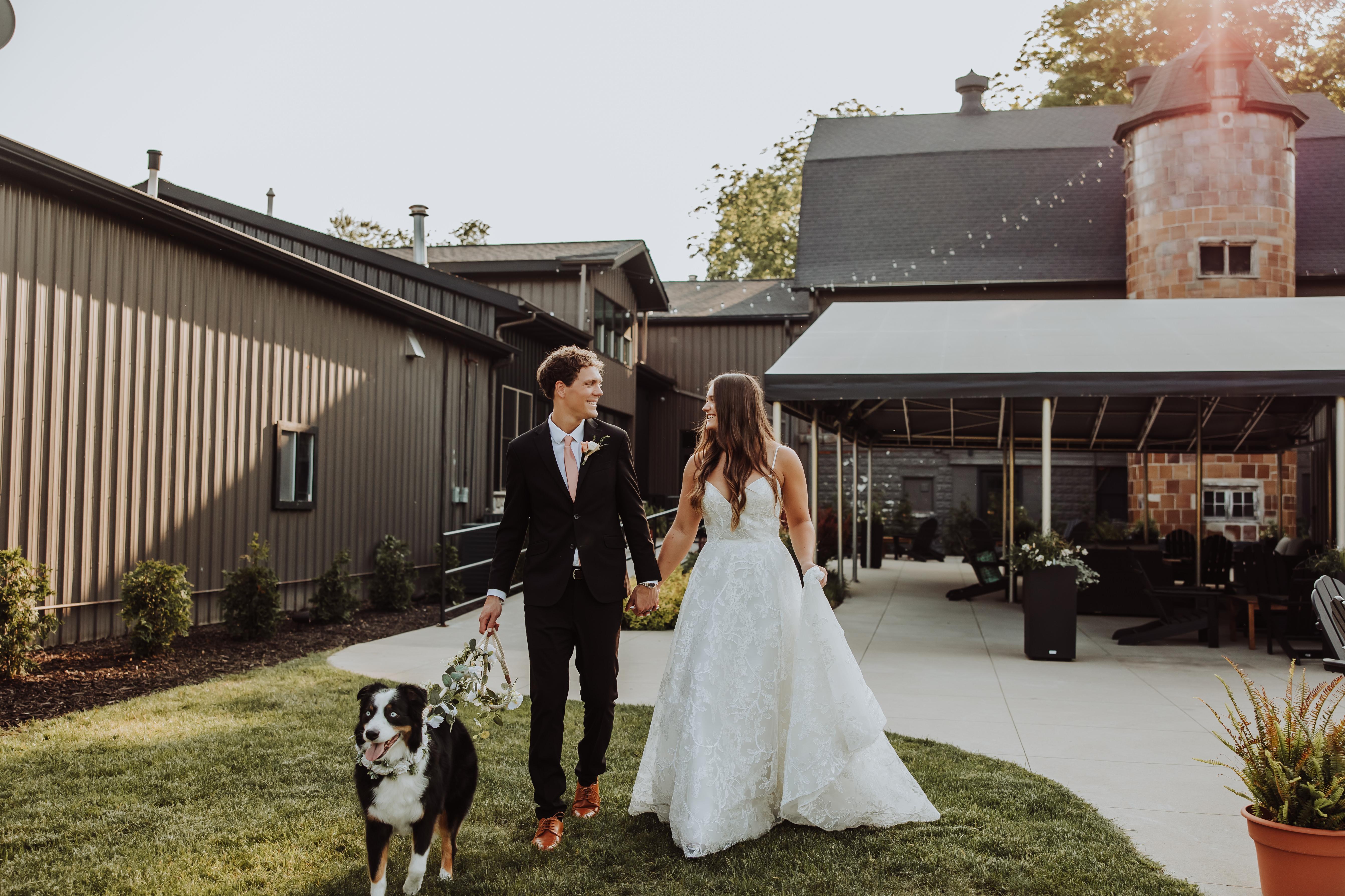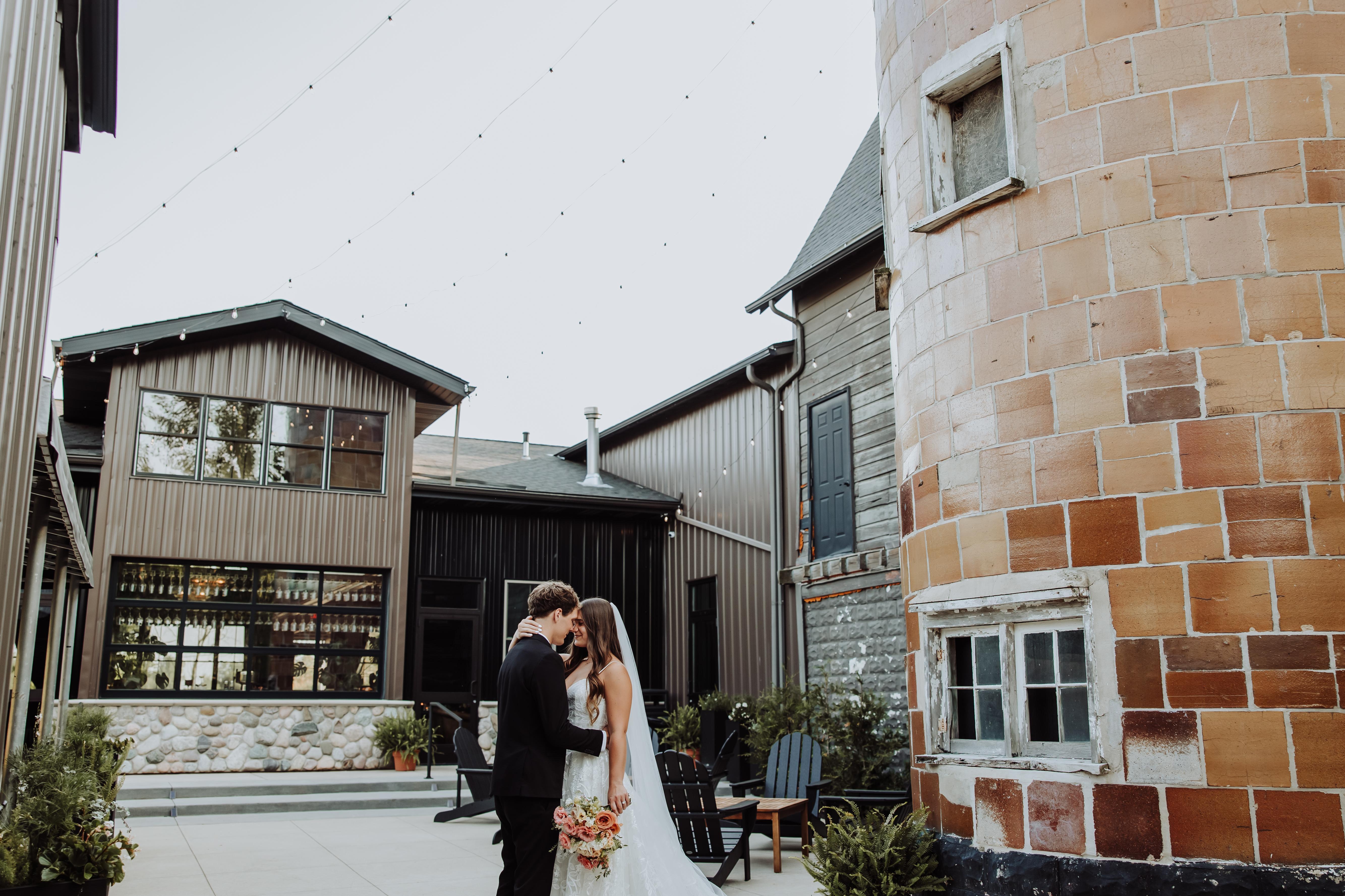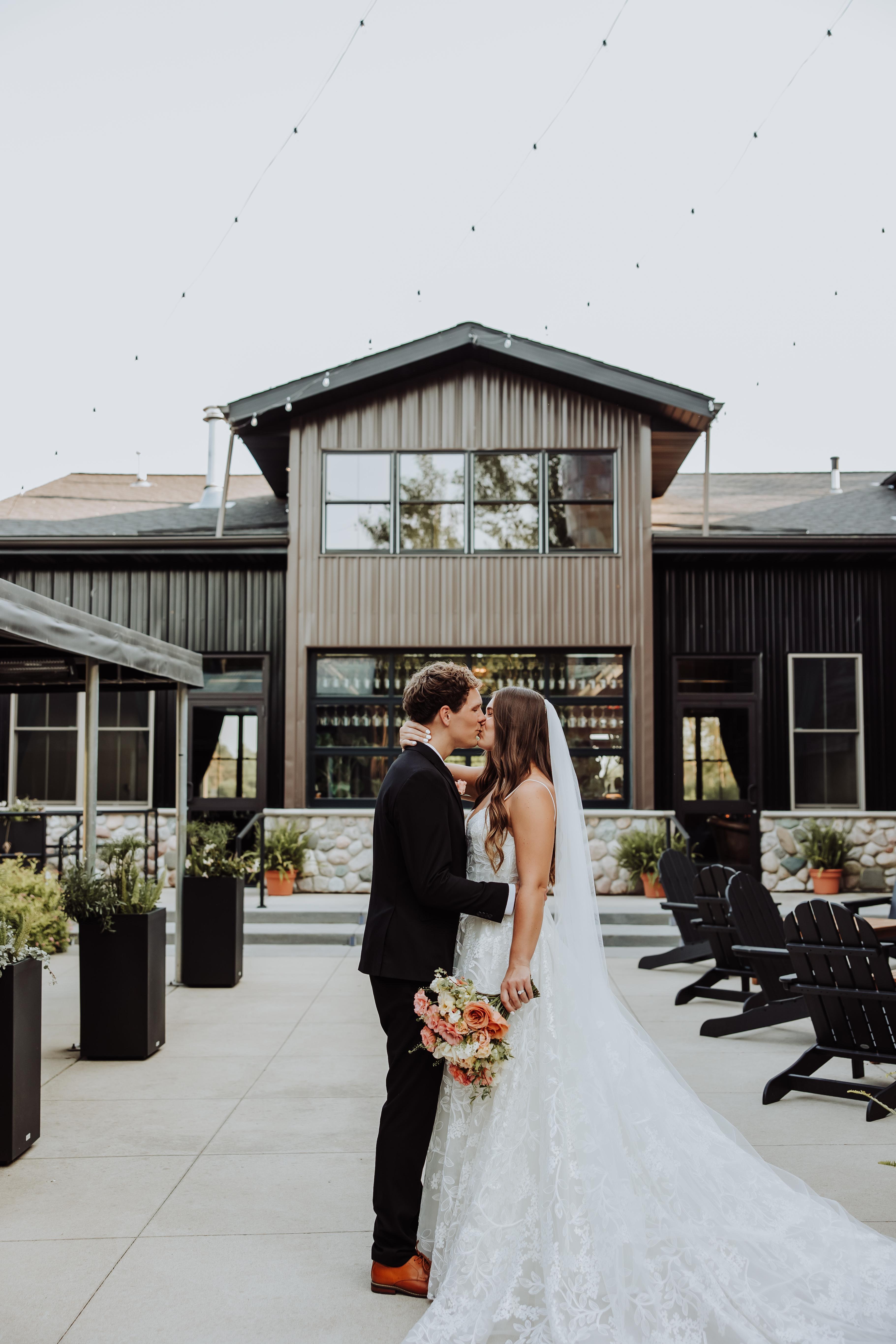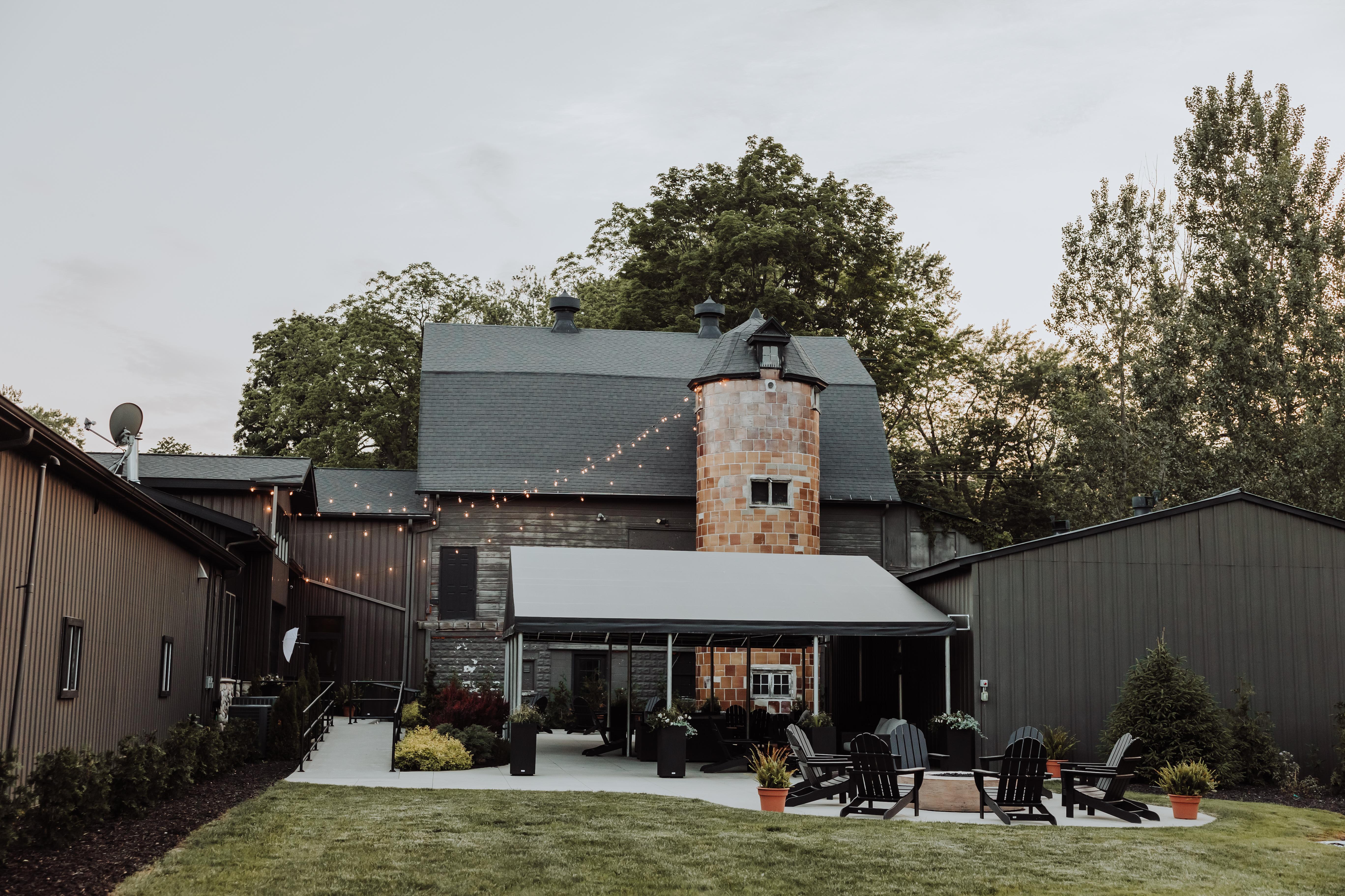 The Enclave offers a relaxed yet refined setting with a covered patio, cozy Adirondack chairs, a silo backdrop, gas firepit, outdoor bar, and sprawling lawn—ideal for cocktail hours, lawn games, or starlit celebrations.