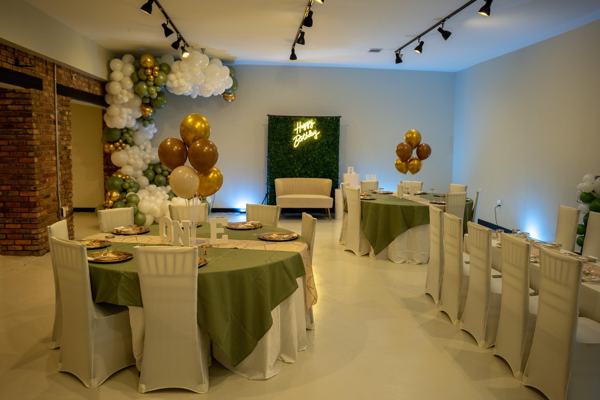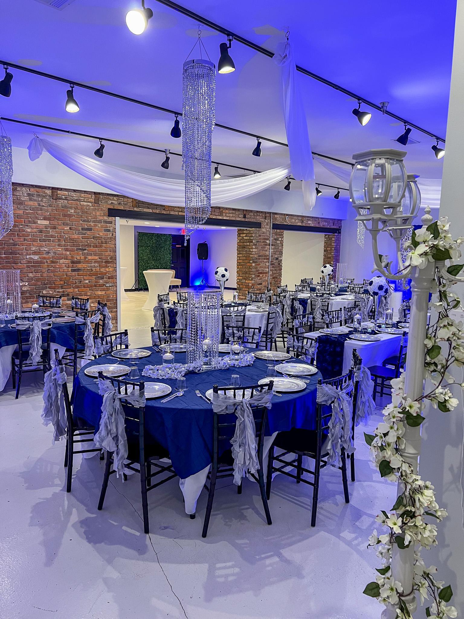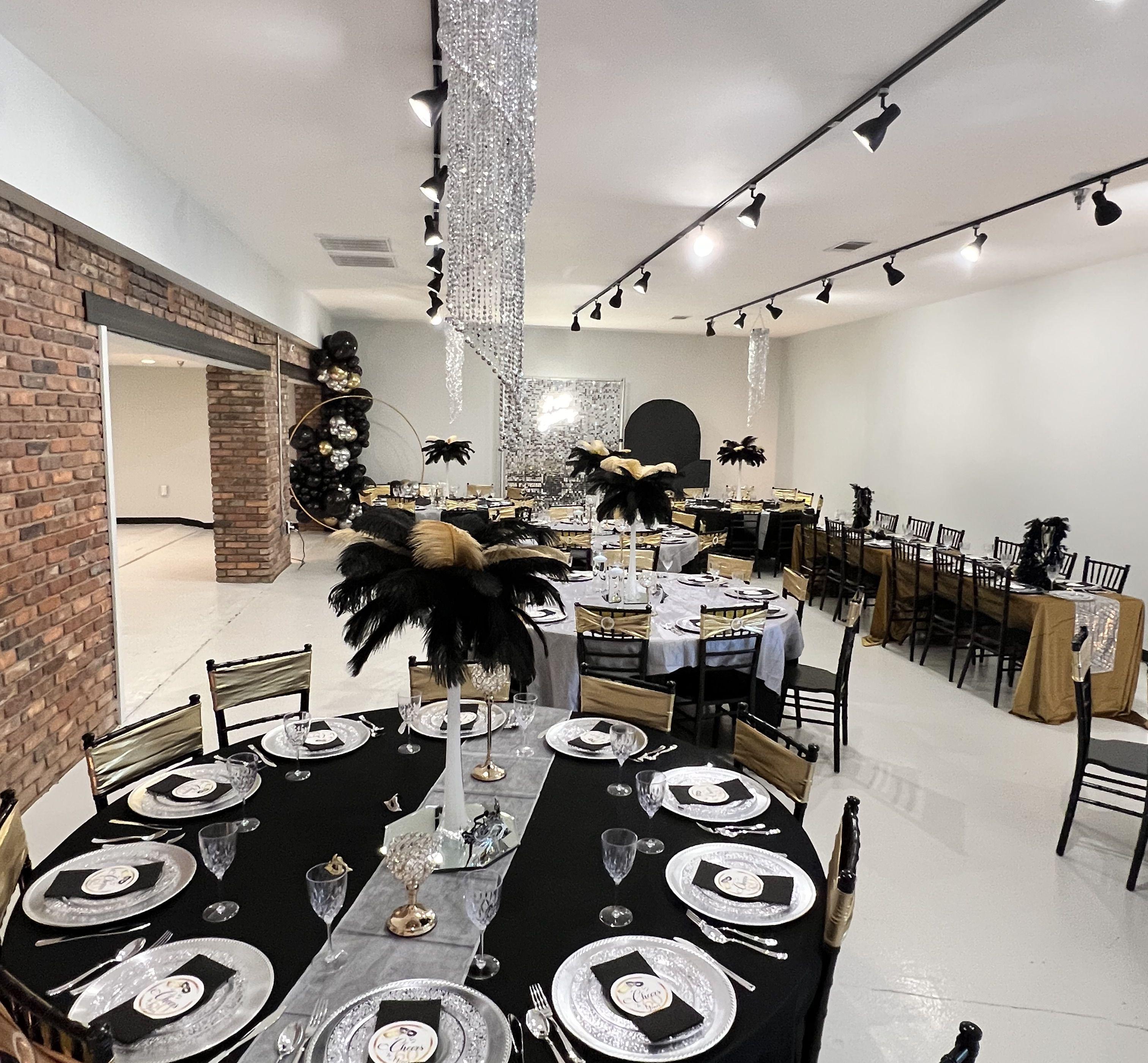 Tables (6 round and 3 rectangular) Table linen (Black) Table runners Chiavari chairs Wi-fi Up-lighting Bluetooth speaker Two (2) microphones Balloon garland Ceiling drapery Centerpieces Customized welcome signage Plates, drinkware and cutlery Charger plates Projector and screen One (1) pipe and drape backdrop Event coordinator Photographer DJ (5 hours) Security ADA bathroom Free onsite parking