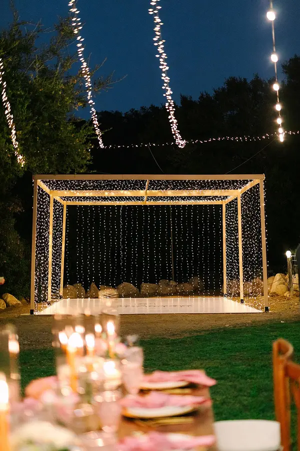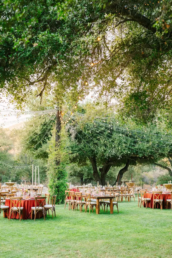 Welcome to our spacious reception area, where lush green grass invites you to under the canopy of century-old oak trees. As the sun sets, the atmosphere transforms with the warm glow of over 10,000 string lights delicately illuminating the branches above and creating a magical ambiance throughout the entire site. Come and enjoy the serene surroundings, where every detail is designed to make your event extraordinary.