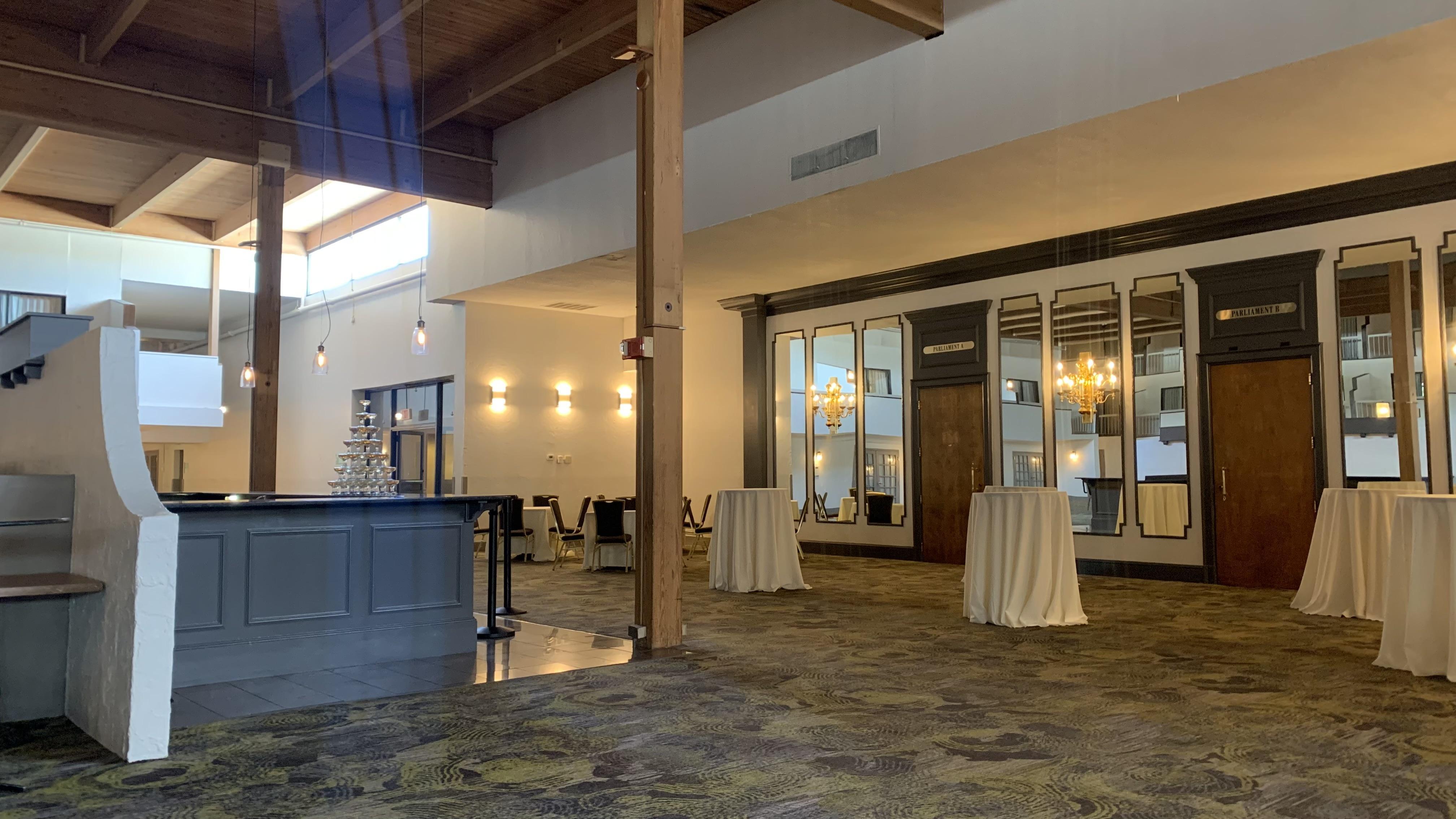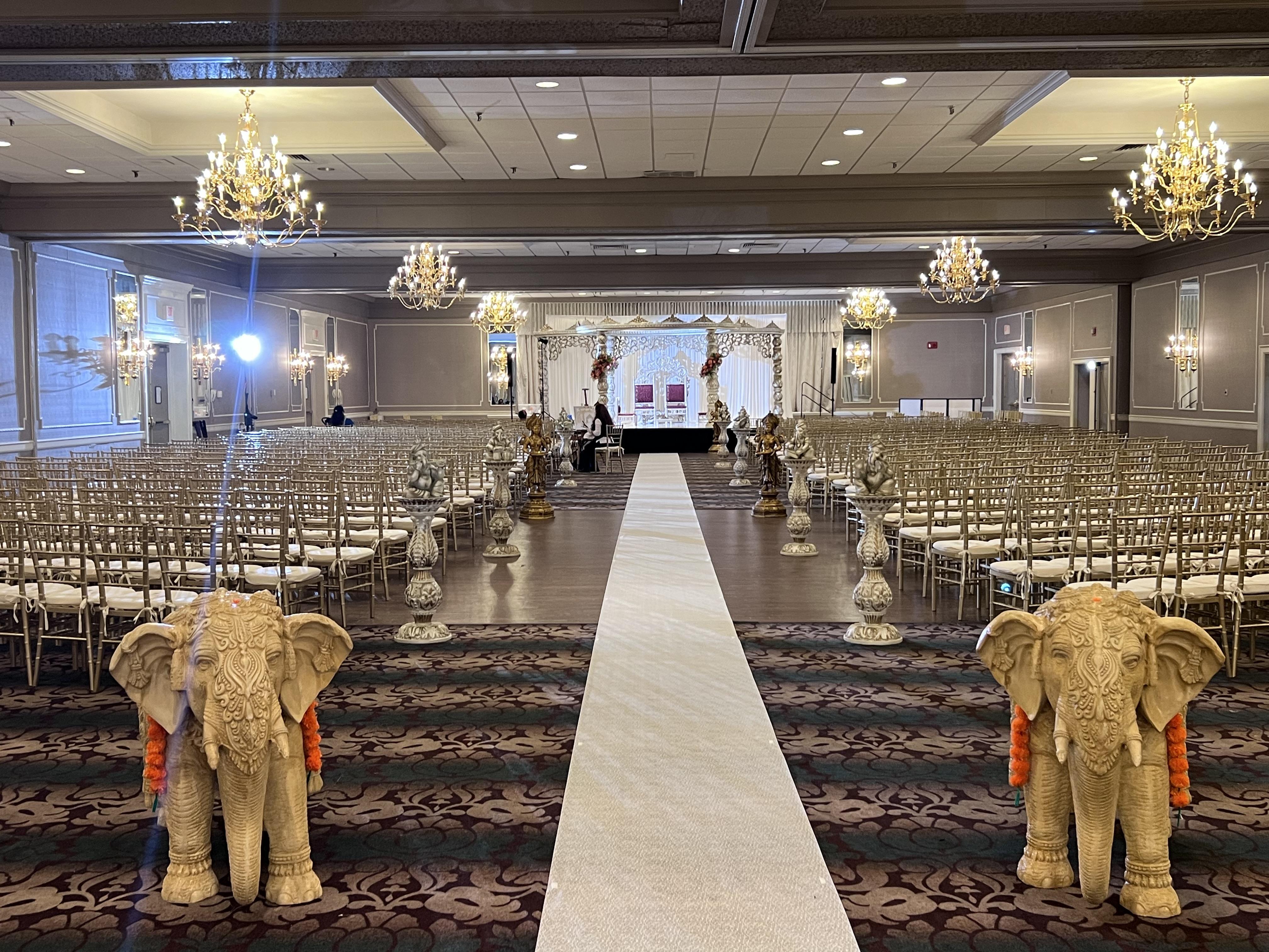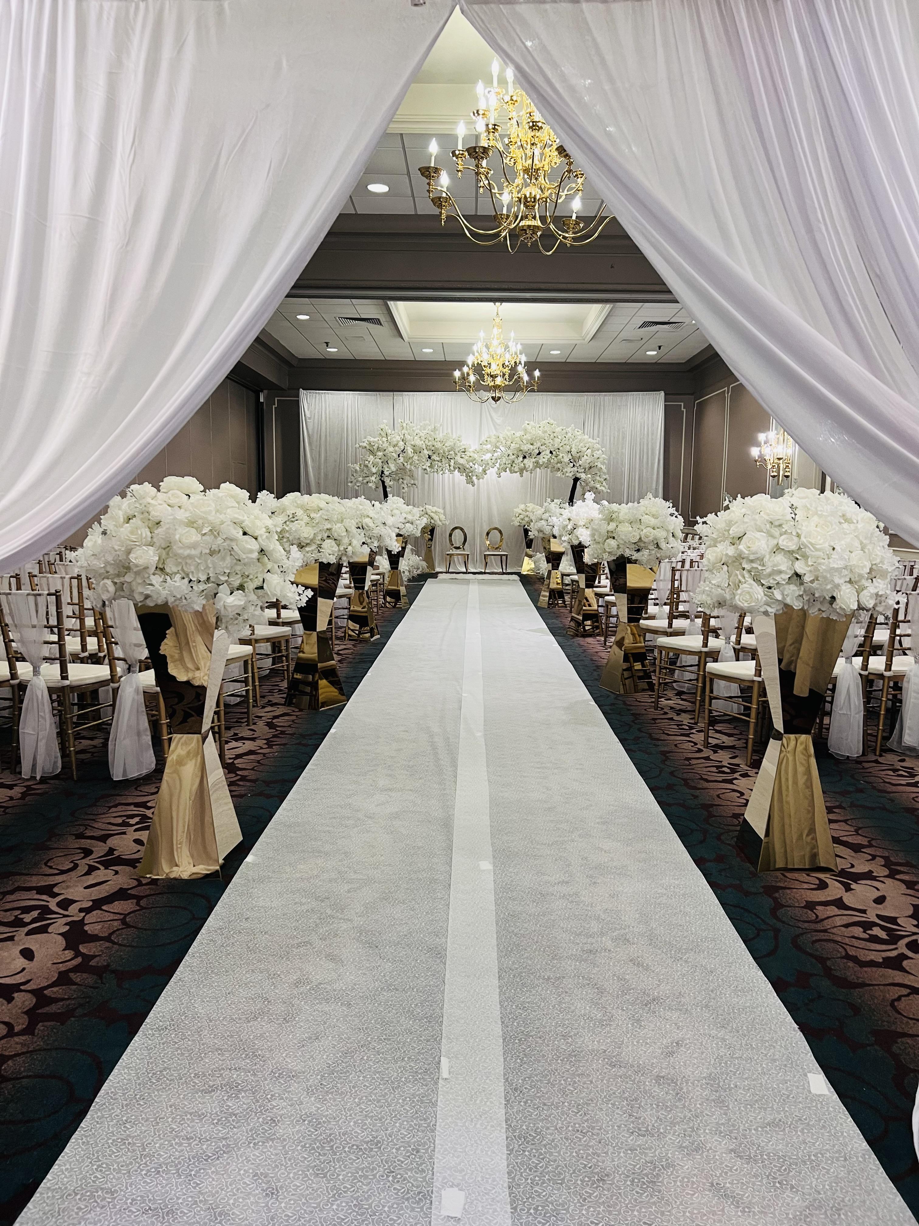 Step into our ballroom, where timeless sophistication meets contemporary charm for your indoor wedding ceremony. The spacious, elegantly adorned setting is bathed in soft, natural light filtering through expansive windows. Candelabra chandeliers hang gracefully overhead, casting a warm glow on the meticulously arranged seating for your guests. The neutral color palette provides a canvas for personalization, allowing your wedding theme to shine.
