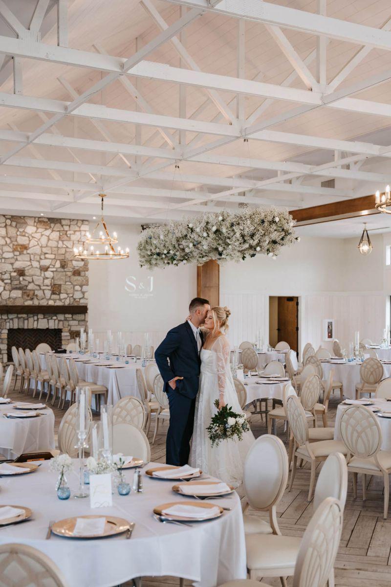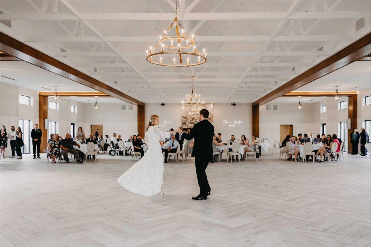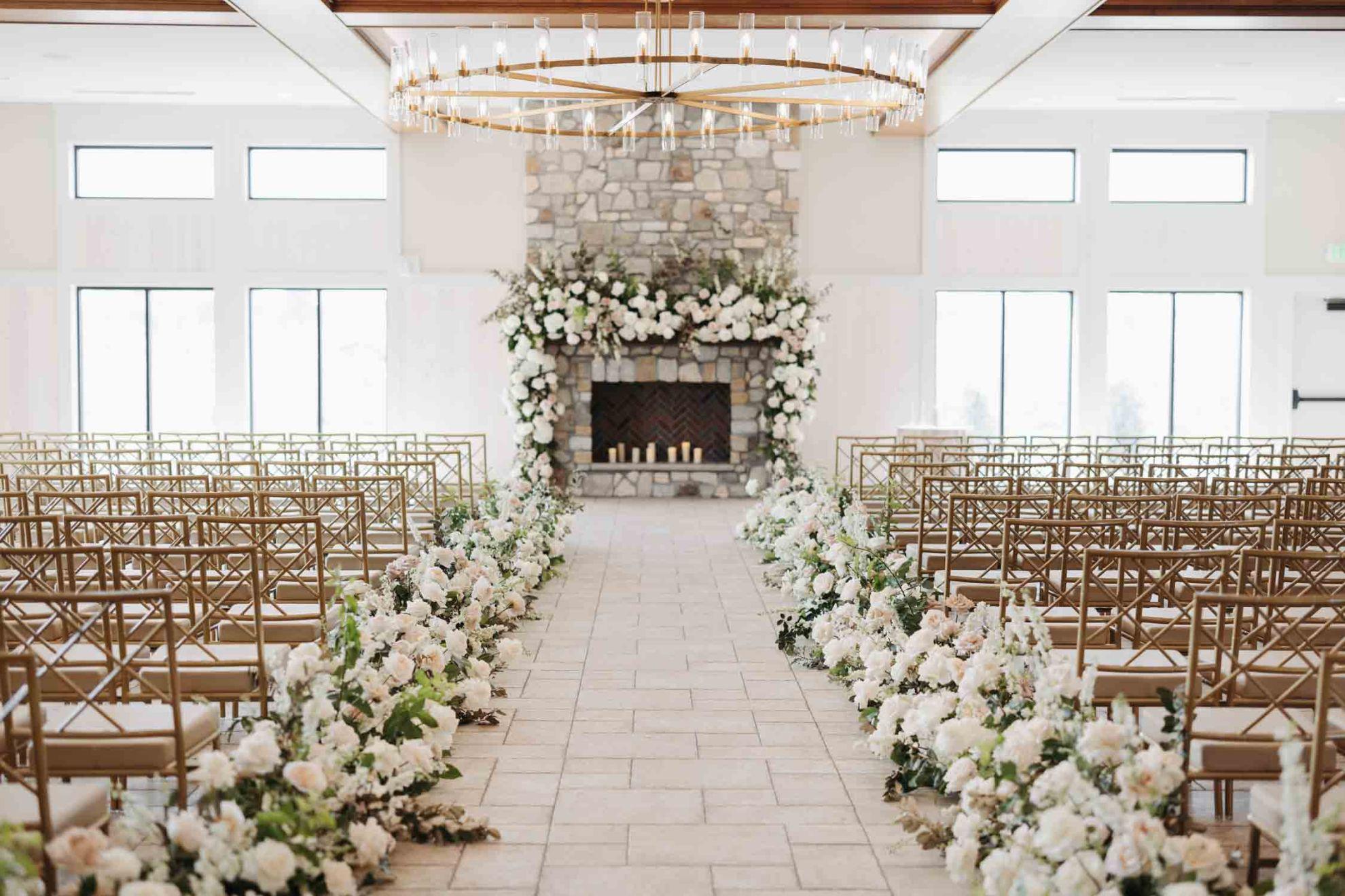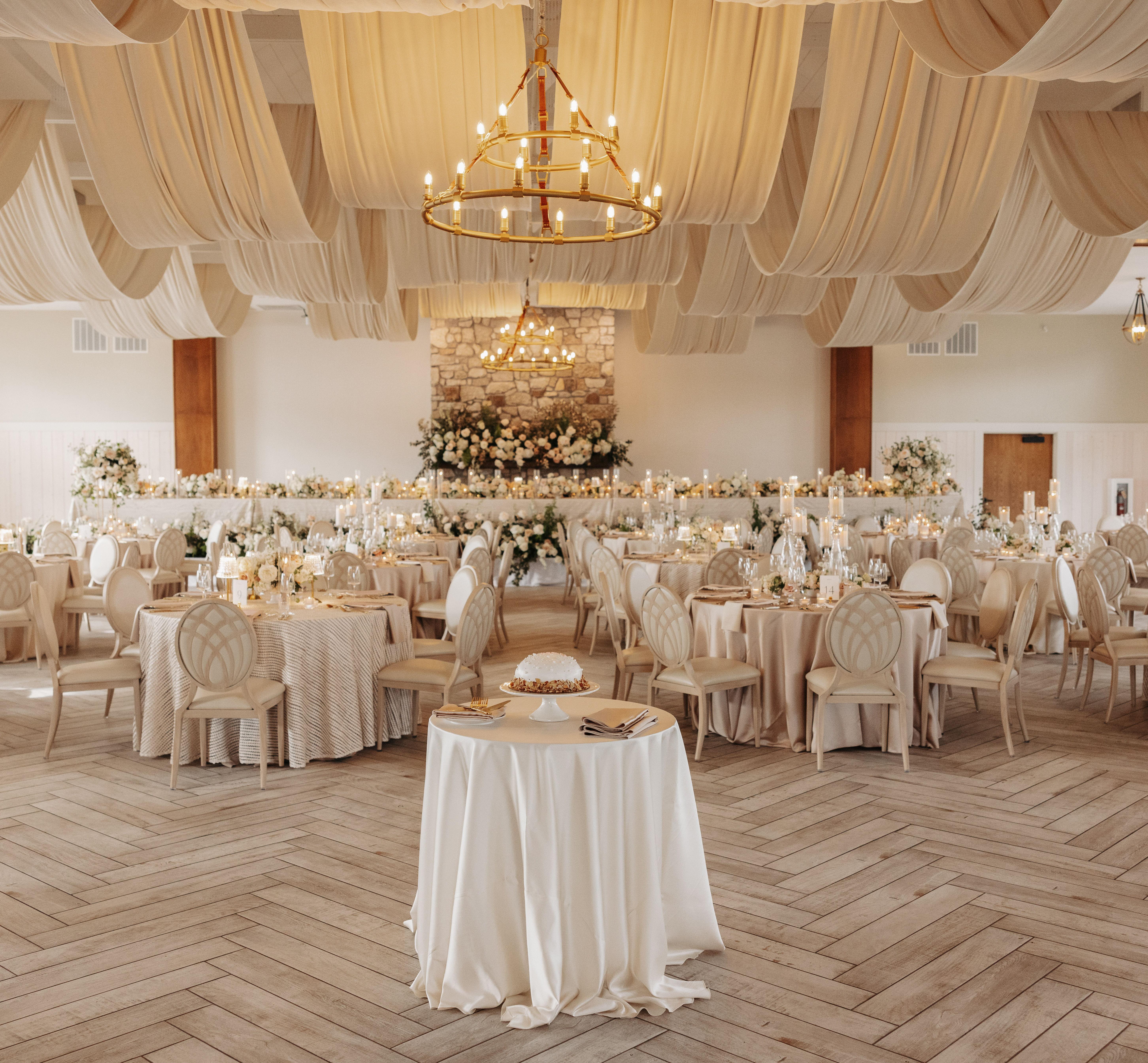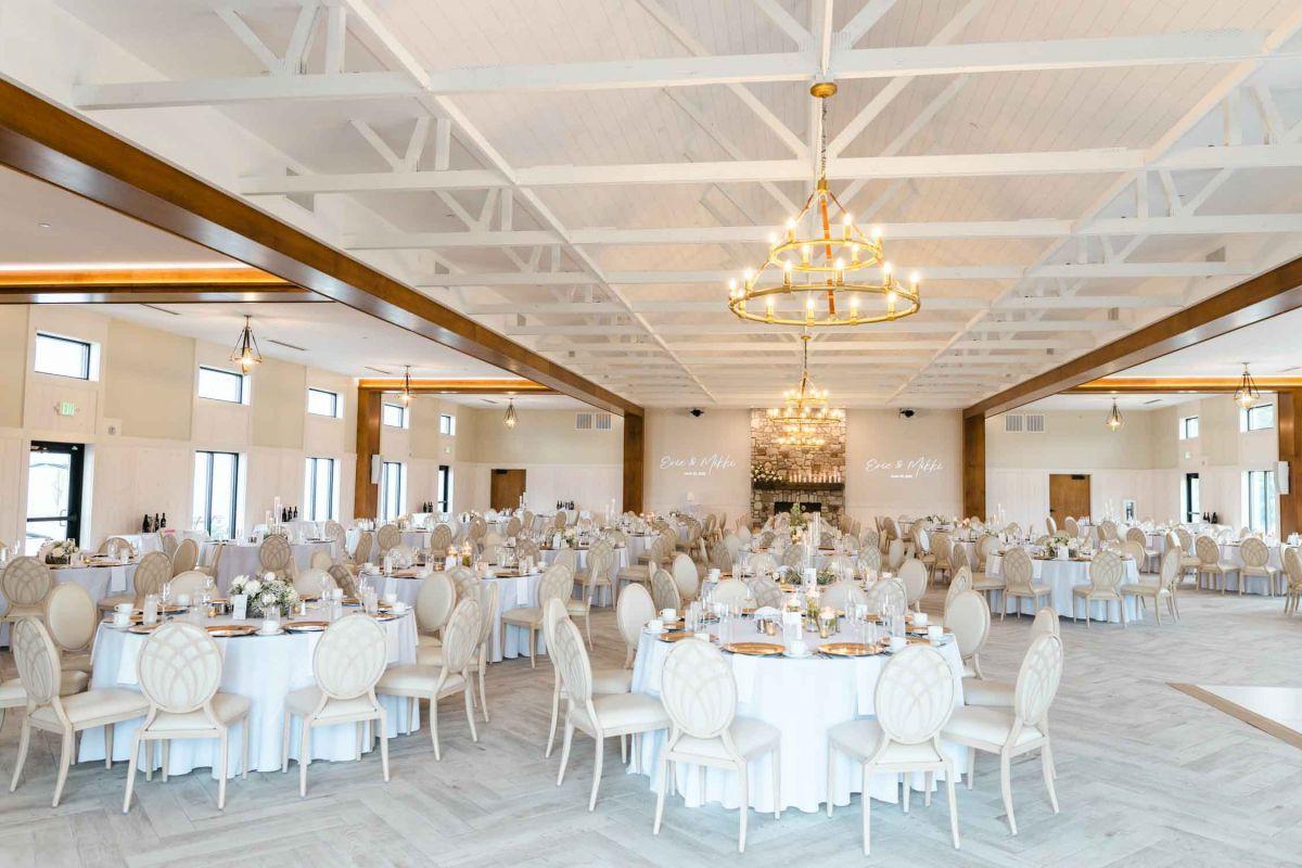 The main ballroom is elegant and gorgeous. It has a vaulted ceiling with two-tiered chandeliers as well as a large fireplace with floor to ceiling stone, giving the room the perfect touch of opulence. Large black metal windows with white trim allow lots of natural light to grace the entire ballroom while also providing a contemporary feel.