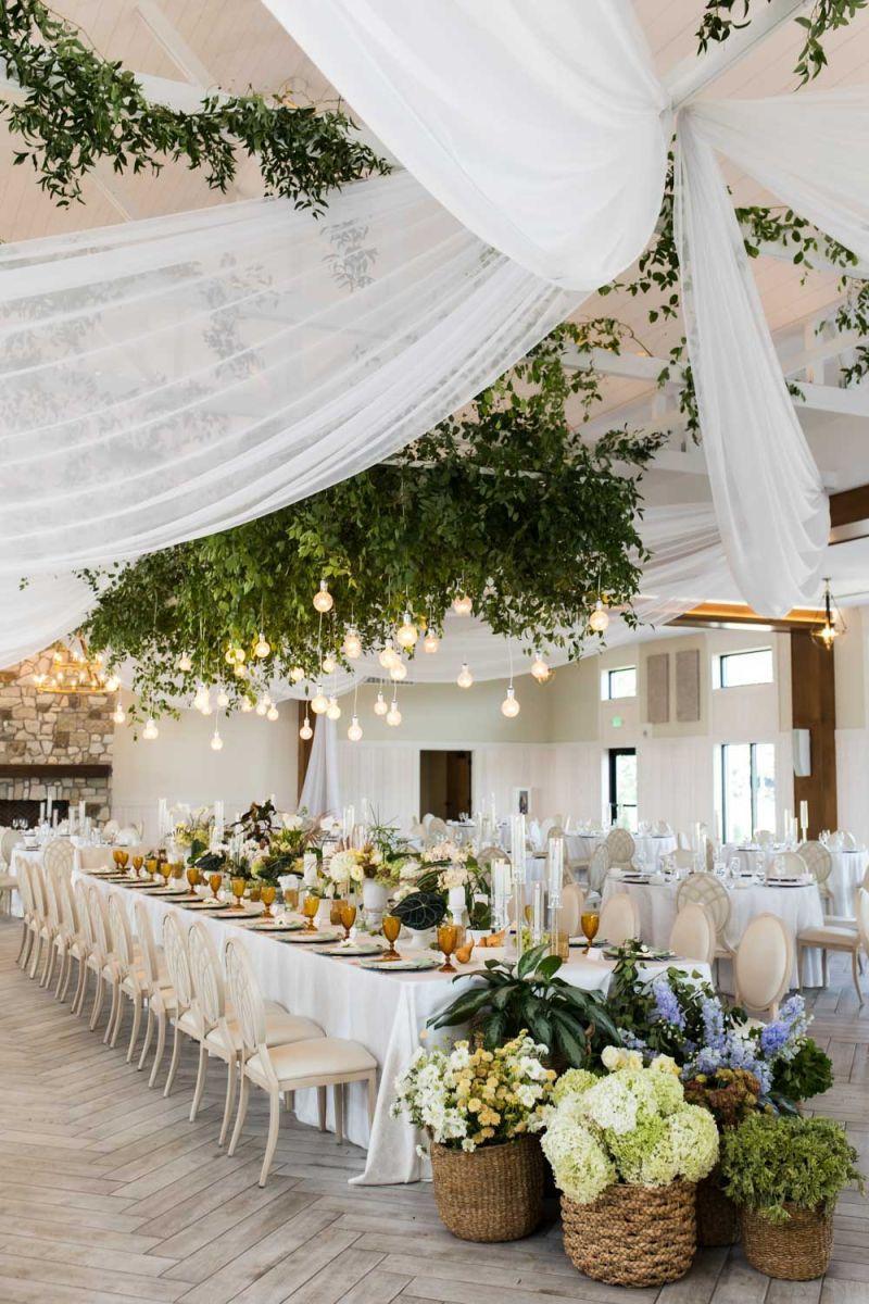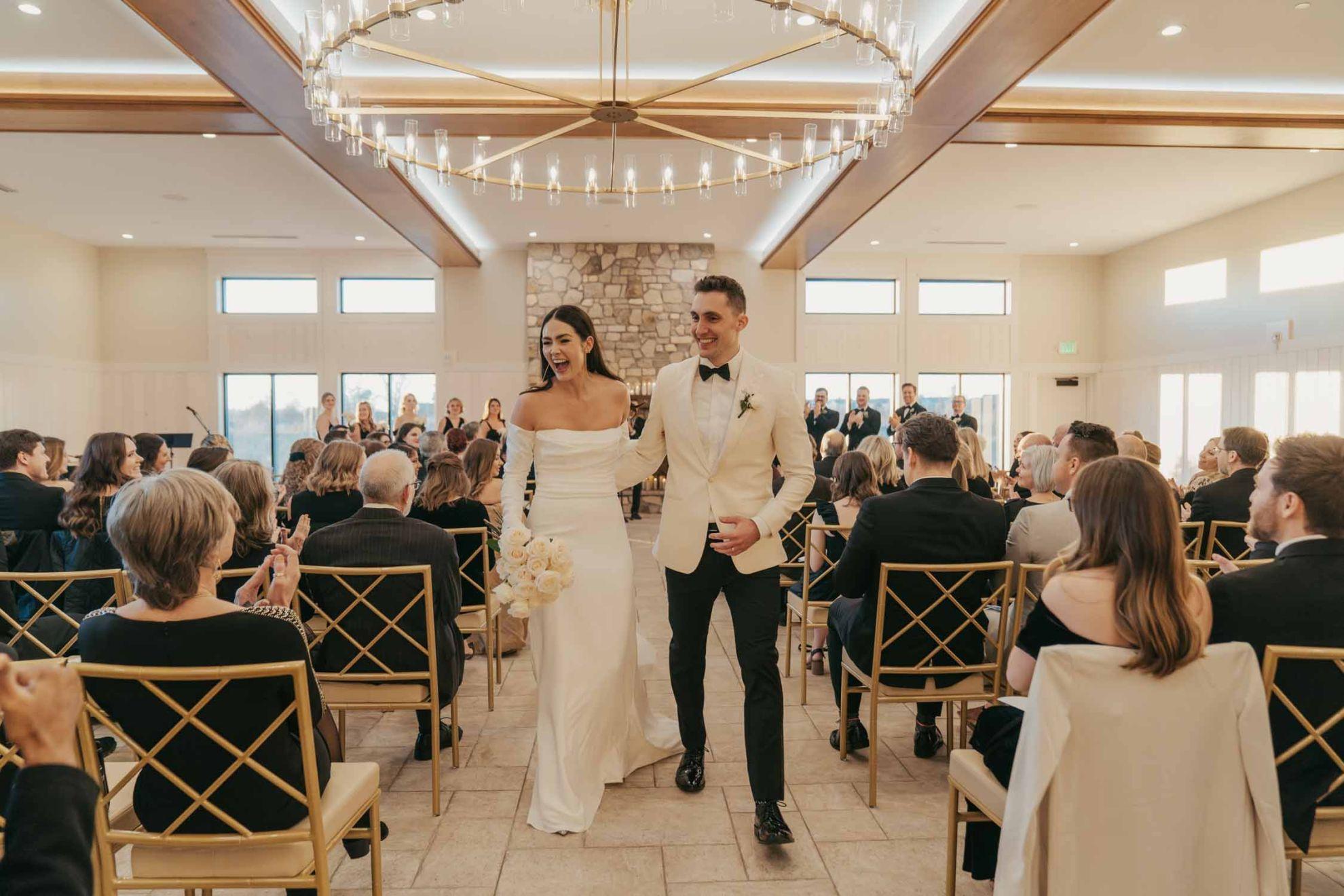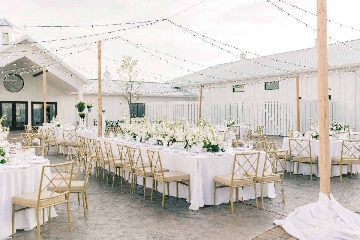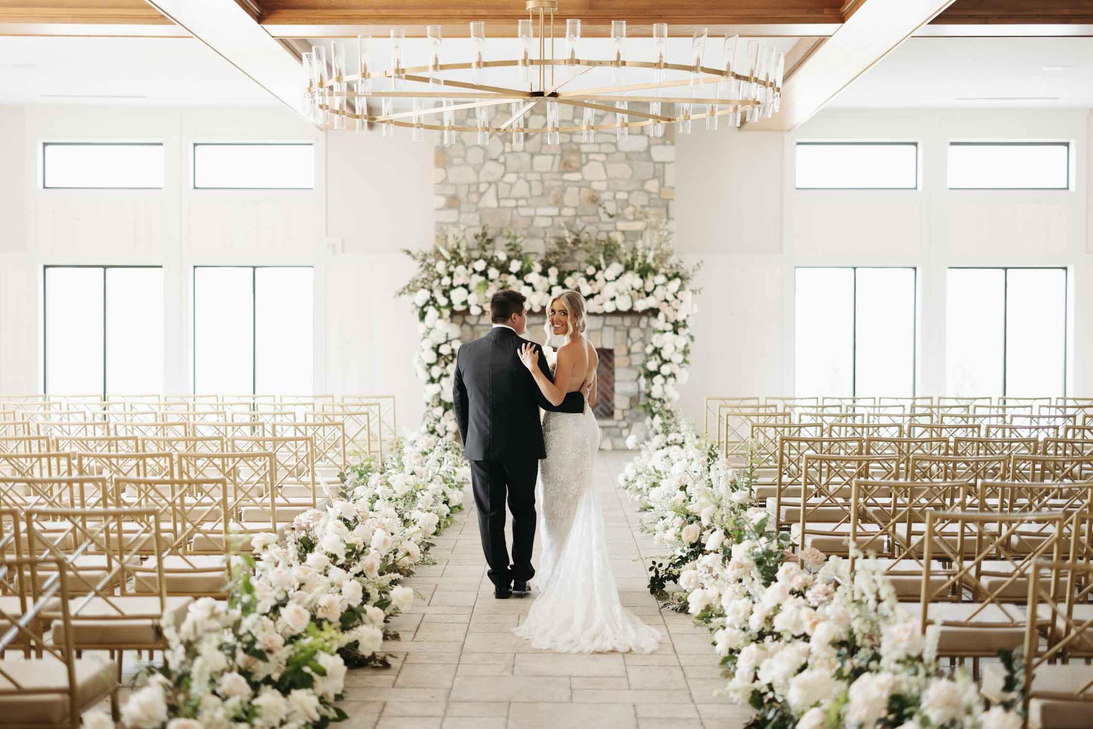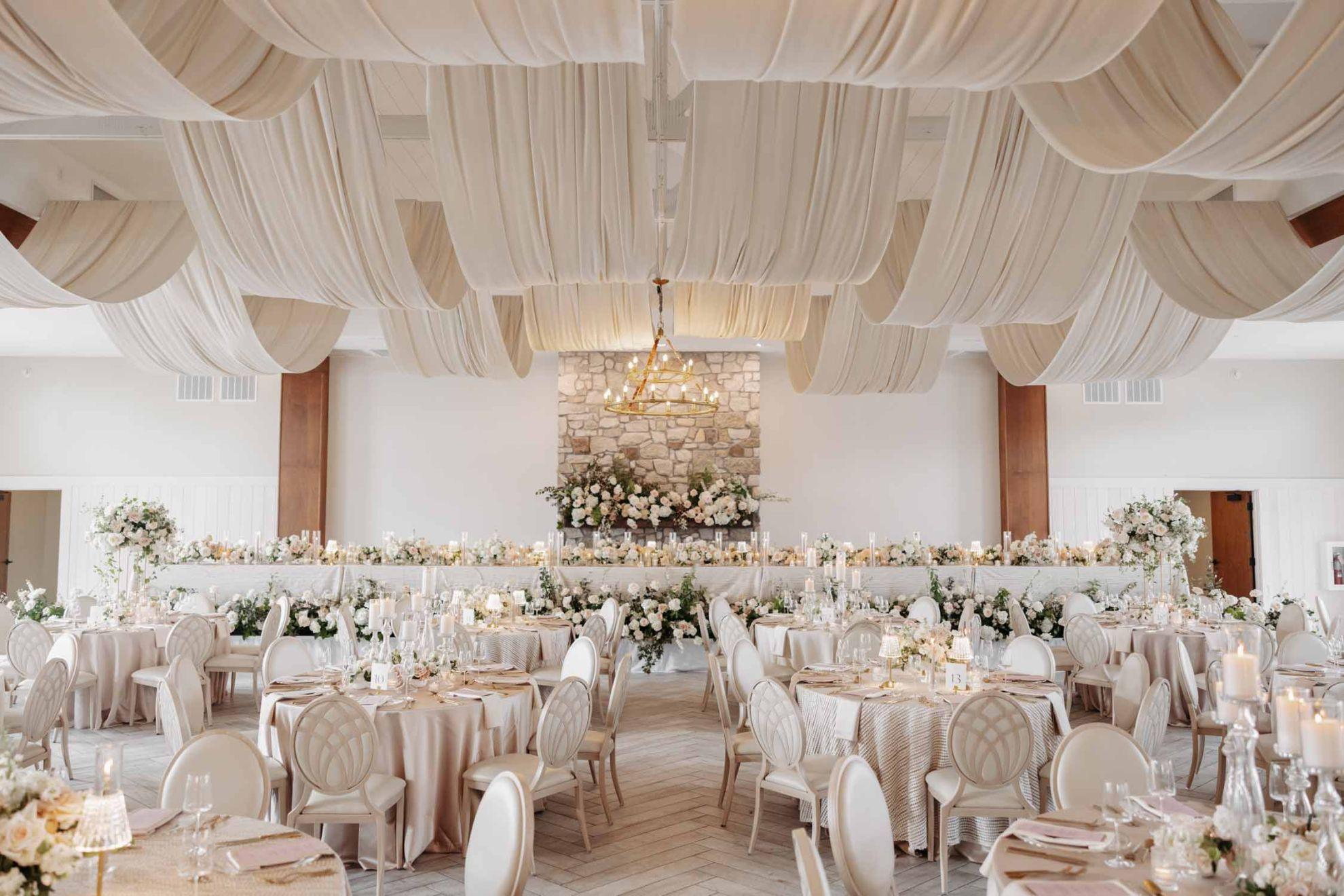 The main ballroom is elegant and gorgeous. It has a vaulted ceiling with two-tiered chandeliers as well as a large fireplace with floor to ceiling stone, giving the room the perfect touch of opulence. Large black metal windows with white trim allow lots of natural light to grace the entire ballroom while also providing a contemporary feel.