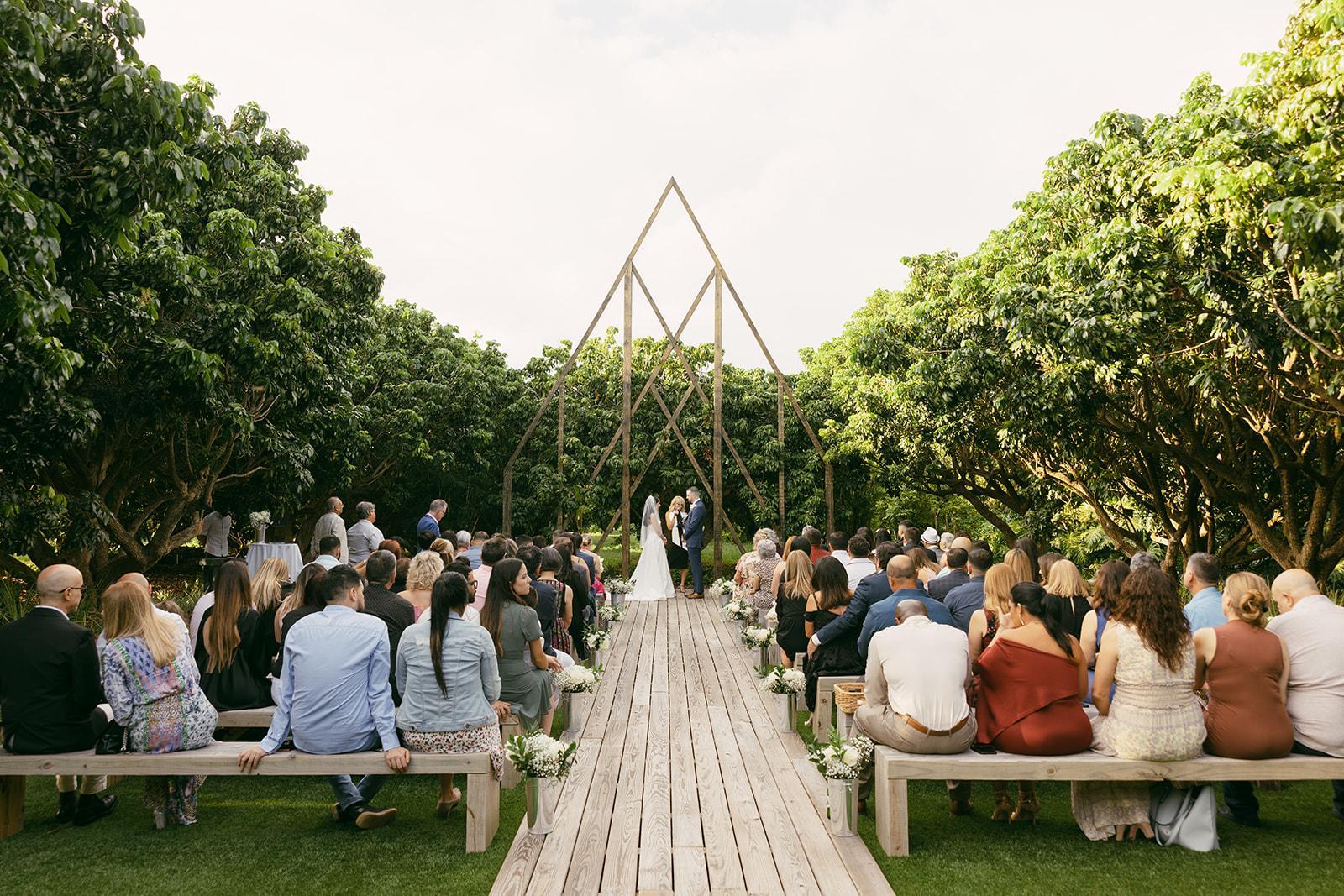Enshrouded by a grove of old Longan trees giving off the sweet and subtle aroma of jasmine, the focal point of The Glade at Estrella Estate is its rustic, handcrafted wooden aisle and impressive angular arch. The aisle is aligned by our own handcrafted benches which allows seating for all guests, providing an outstanding view of your special and intimate ceremony.